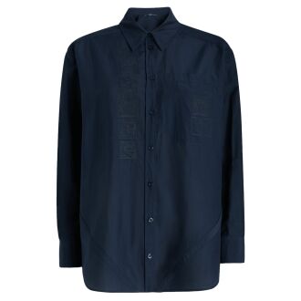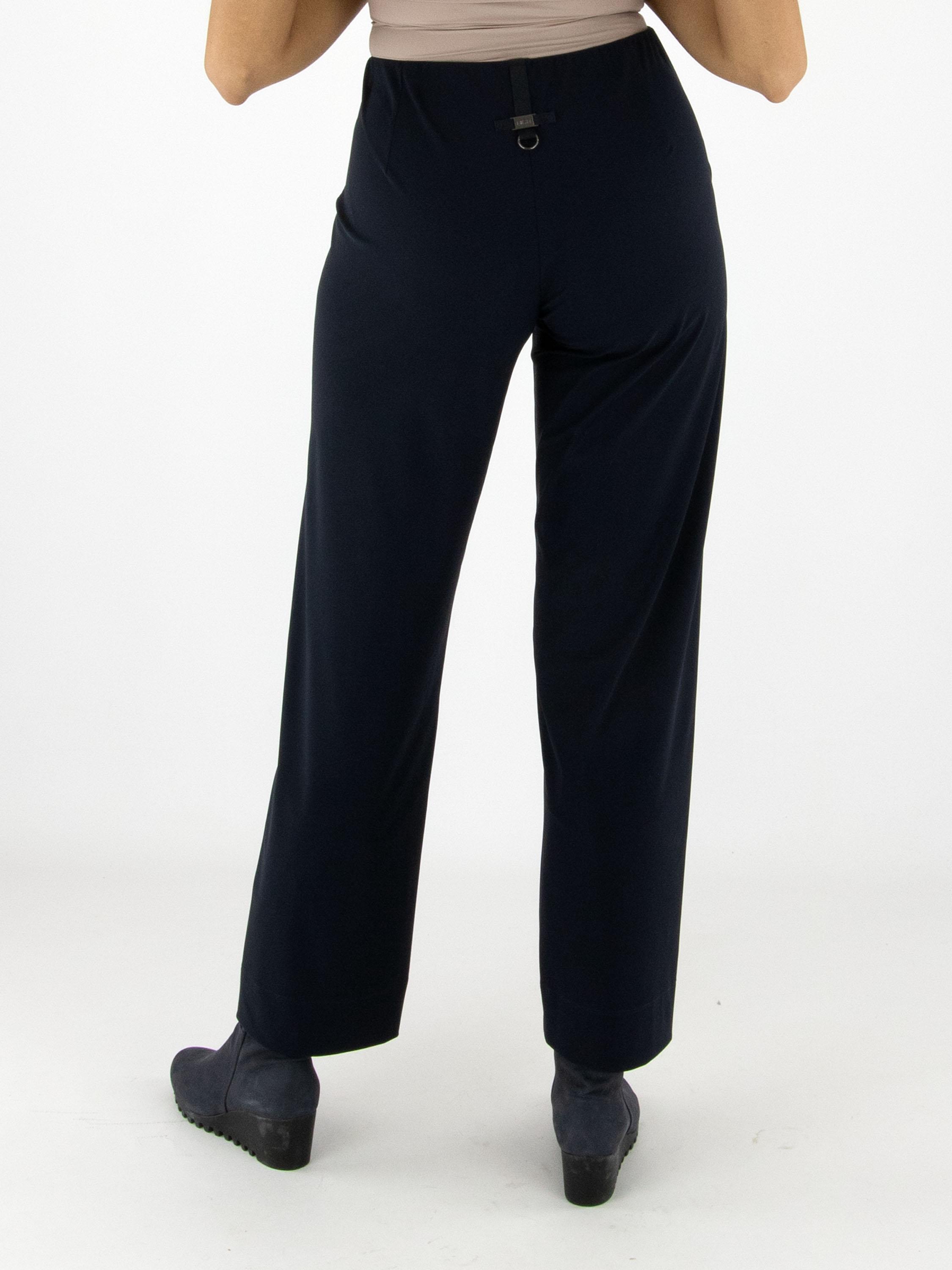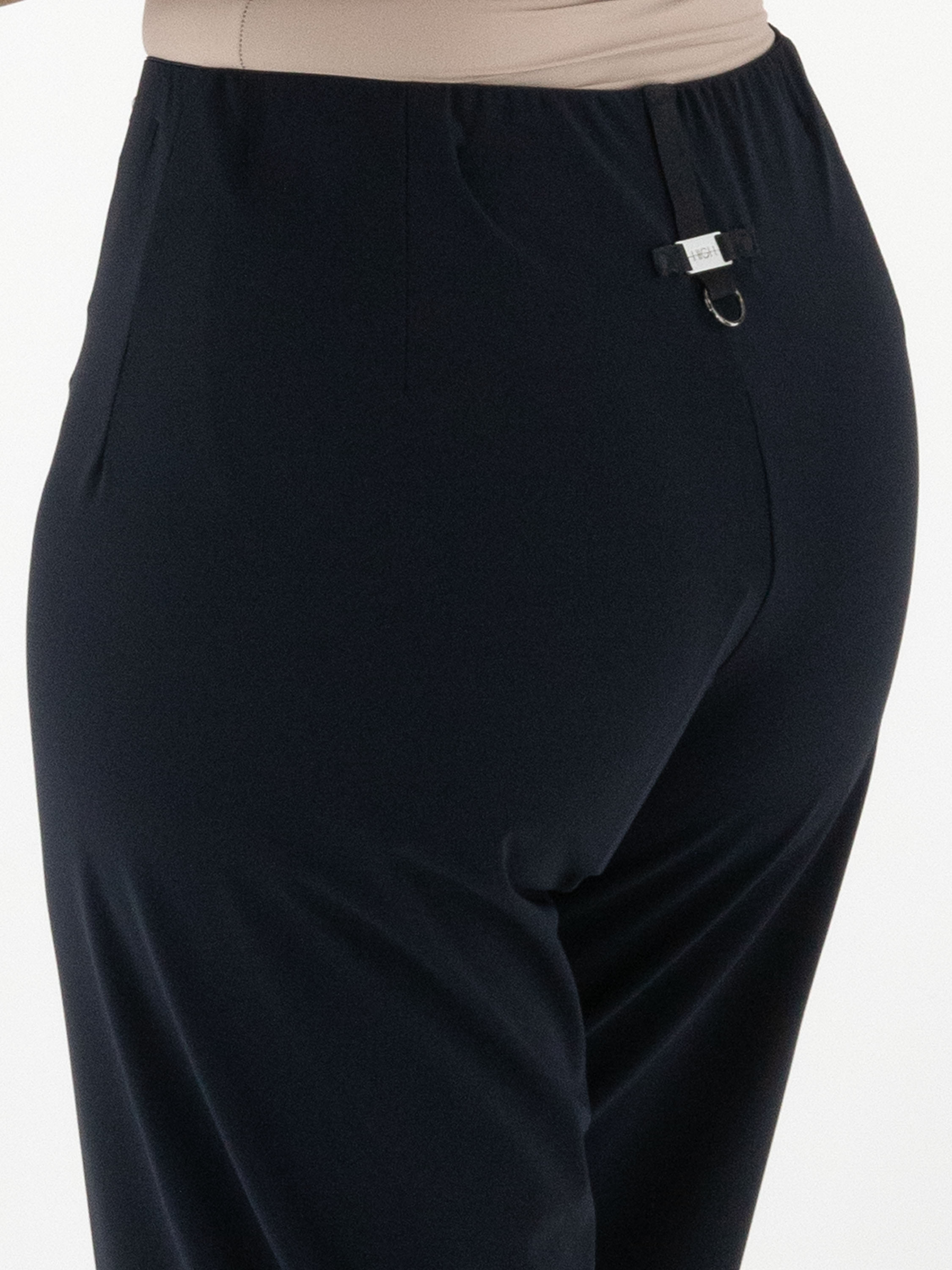 Pantalon de la marque High en bleu marine. La taille est élastiquée. À l’avant, au niveau de la taille, se trouve une boucle décorative de couleur nickel avec deux clous. Ce pantalon peut être lavé à 30 degrés.