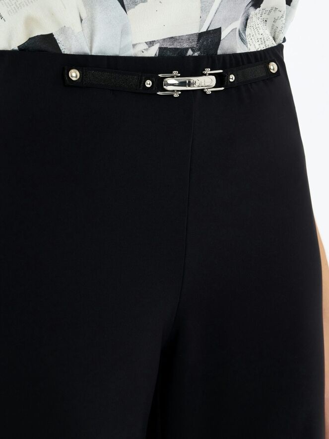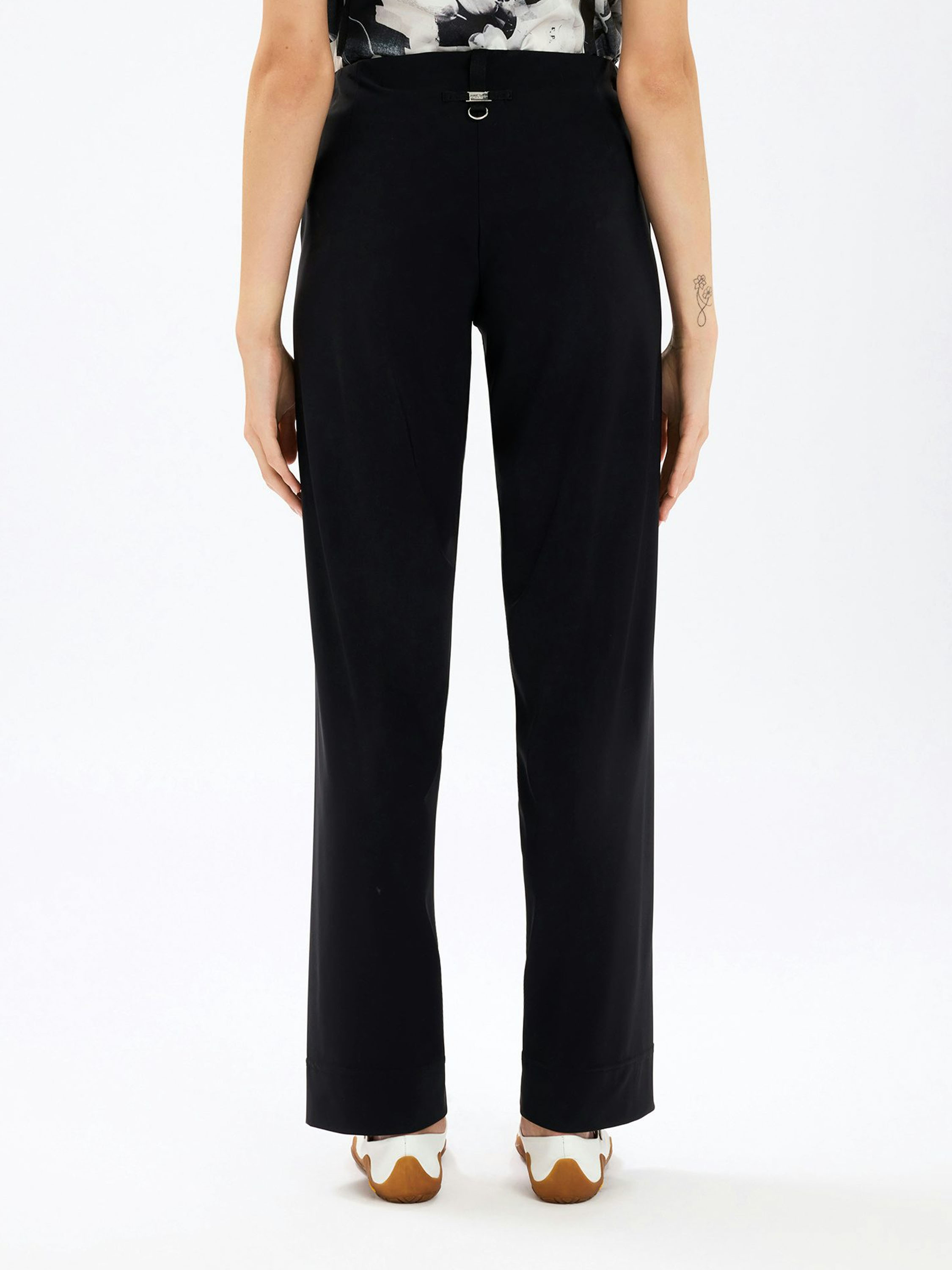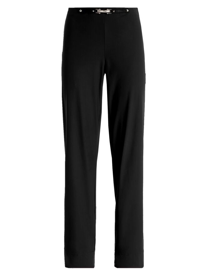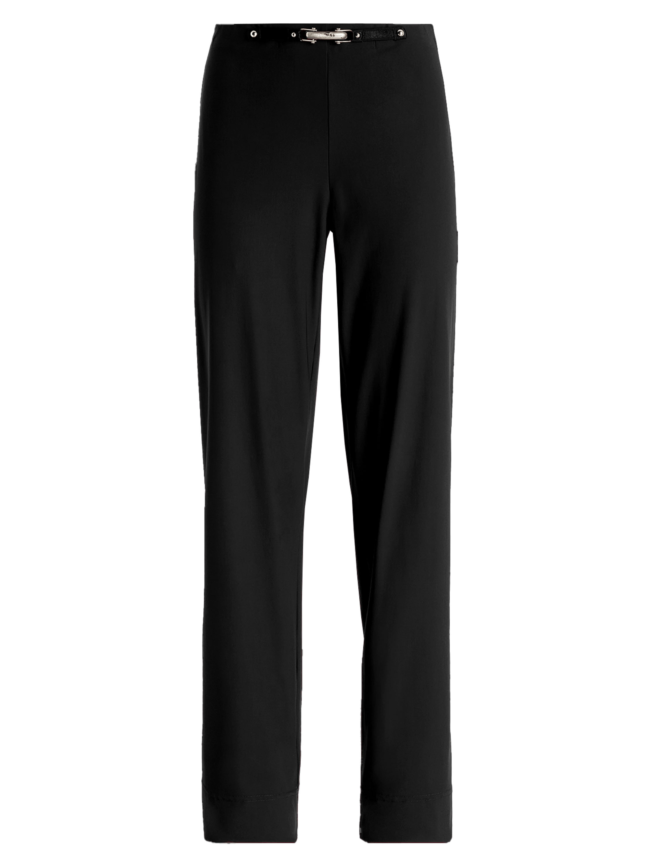 Pantalon de High en noir. La ceinture élastique est ornée à l’avant d’un élément décoratif allongé argenté, apportant une touche raffinée. Les jambes droites créent une silhouette élégante et intemporelle. Ce pantalon de créateur exclusif peut être lavé à 30 degrés.