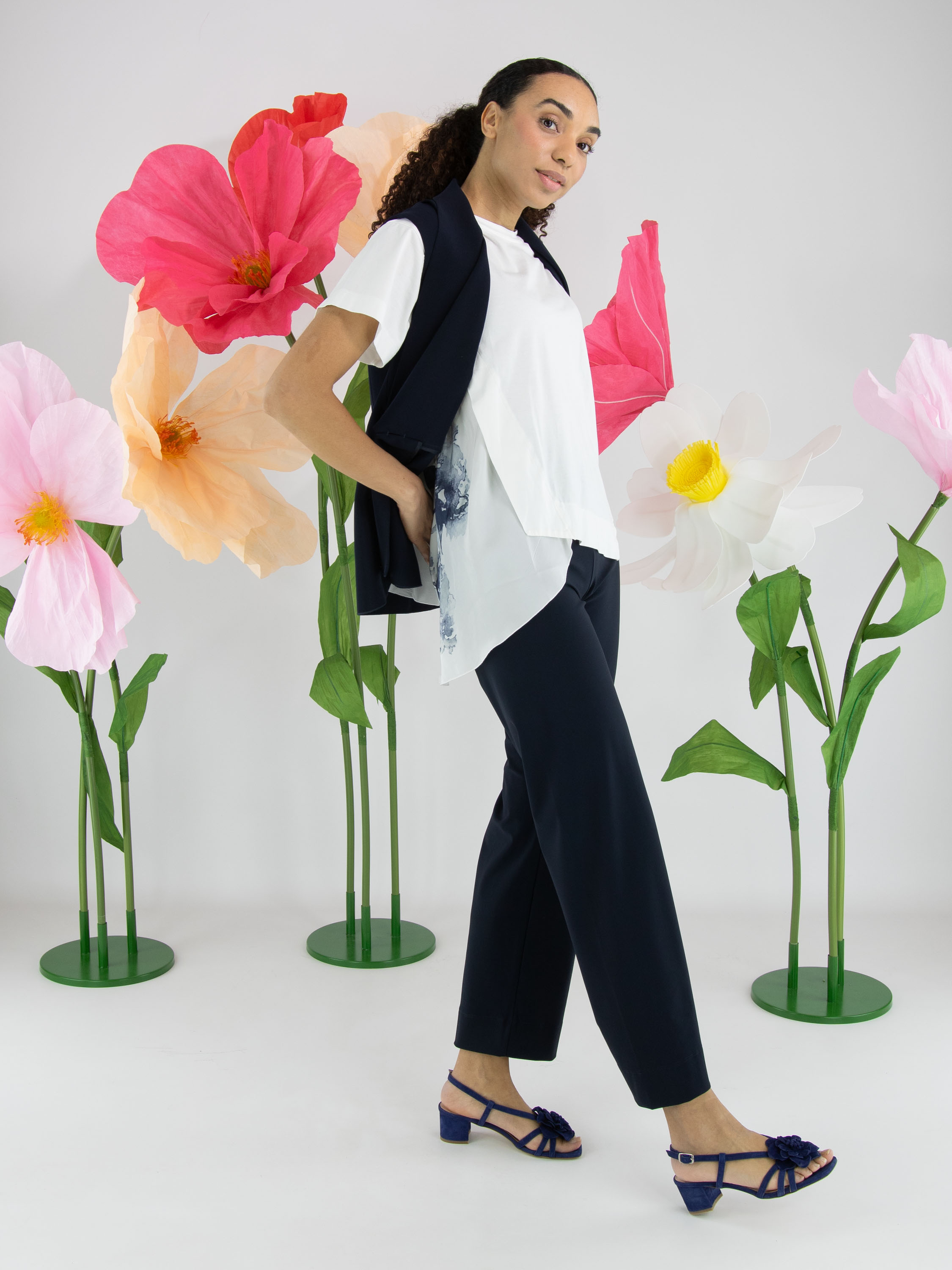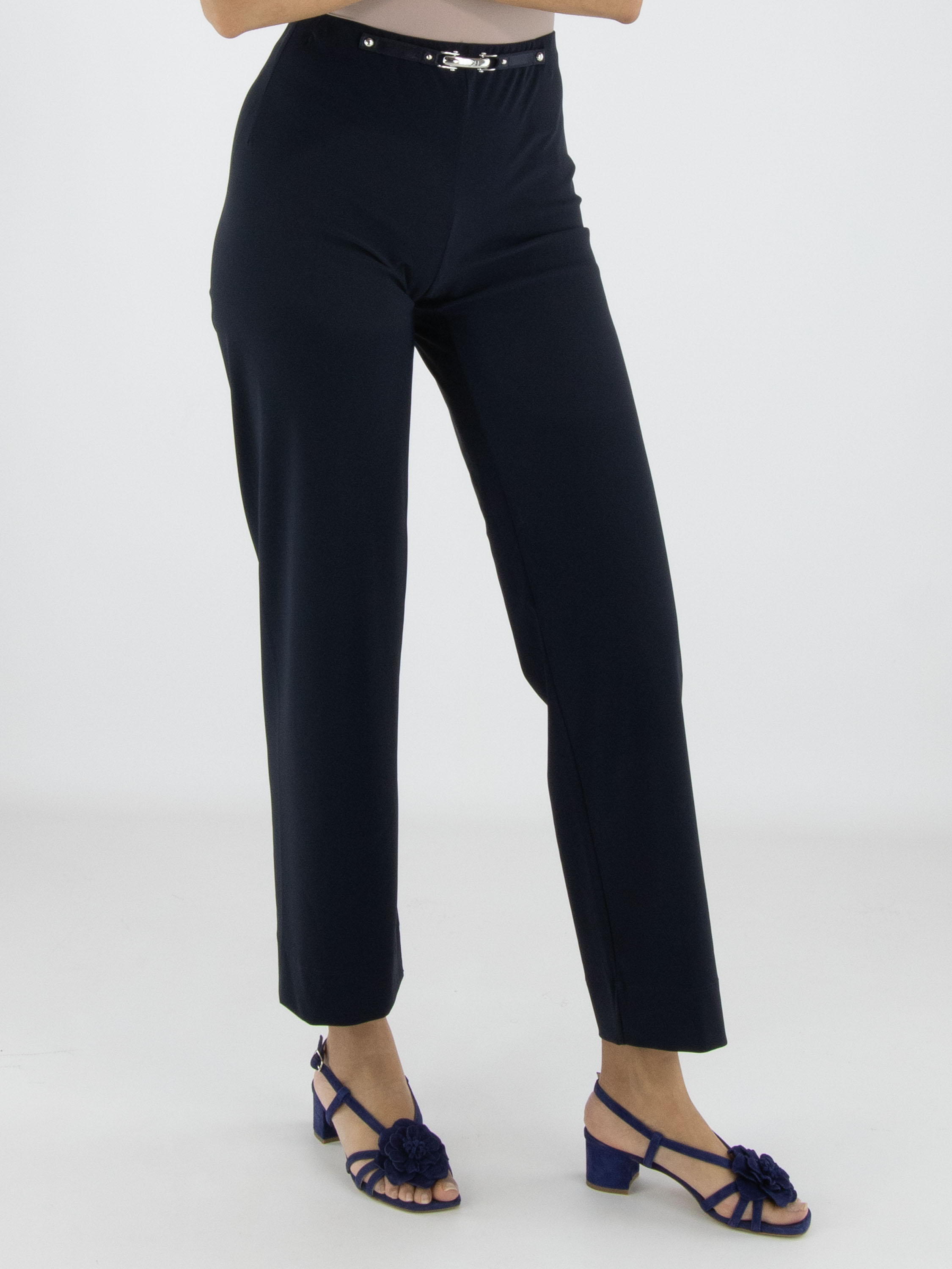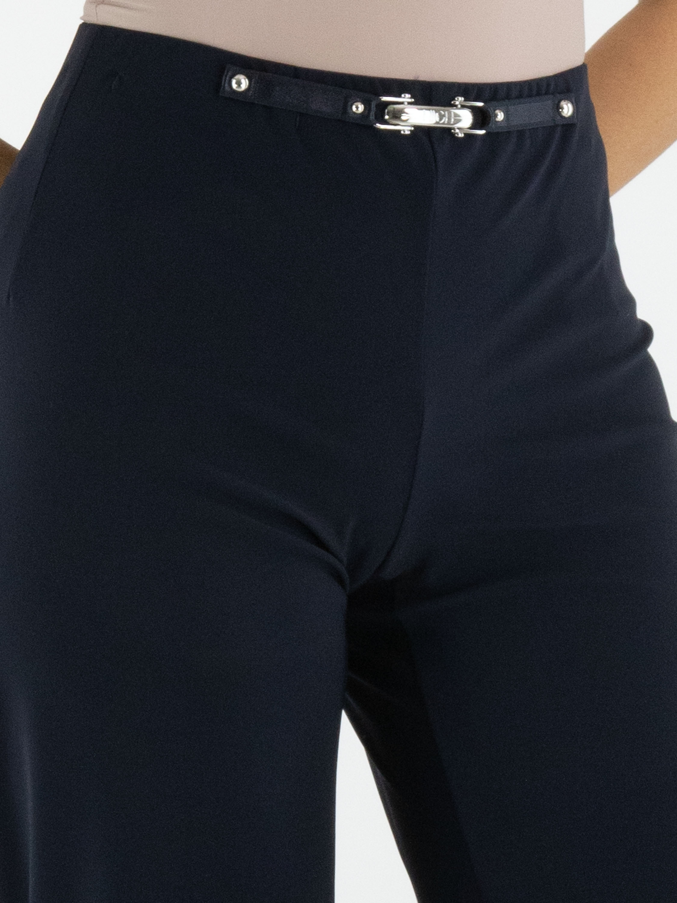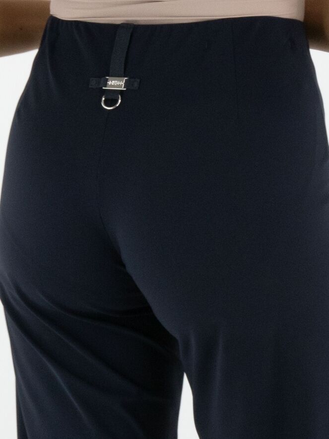 Pantalon de High en bleu marine. La ceinture élastique est ornée à l’avant d’un détail allongé argenté décoratif, apportant une touche subtile et élégante. Les jambes droites offrent une silhouette intemporelle et raffinée. Ce pantalon de créateur exclusif peut être lavé à 30 degrés.