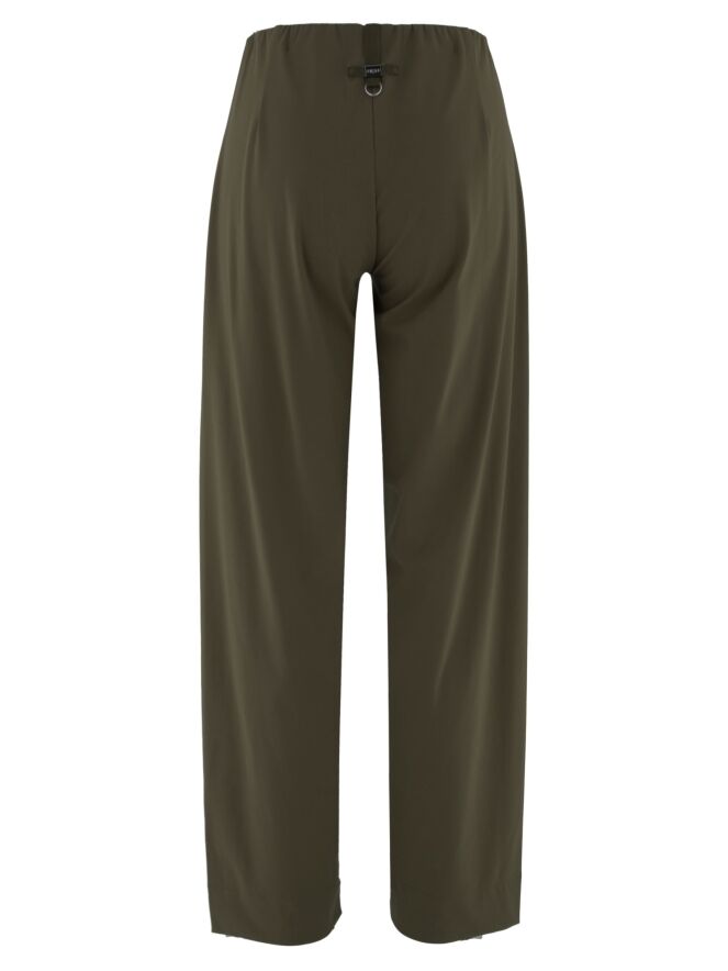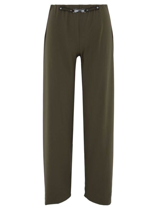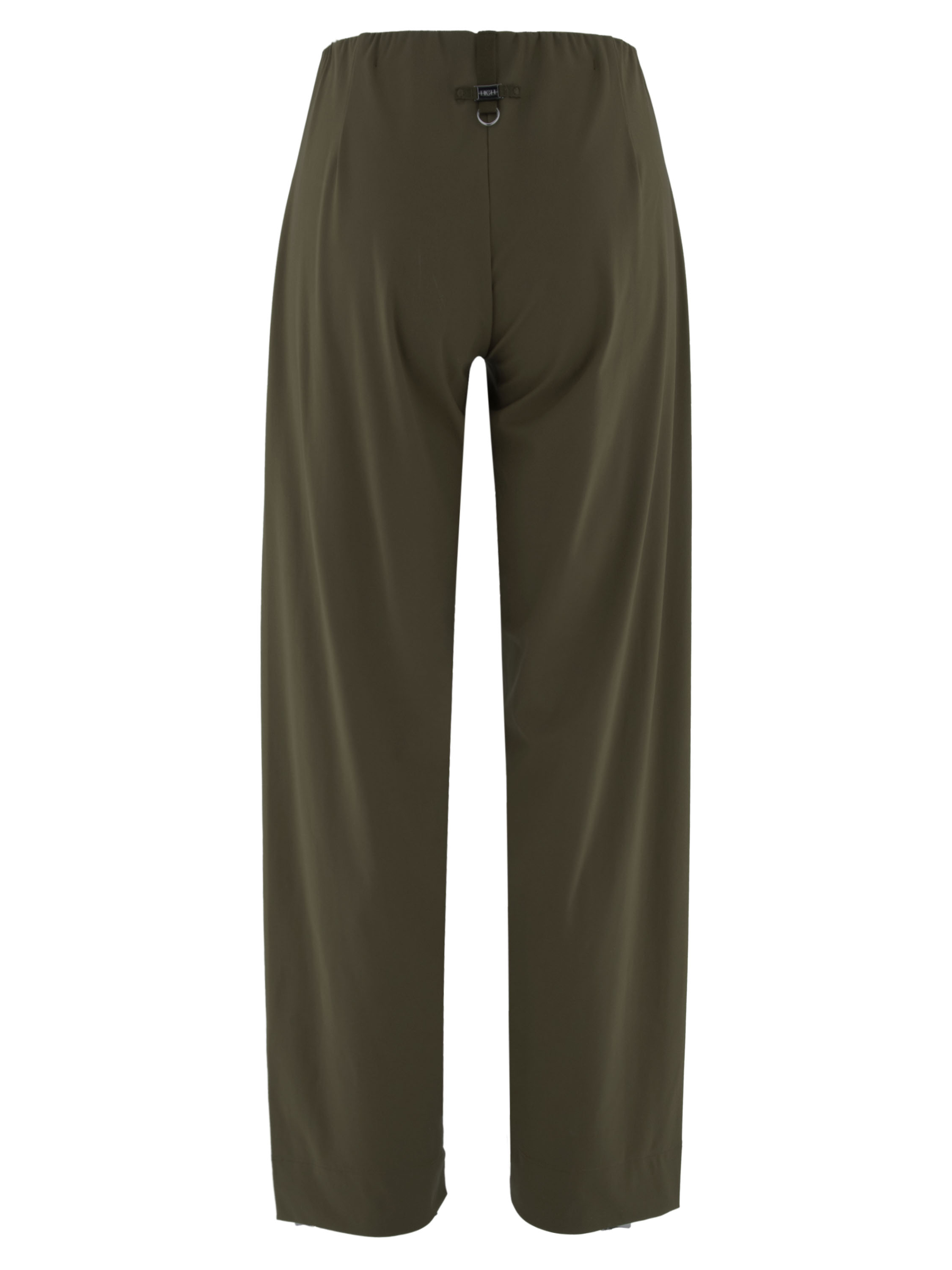 Un pantalon de High en vert olive. La taille est dotée d’une ceinture élastique ornée à l’avant d’un élément décoratif argenté allongé. Les jambes sont droites et le pantalon peut être lavé à 30 degrés.