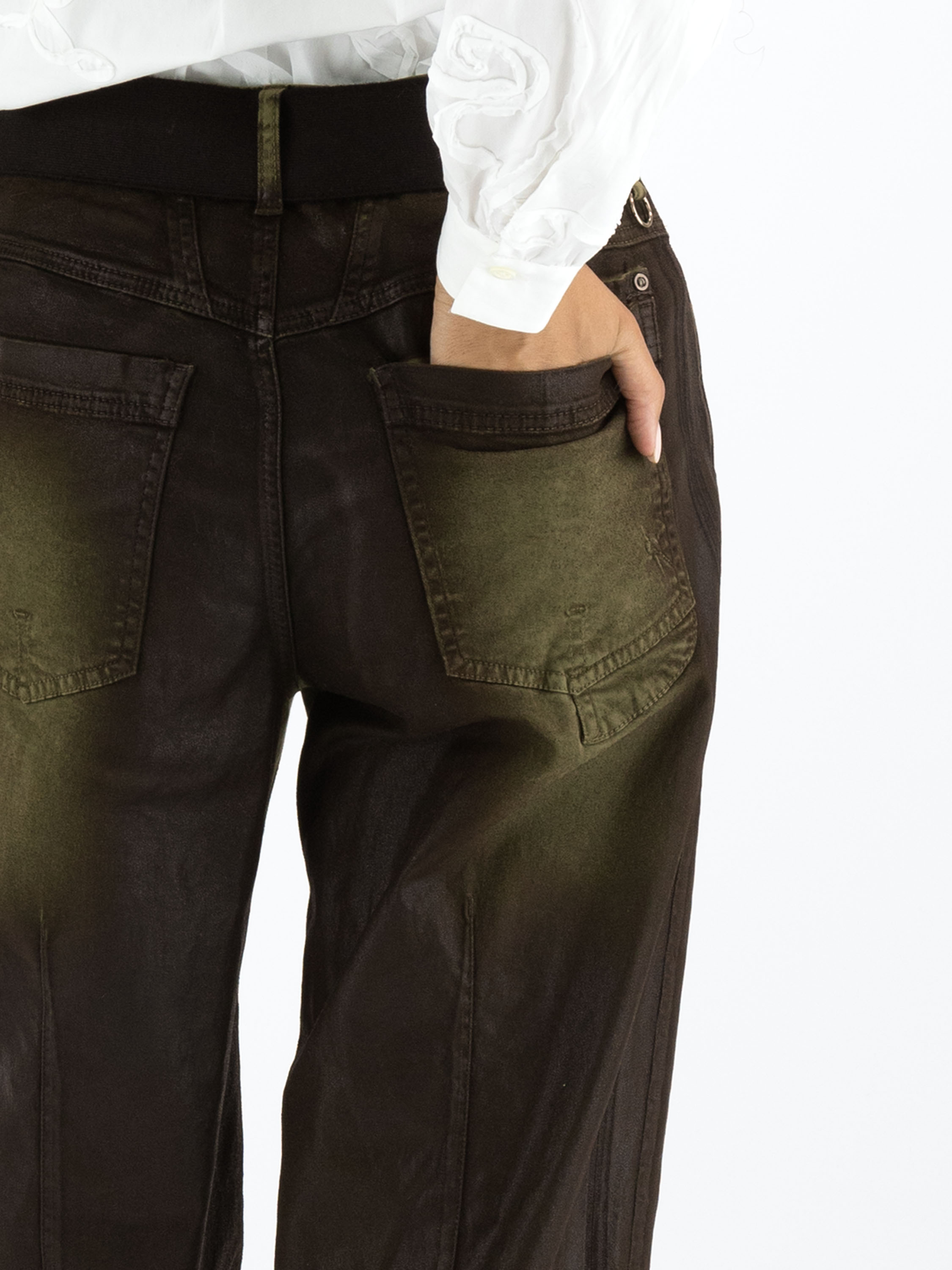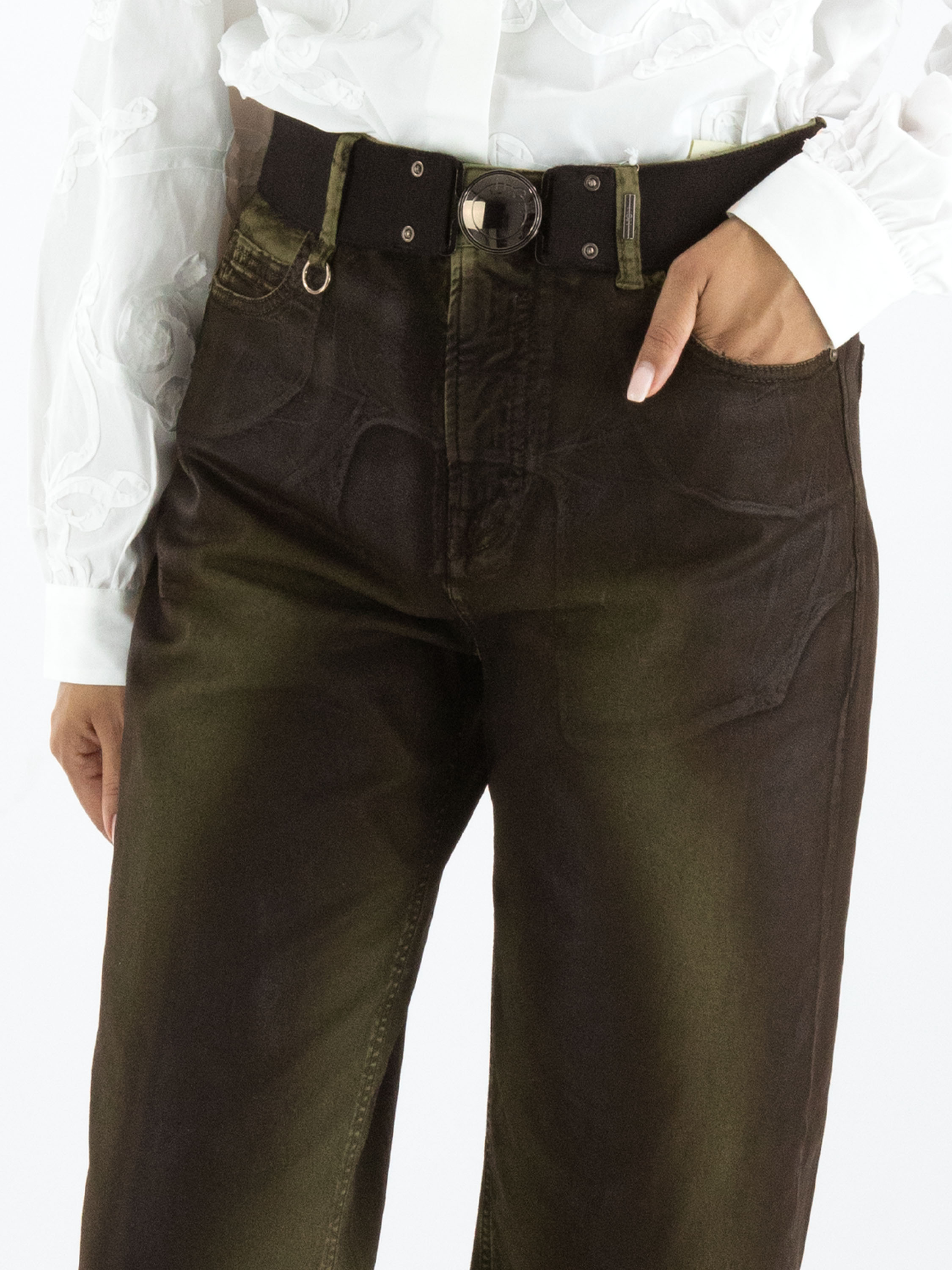 Un jean luxueux ciré avec un effet dégradé dû au lavage, dans plusieurs nuances de kaki. À la taille, une ceinture élastique noire avec une boucle ronde de couleur nickel. Le jean est de style 5 poches et peut être lavé à la main.