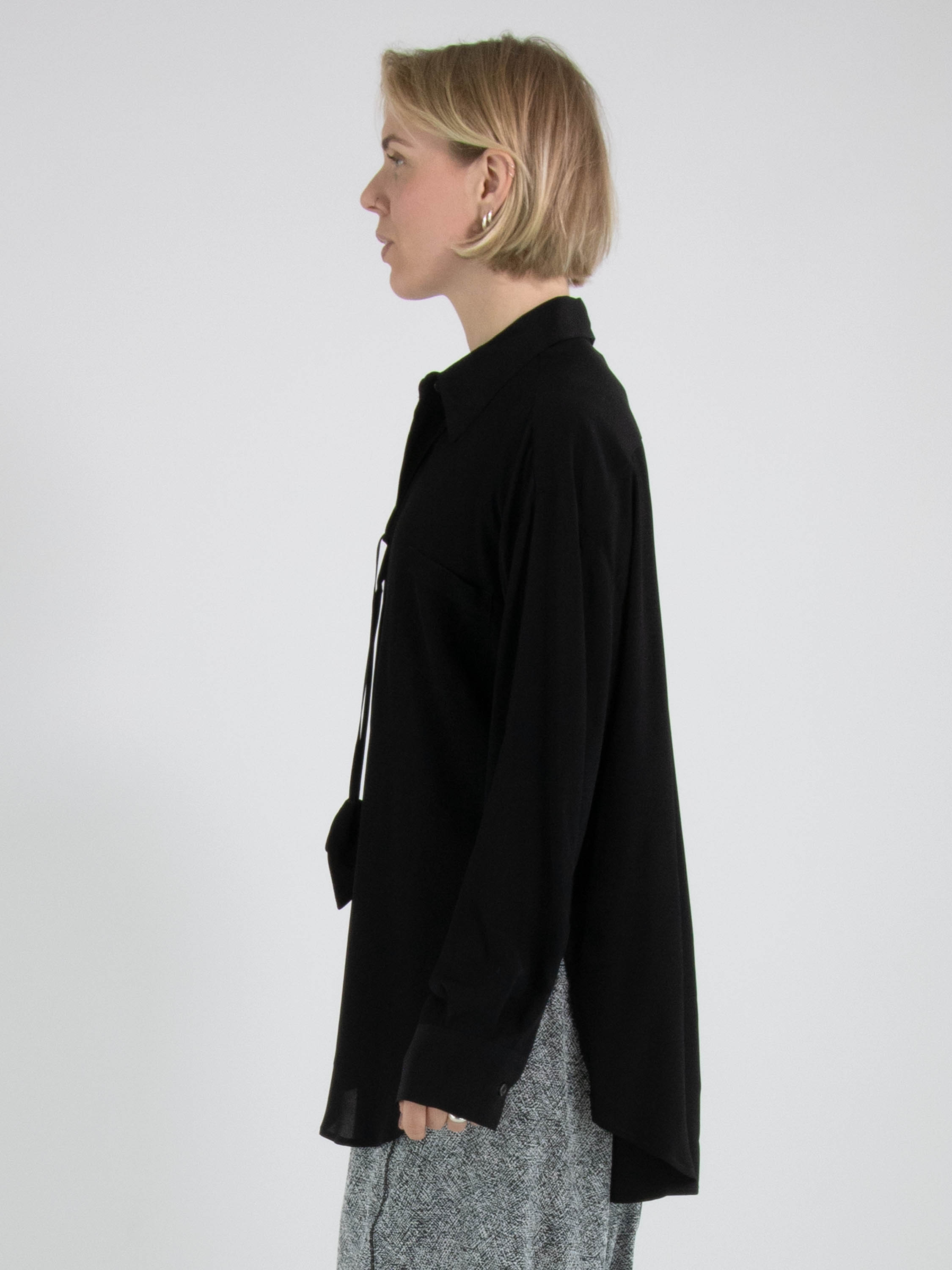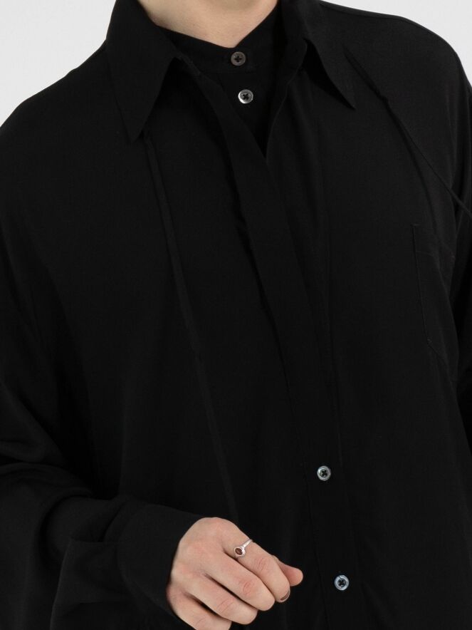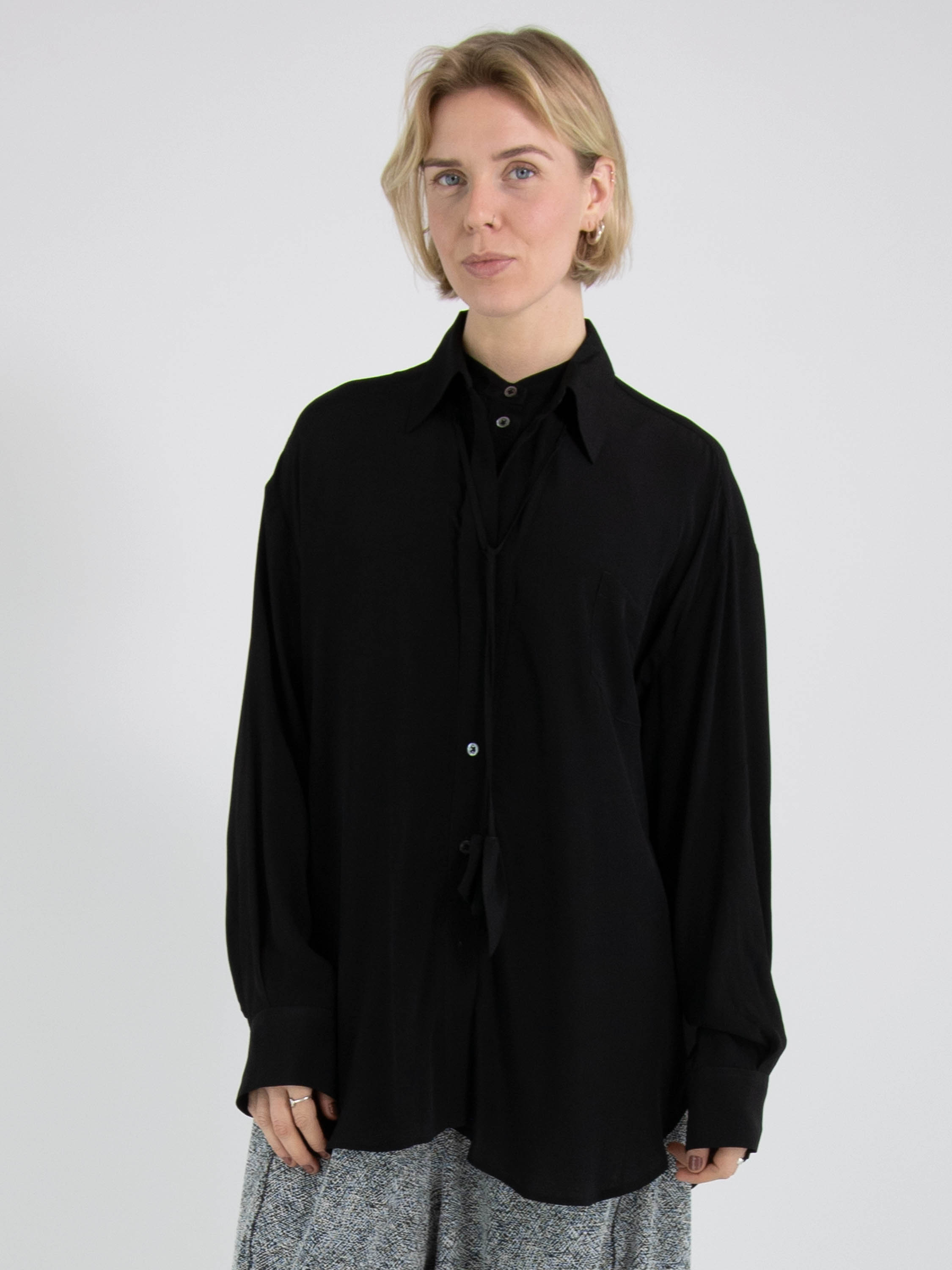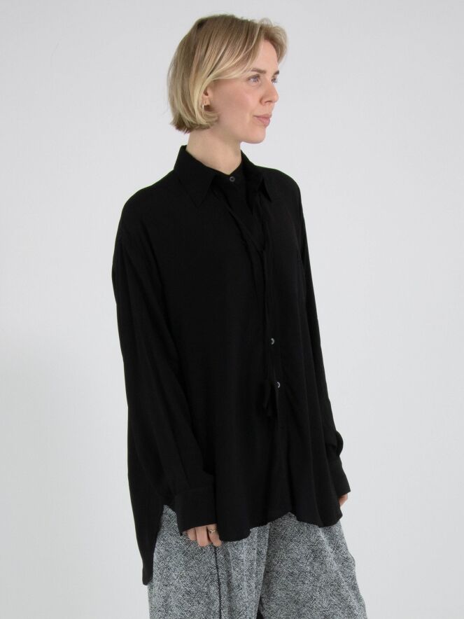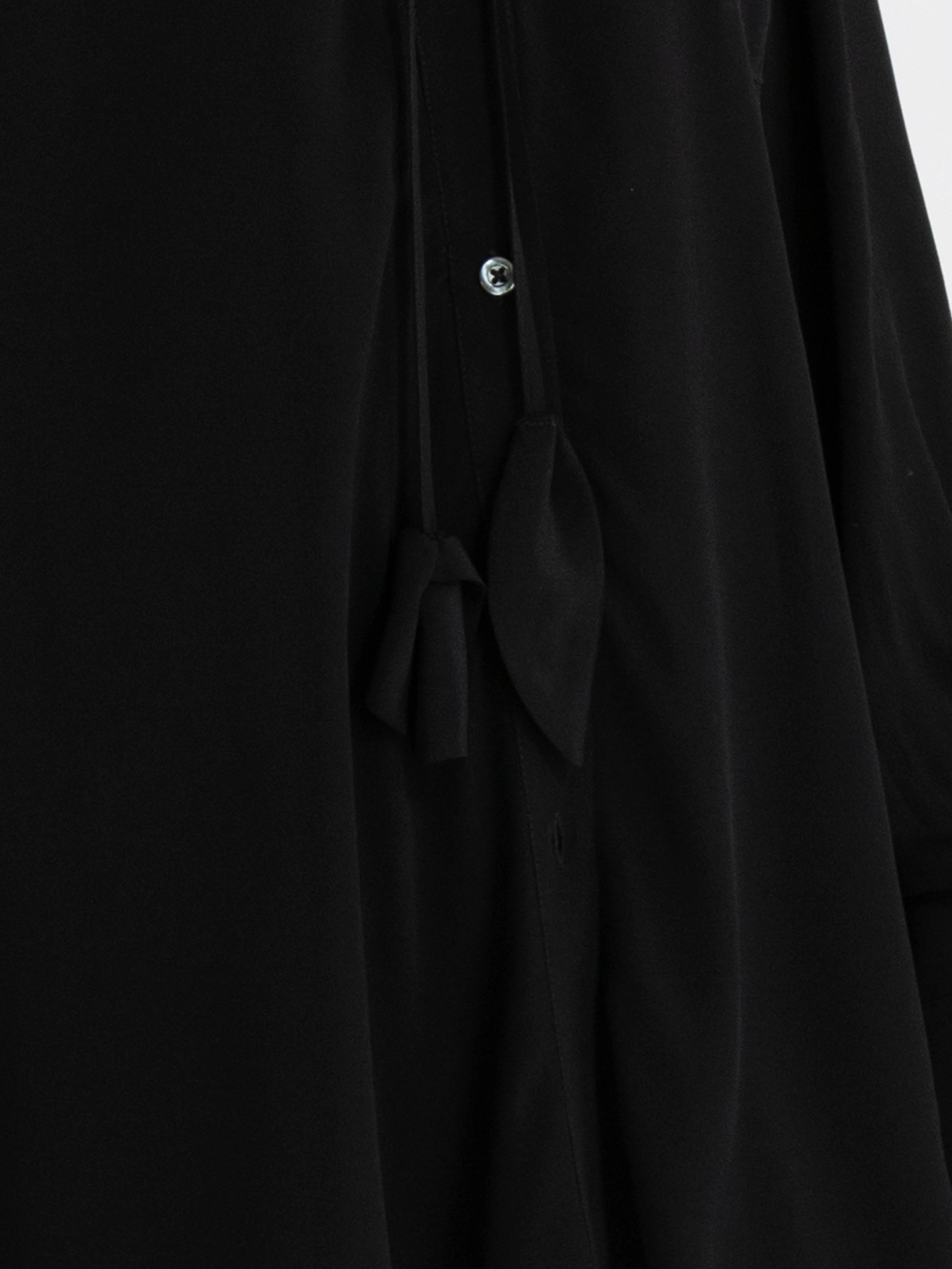 Une blouse ample de High en noir. La patte de boutonnage est cachée jusqu’au-dessous de la poitrine, puis devient classique. Depuis le côté droit de l’encolure part un ruban avec un détail en forme de goutte à son extrémité. En bas, une petite fente est présente de chaque côté. Cette blouse peut être lavée à la main.