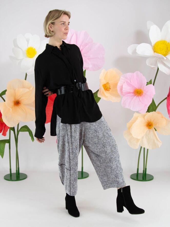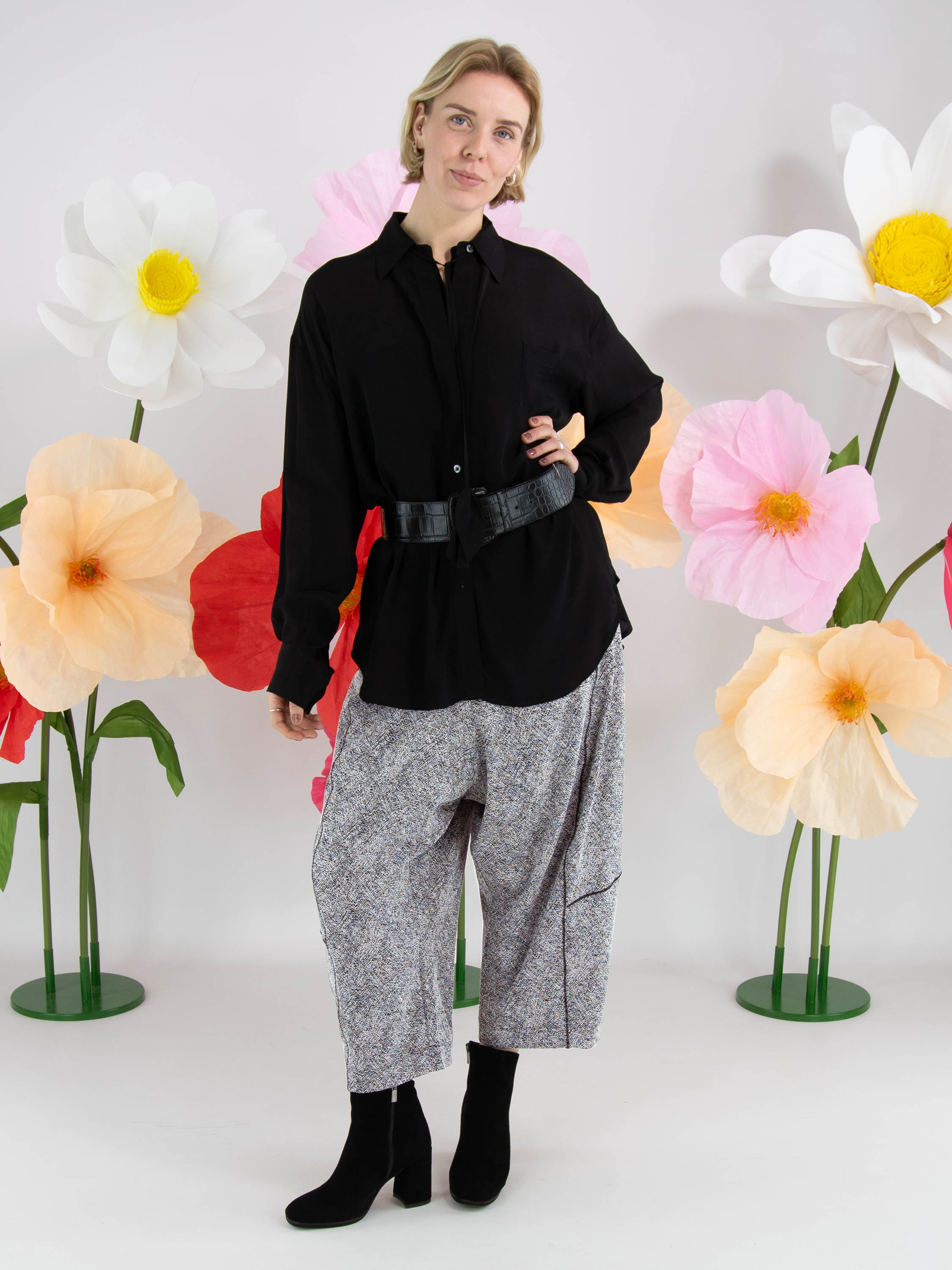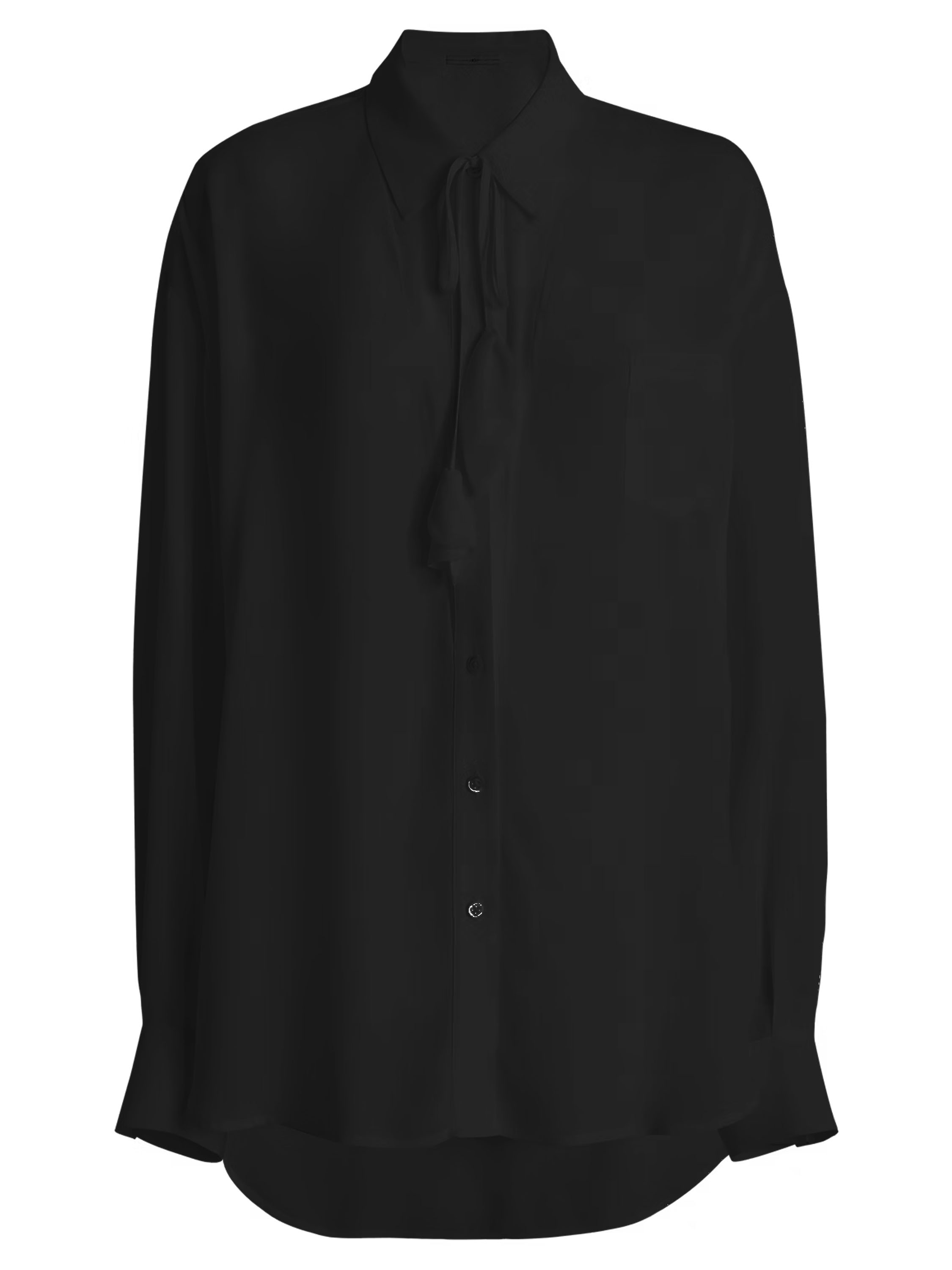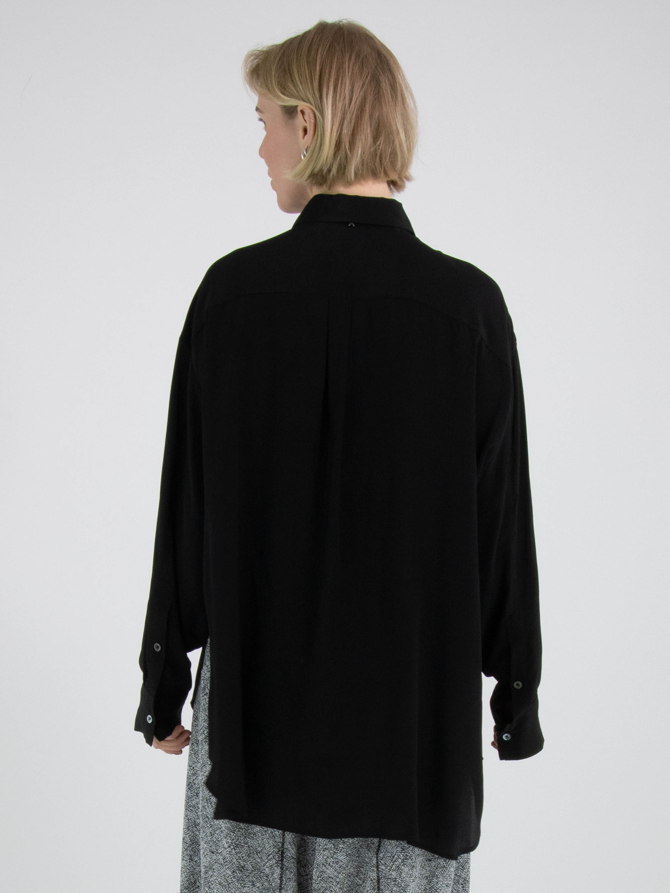 Une blouse ample de High en noir. La patte de boutonnage est cachée jusqu’au-dessous de la poitrine, puis devient classique. Depuis le côté droit de l’encolure part un ruban avec un détail en forme de goutte à son extrémité. En bas, une petite fente est présente de chaque côté. Cette blouse peut être lavée à la main.