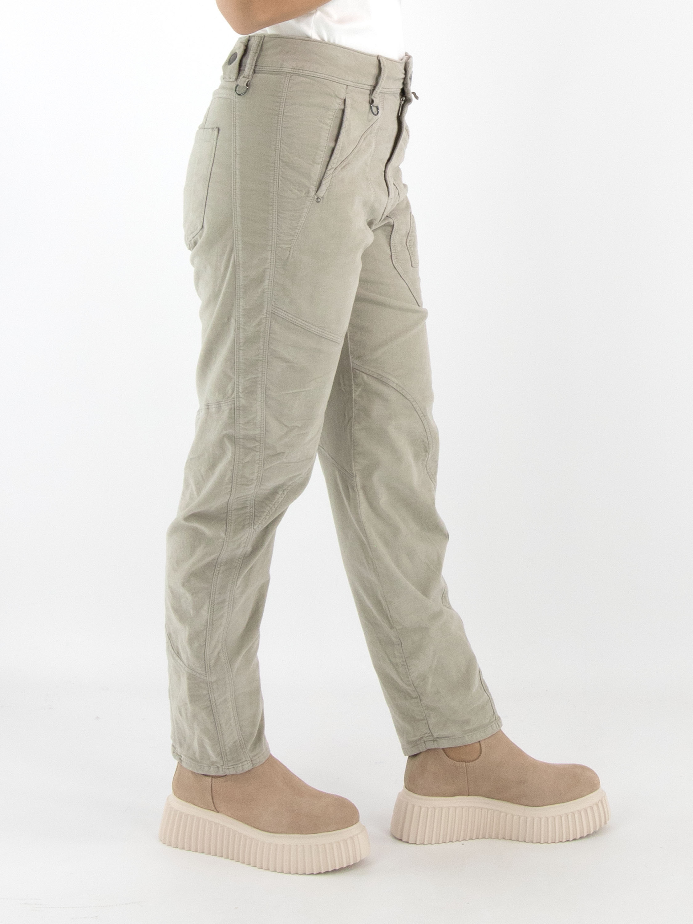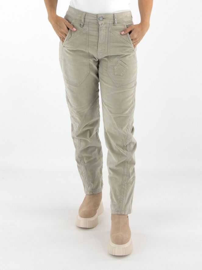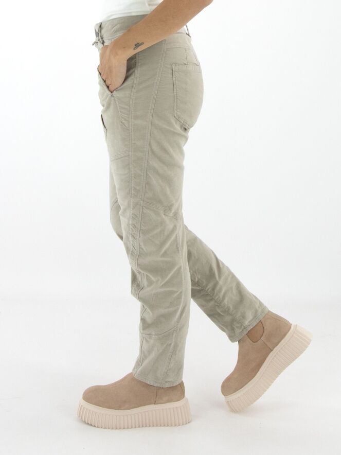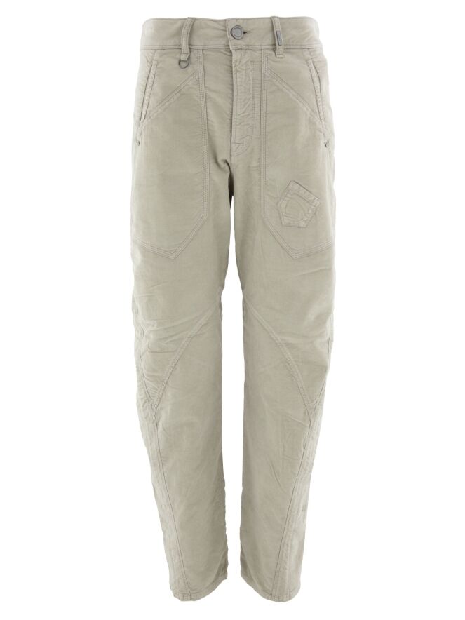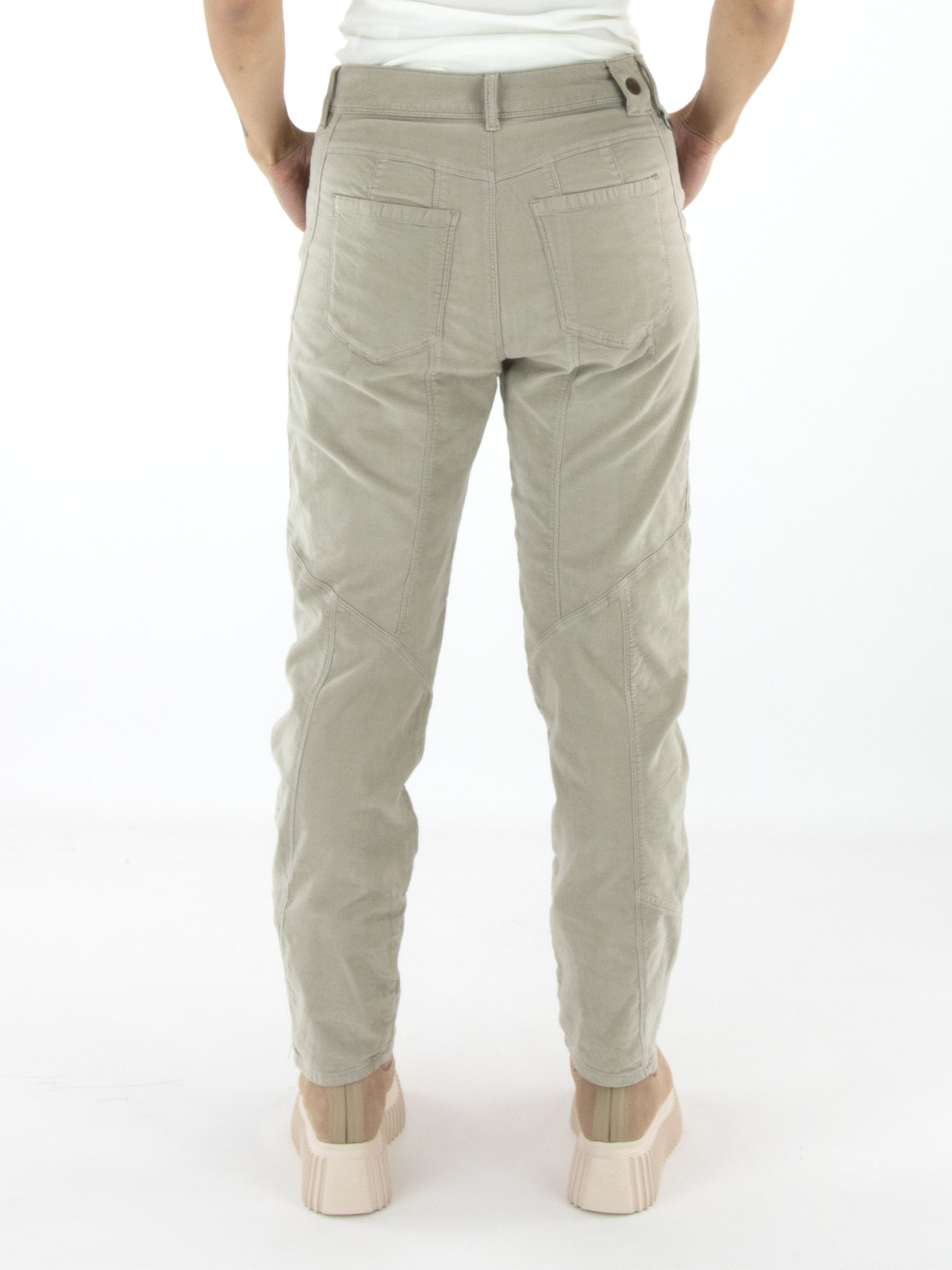 Un pantalon de High en velours de coton doux dans une teinte gris clair. Le modèle est doté de poches fendues, dont la poche gauche est ornée d’une petite poche supplémentaire décorative. Ce pantalon peut être lavé à 30 degrés.