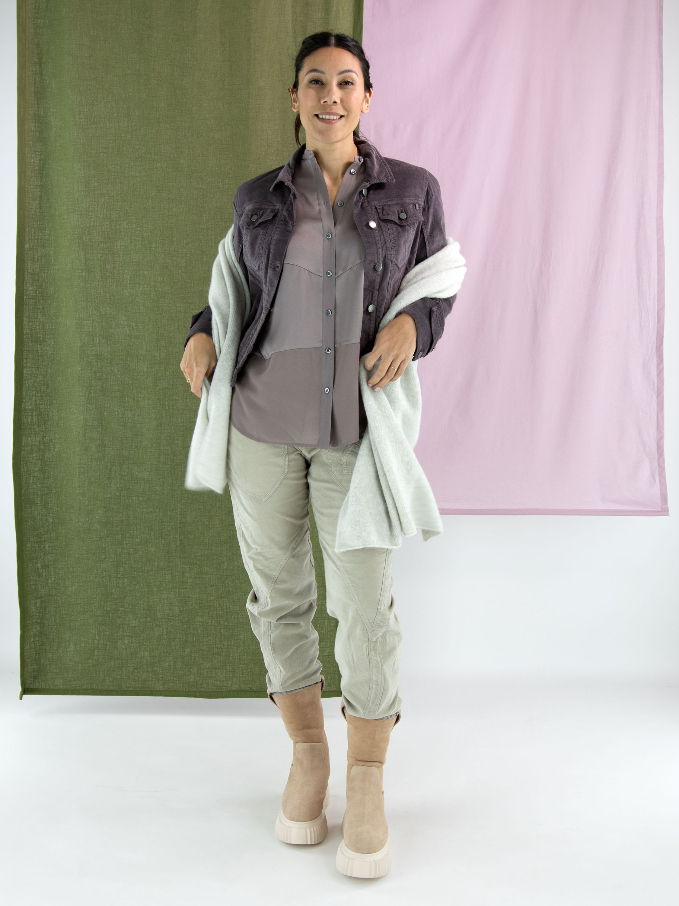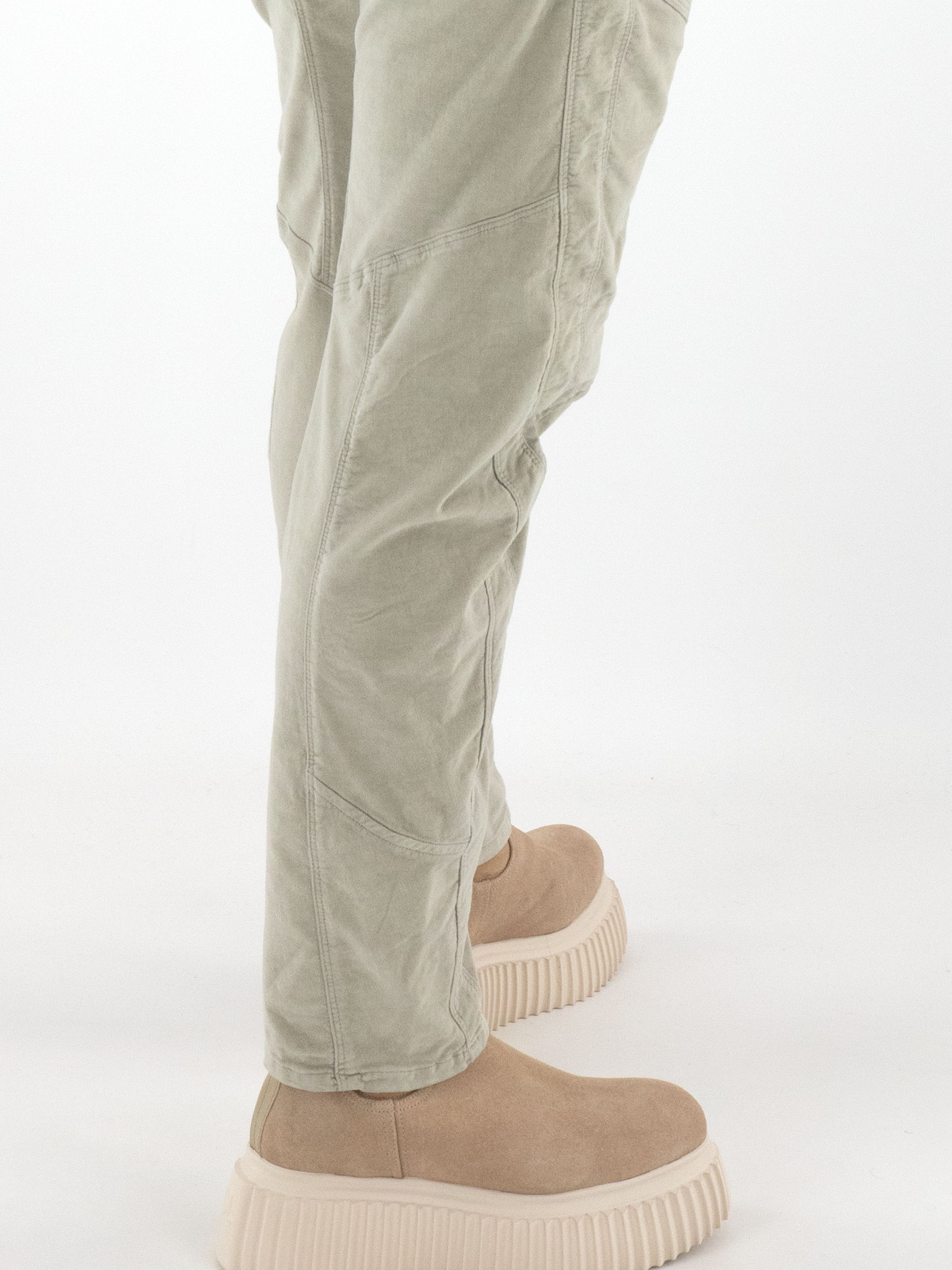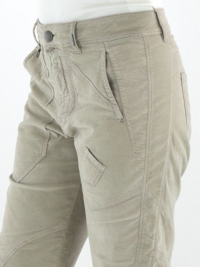 Un pantalon de High en velours de coton doux dans une teinte gris clair. Le modèle est doté de poches fendues, dont la poche gauche est ornée d’une petite poche supplémentaire décorative. Ce pantalon peut être lavé à 30 degrés.