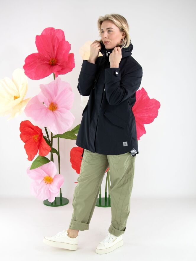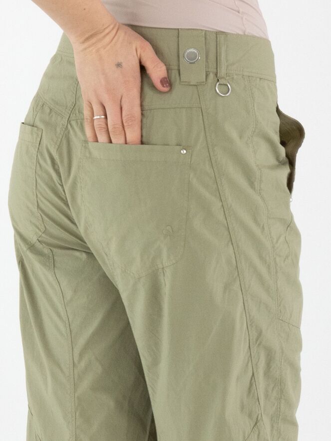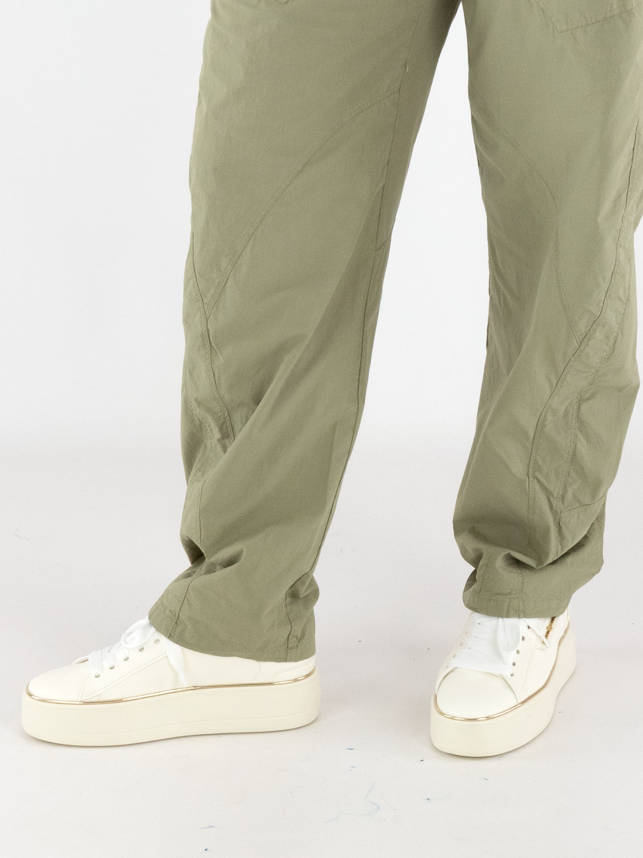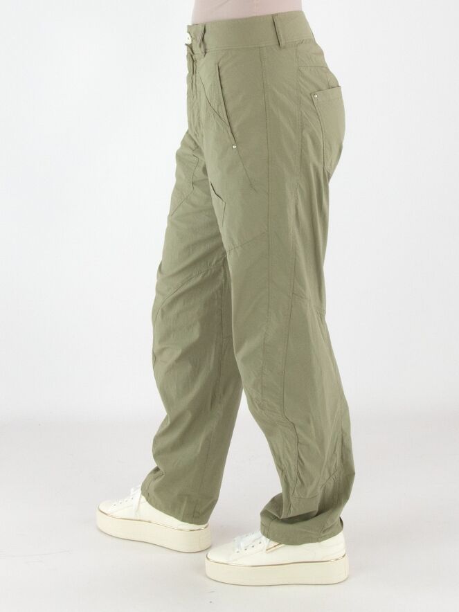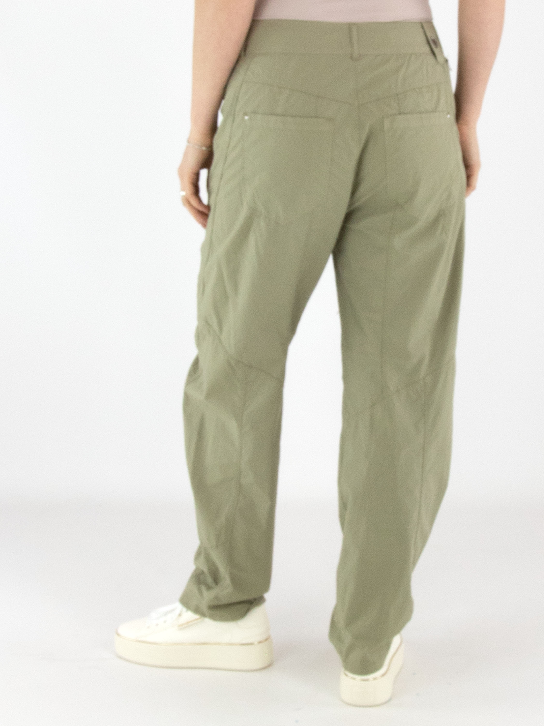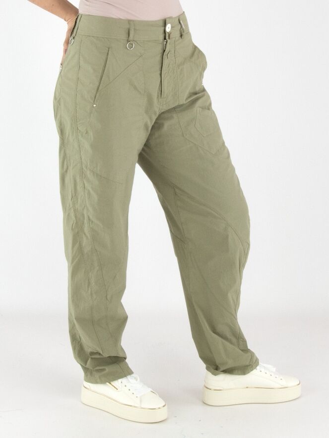 Un pantalon de High en coton estival dans une teinte vert olive. Sur la poche avant gauche se trouve une petite poche décorative avec une couture diagonale. Le pantalon possède des poches latérales et peut être lavé à 30 degrés.