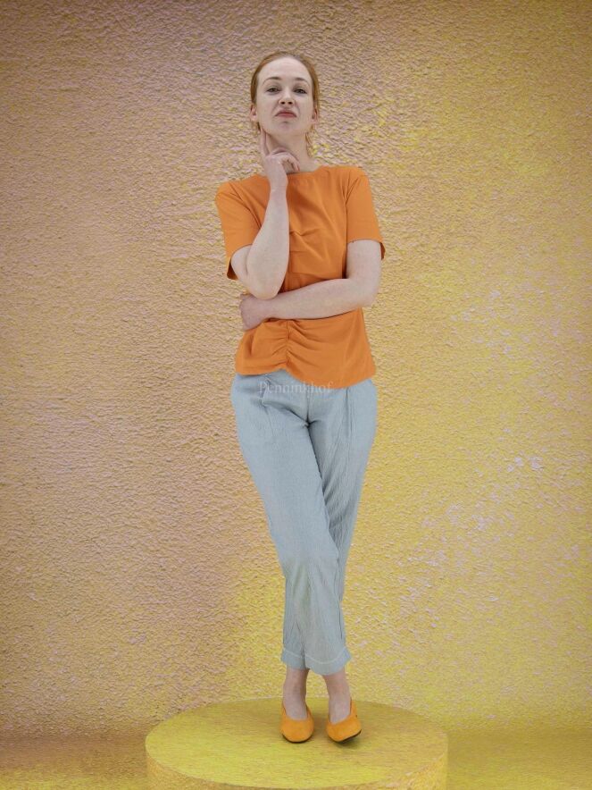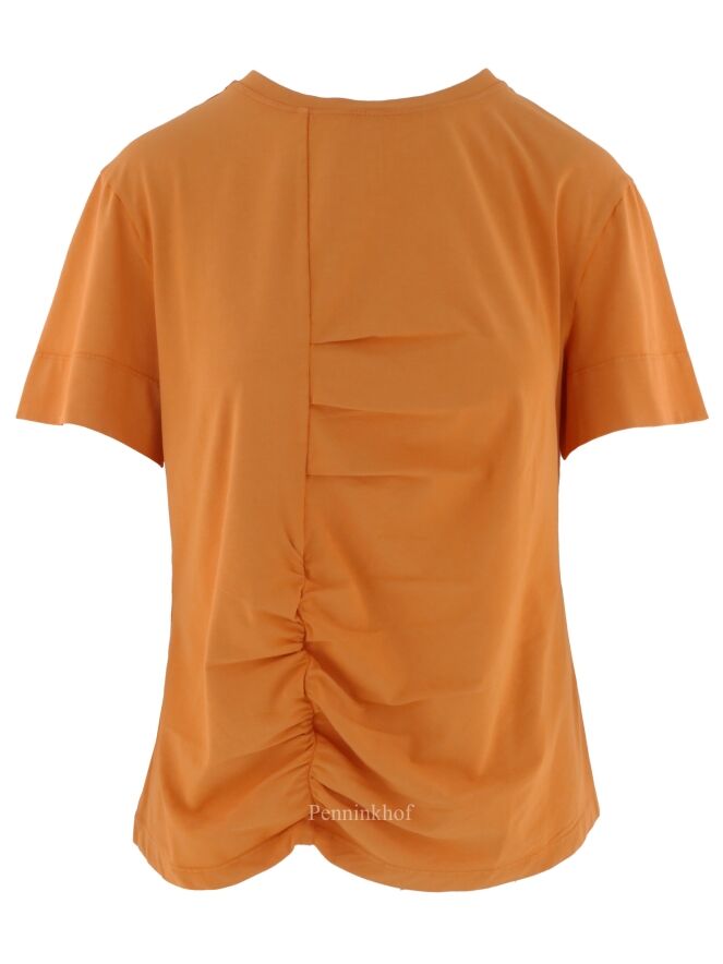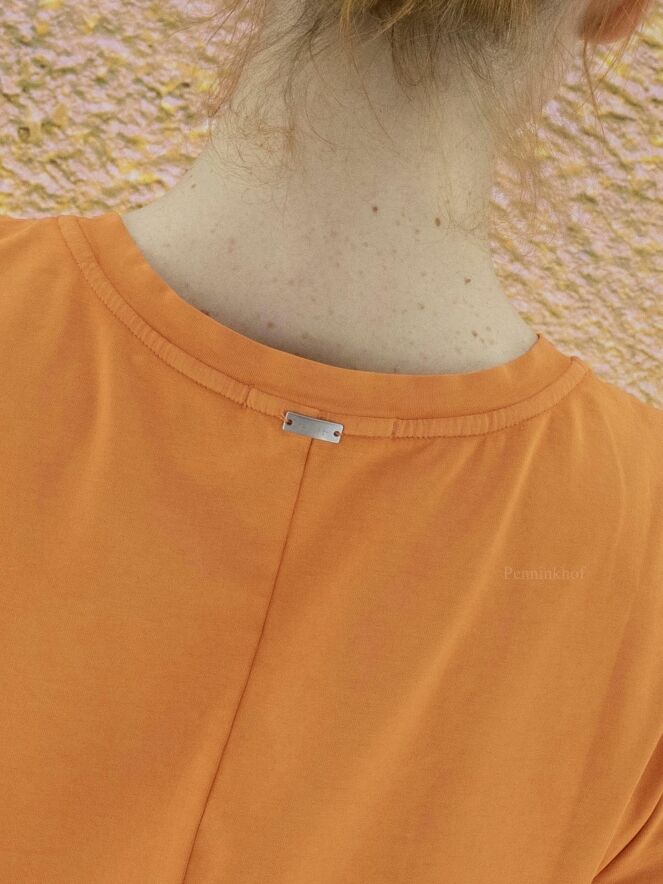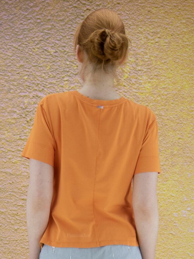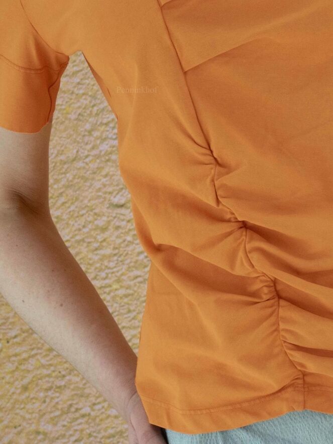 T-shirt de la marque High, de couleur orange. Manches courtes à encolure ronde. Sur le devant, une couture décentrée traverse toute la hauteur avec plusieurs plis et fronces décoratifs de part et d'autre. Lavage à la main.