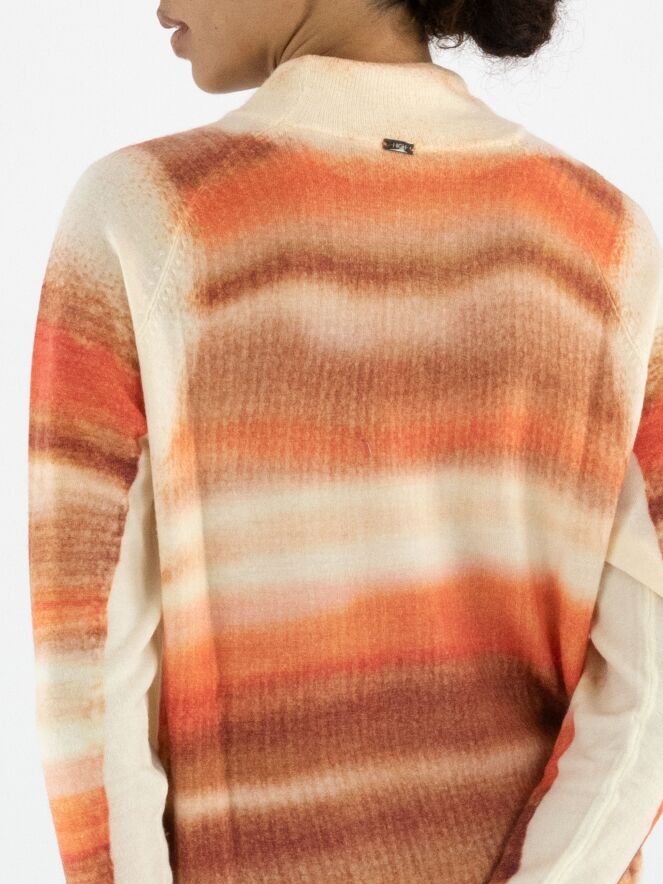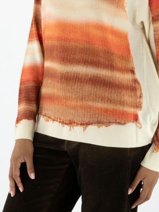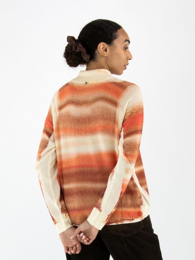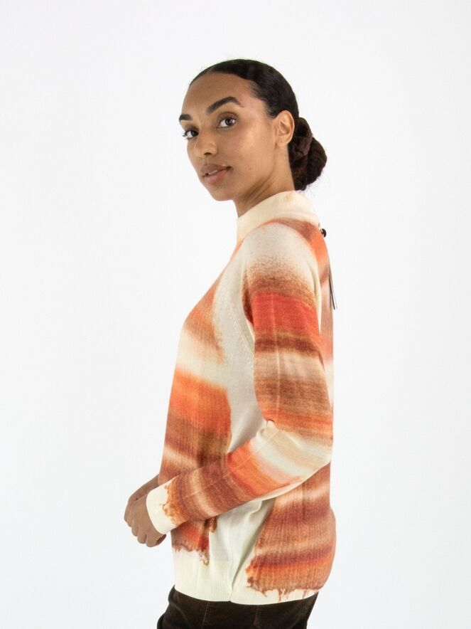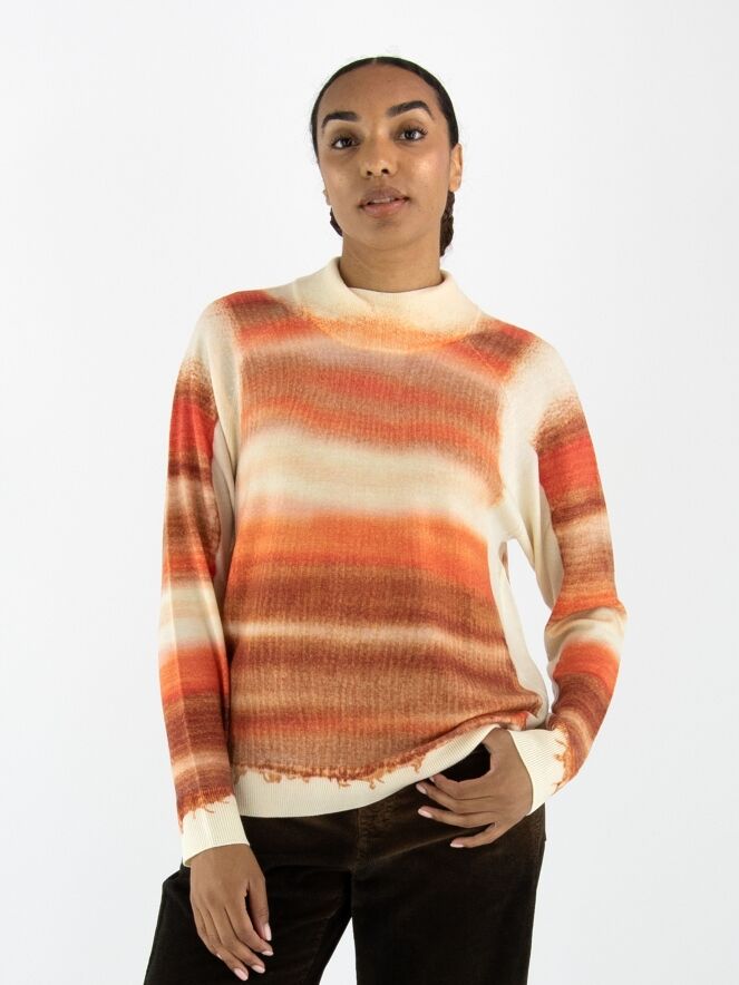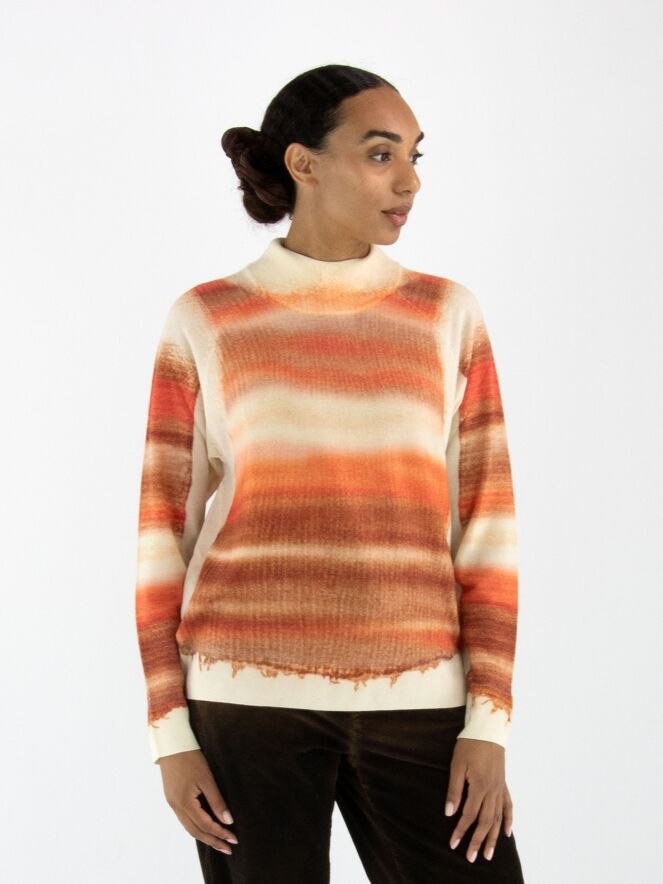 Pull de la marque High avec un dégradé imprimé dans plusieurs nuances de rouge et de blanc cassé. L’encolure est dotée d’un col roulé en tricot finement côtelé. Les poignets et le bas du pull sont également finis par une bordure en tricot côtelé. Ce pull ne peut pas être lavé.