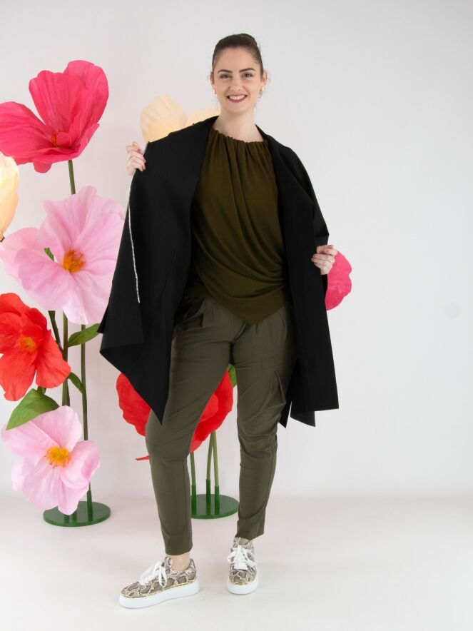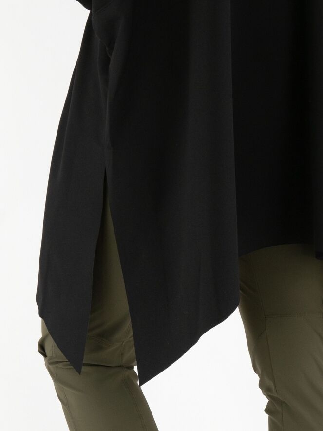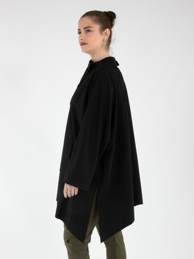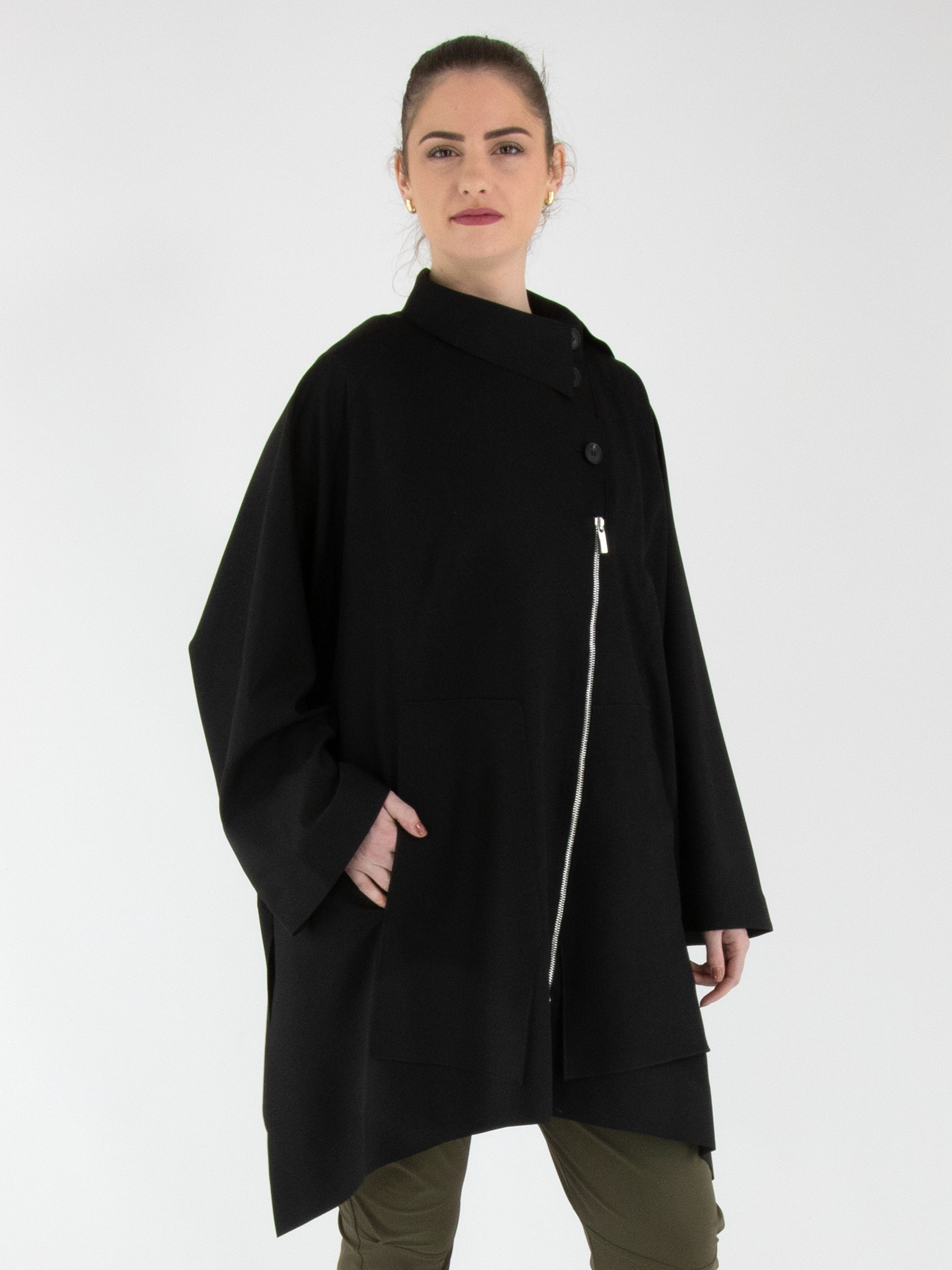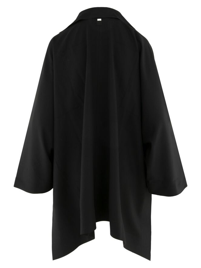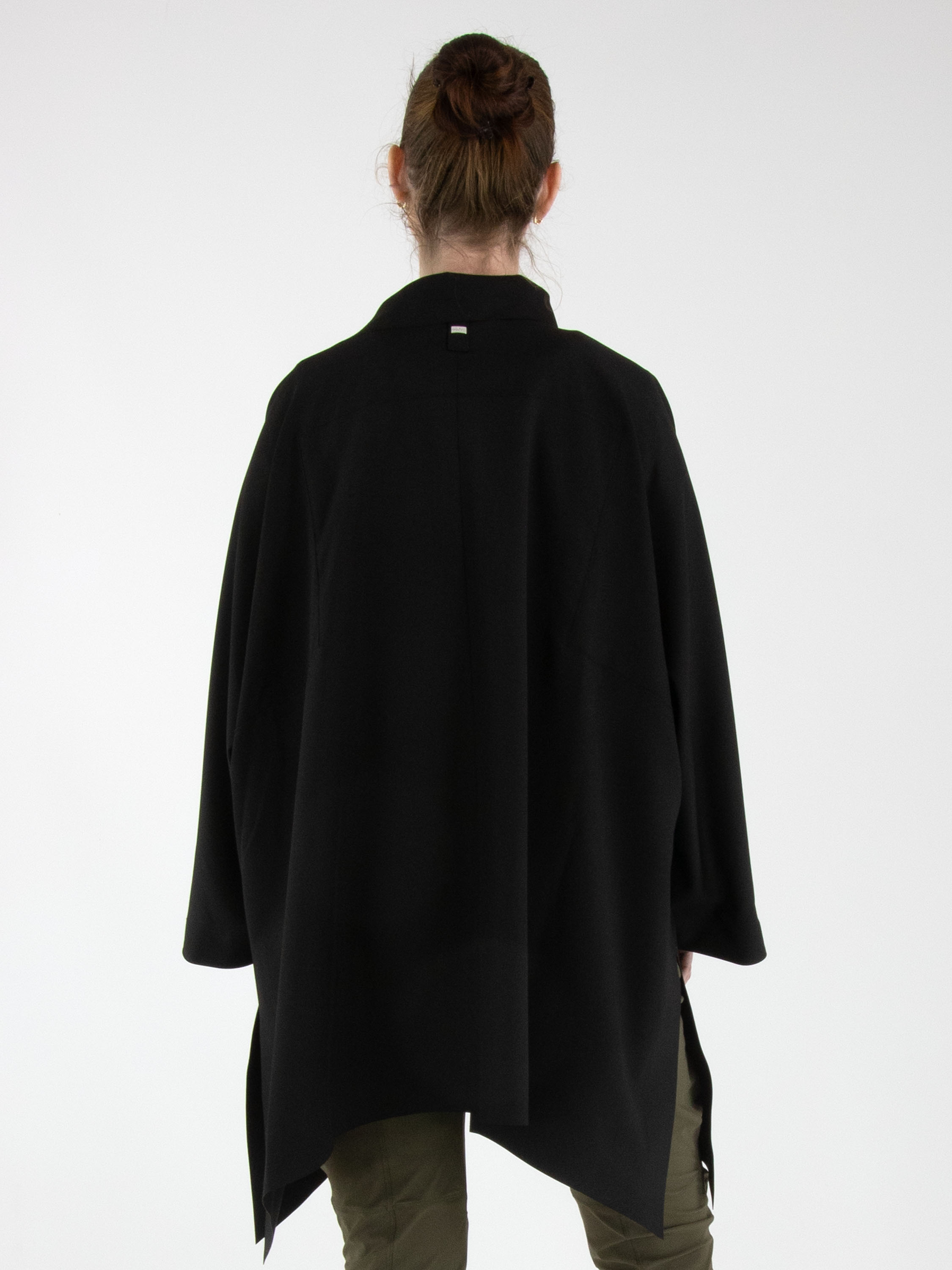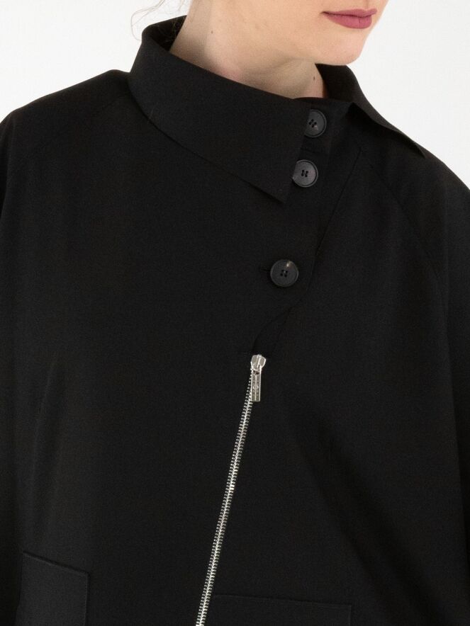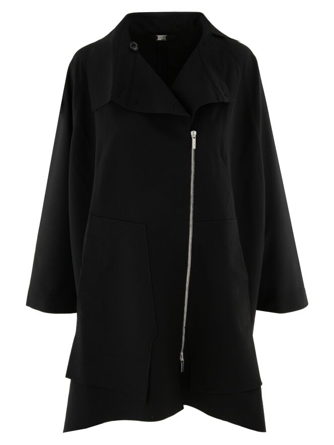 Un manteau de High en noir. Le manteau est doté d’une fermeture éclair asymétrique, surmontée d’une fermeture à trois boutons. Il présente des manches mi-longues. Ce manteau peut être lavé à la main.