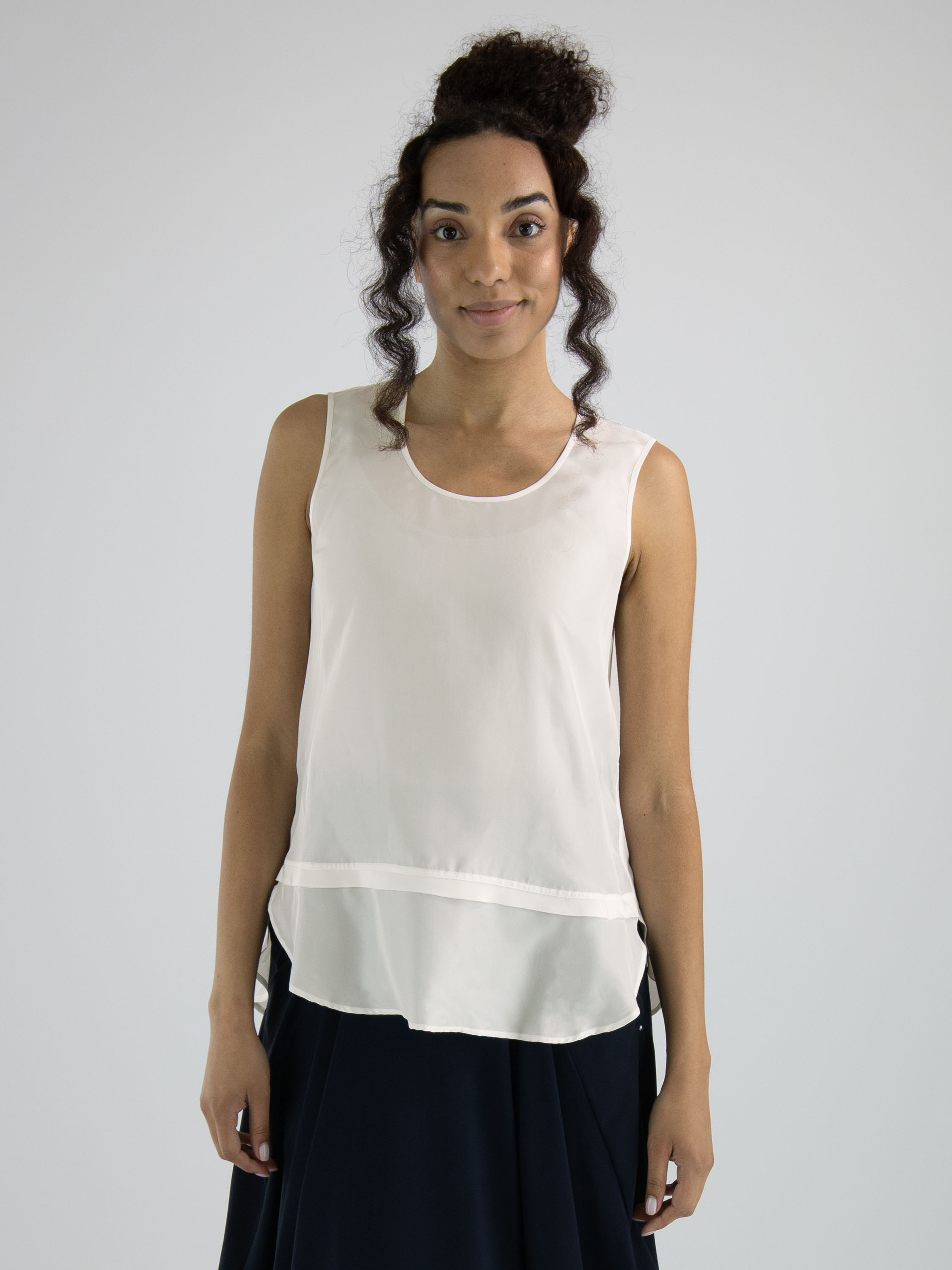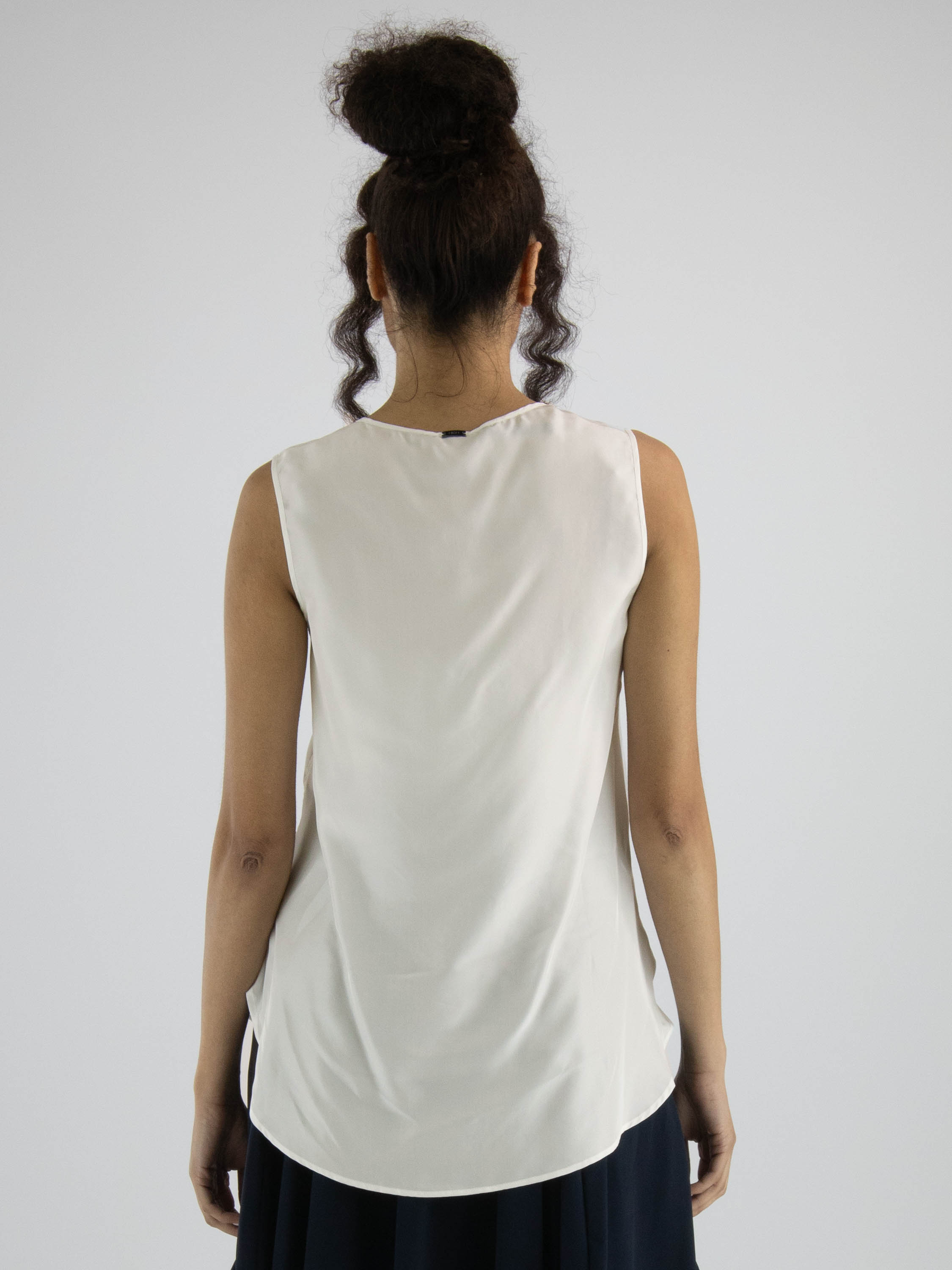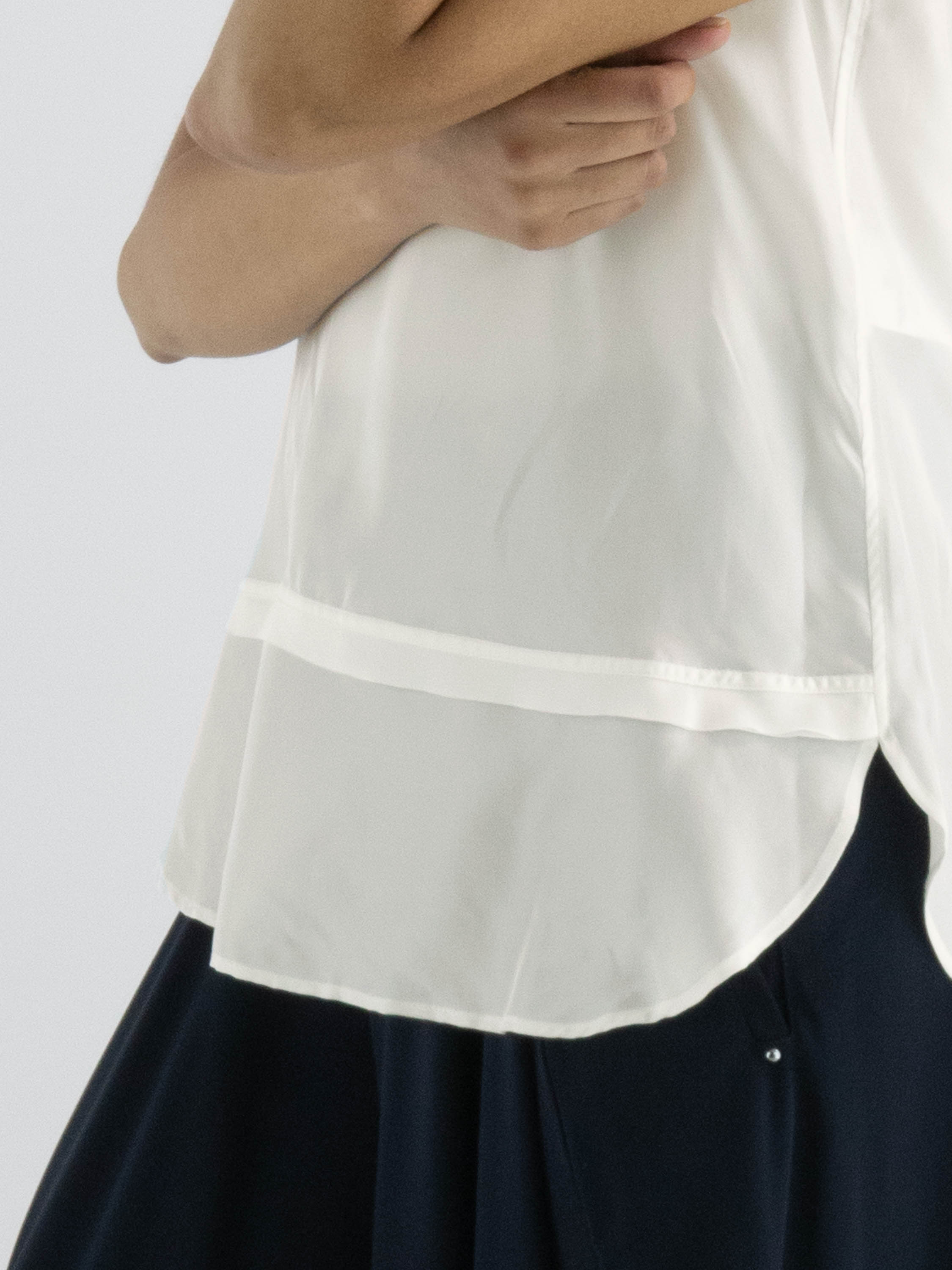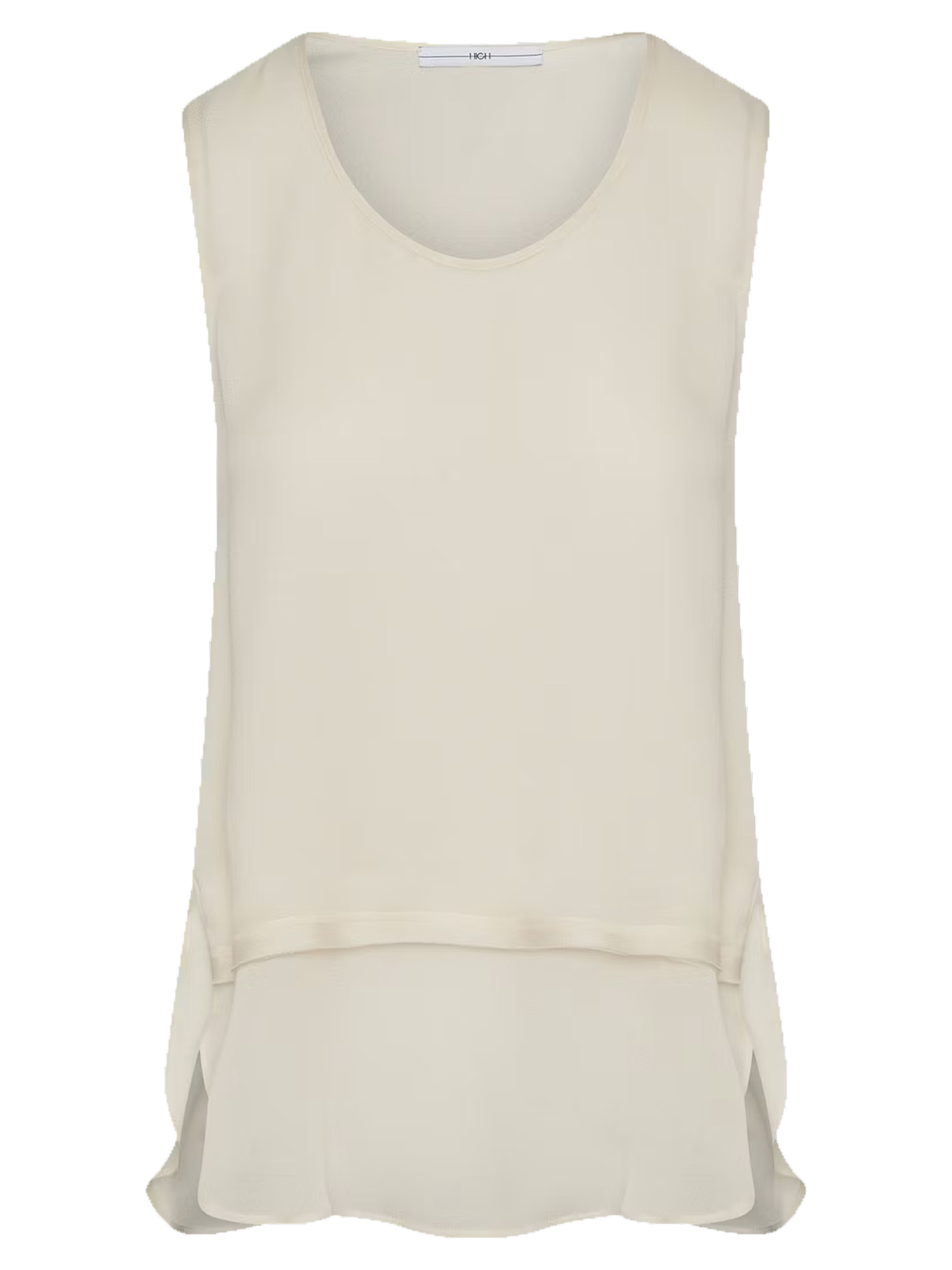 Un top en satin mat luxueux et légèrement transparent de High en blanc crème. Le top a un col rond et est coupé en rond au bas. Ce top ne doit pas être lavé.