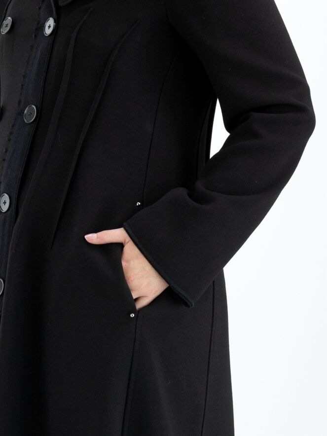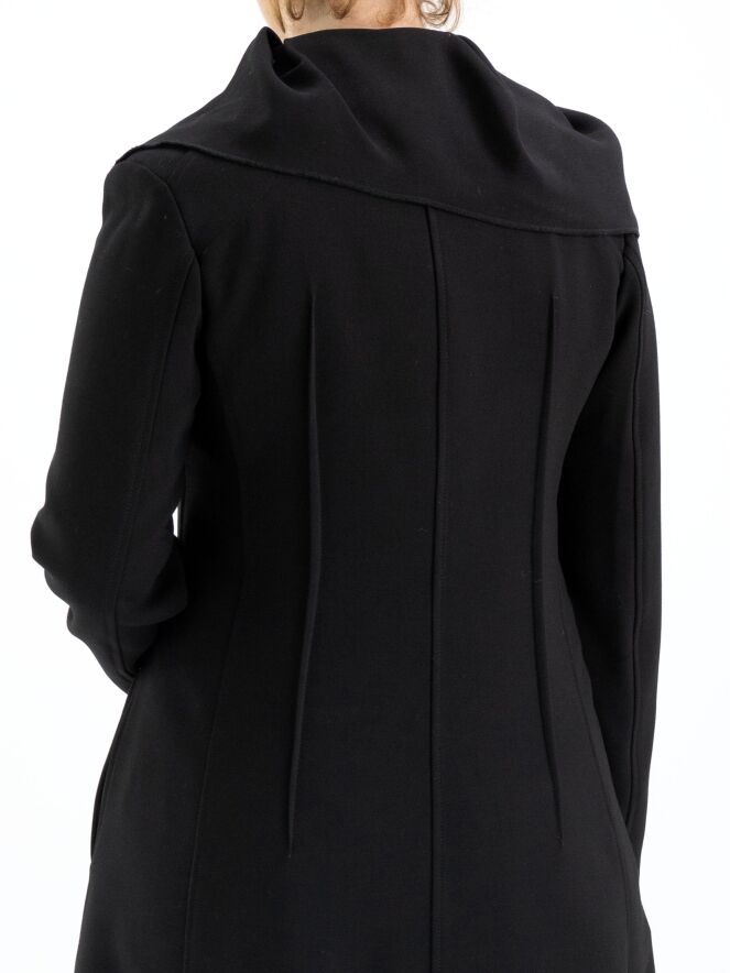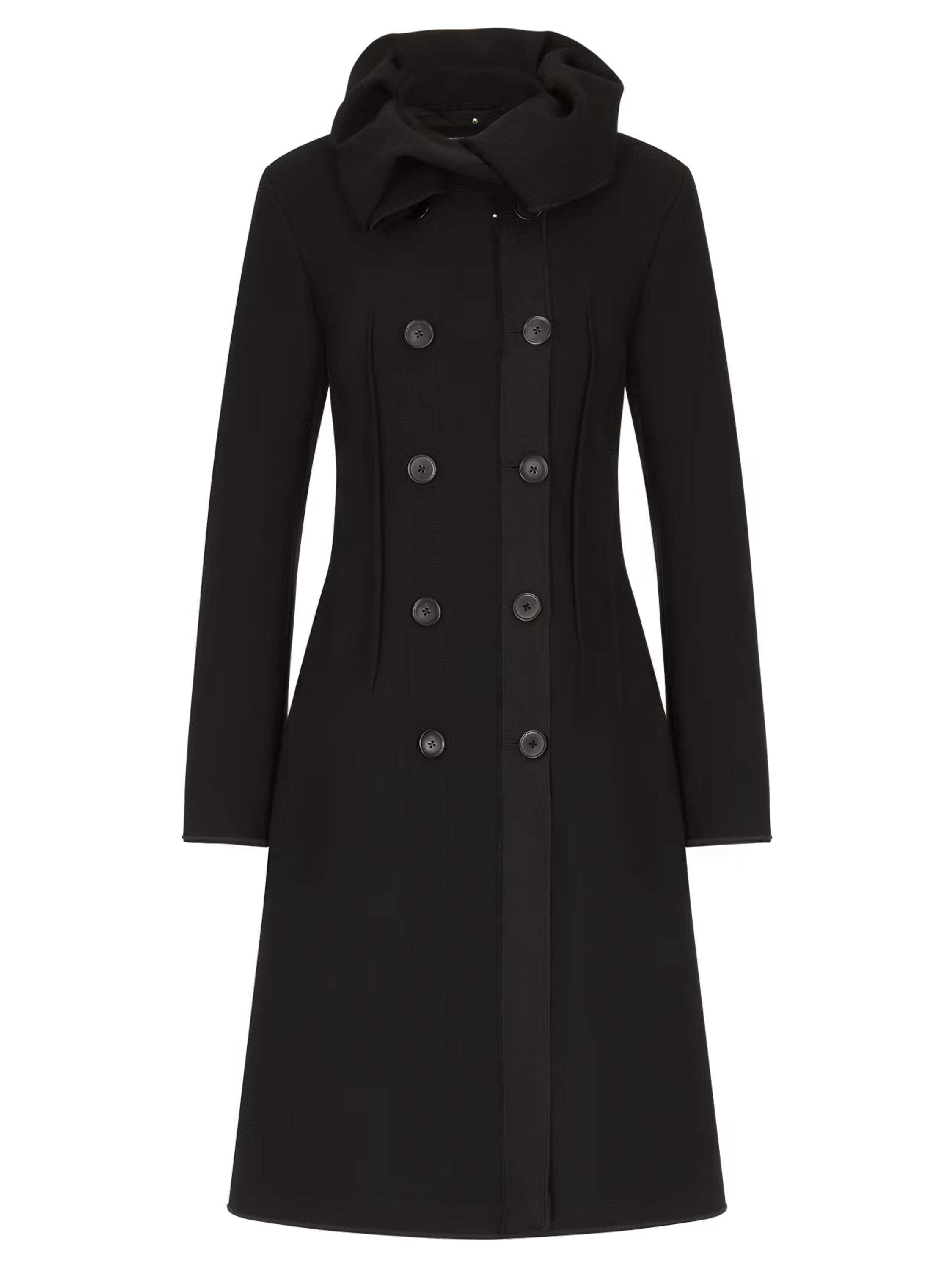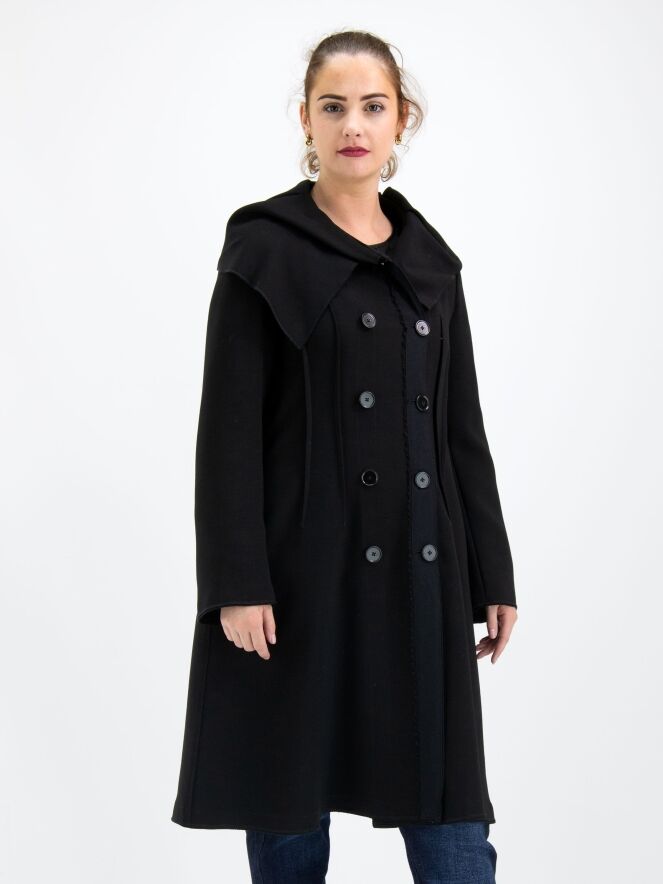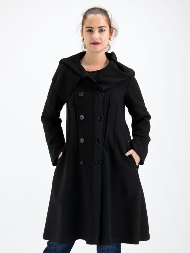 Un manteau de cocher croisé de High de couleur noire. Le manteau a un large col qui tombe sur toute l'épaule. Il y a plusieurs pinces à la taille à l'avant comme à l'arrière. Le long de la fermeture à boutons se trouve une large bordure côtelée. Juste en dessous de la taille, il y a des poches fendues. Ce manteau ne doit pas être lavé.