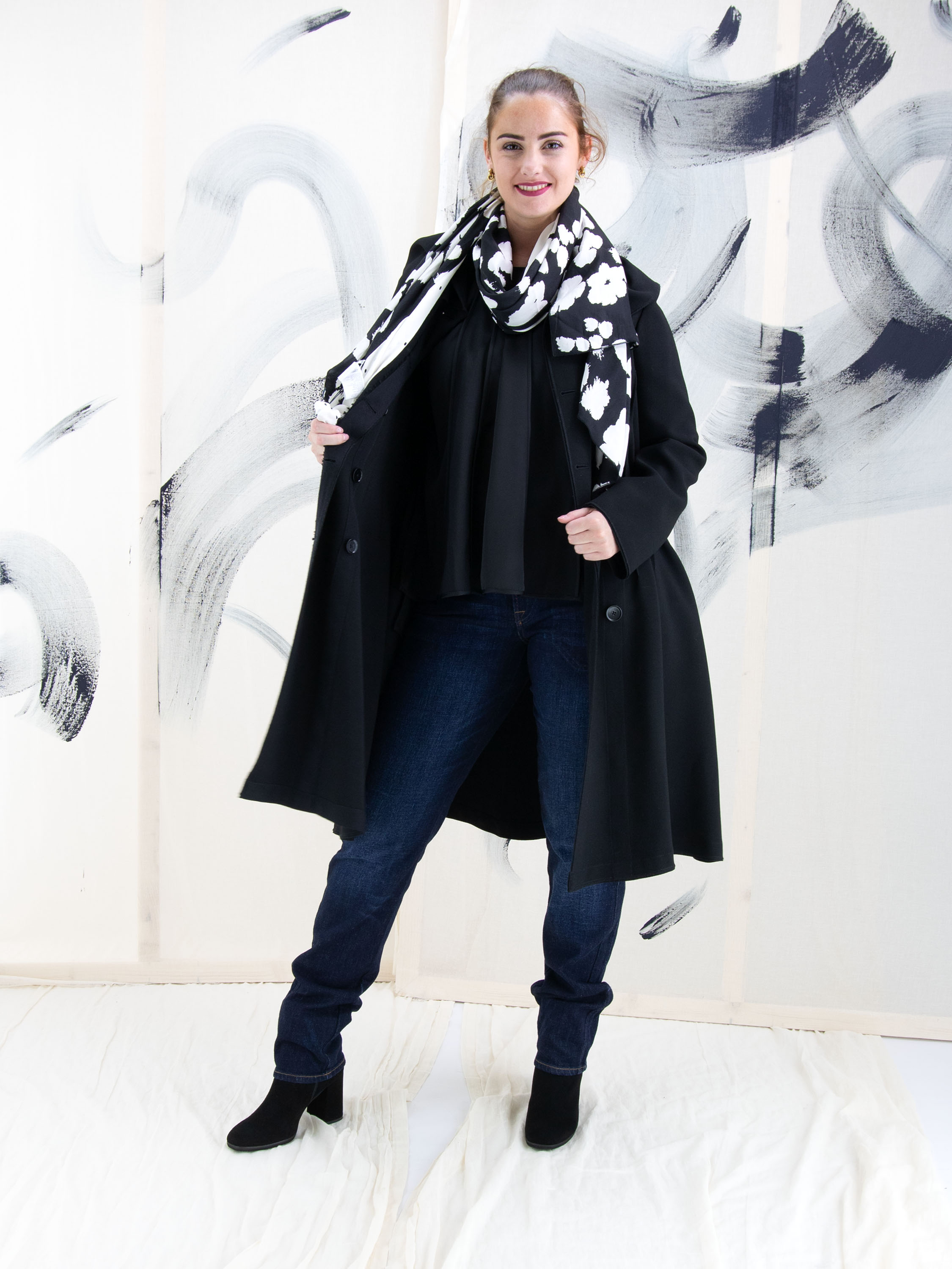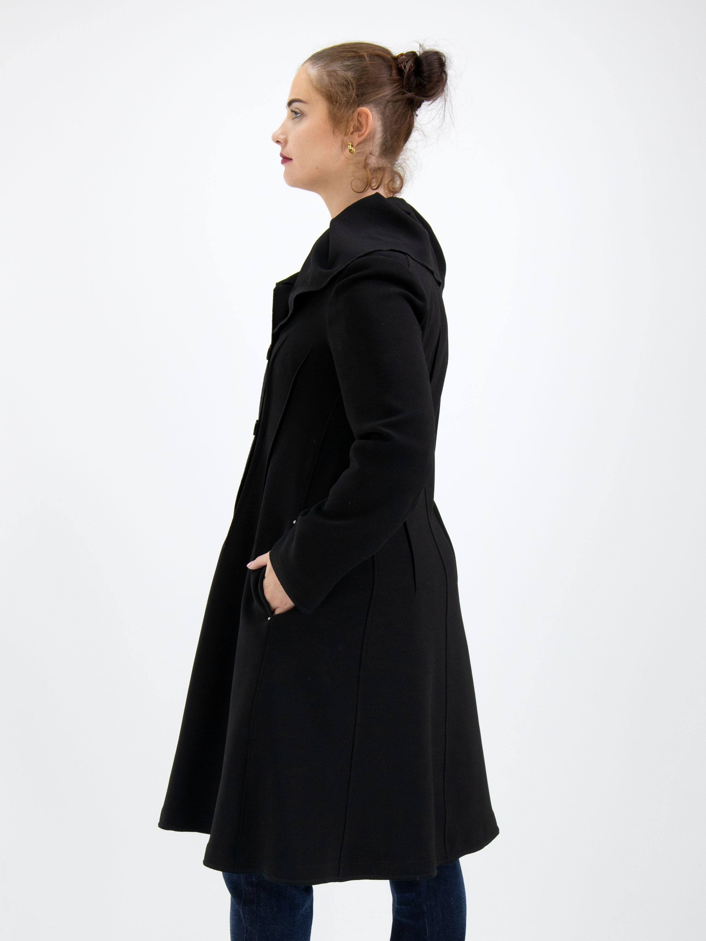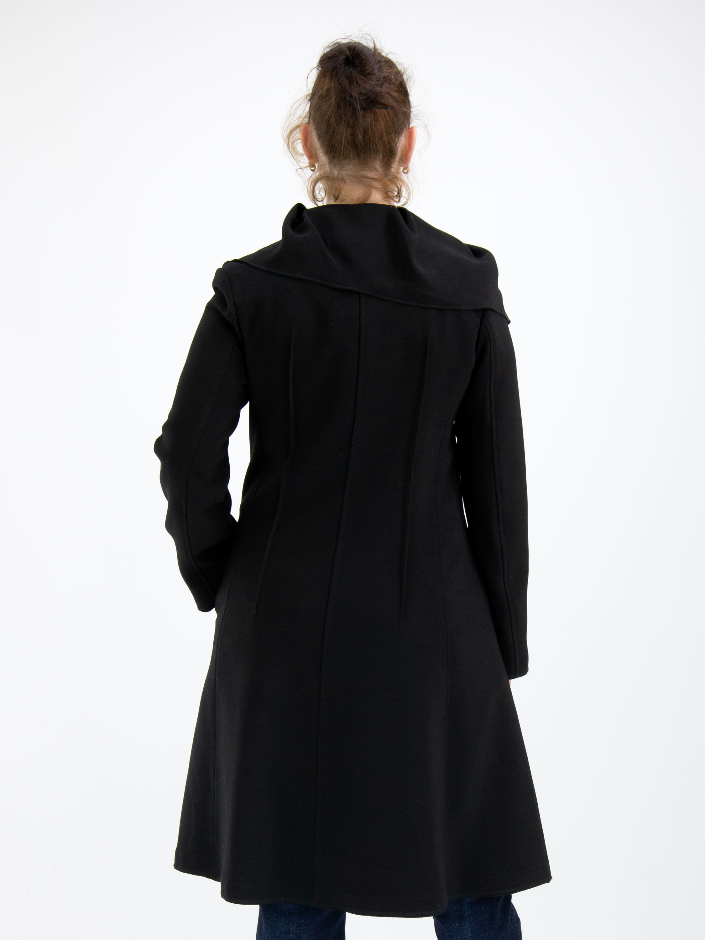 Un manteau de cocher croisé de High de couleur noire. Le manteau a un large col qui tombe sur toute l'épaule. Il y a plusieurs pinces à la taille à l'avant comme à l'arrière. Le long de la fermeture à boutons se trouve une large bordure côtelée. Juste en dessous de la taille, il y a des poches fendues. Ce manteau ne doit pas être lavé.