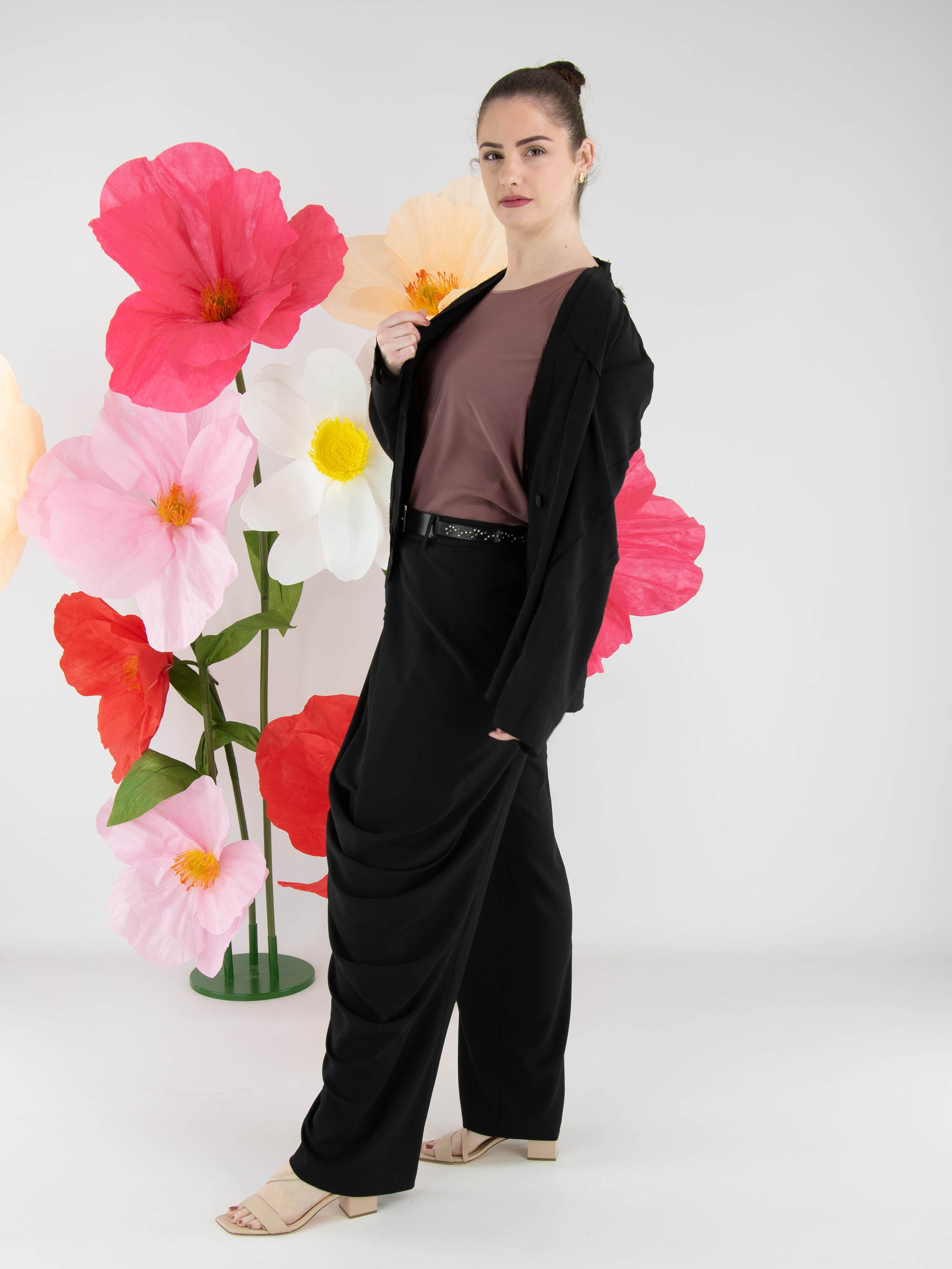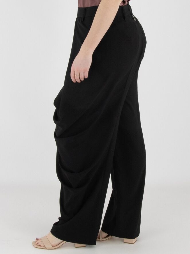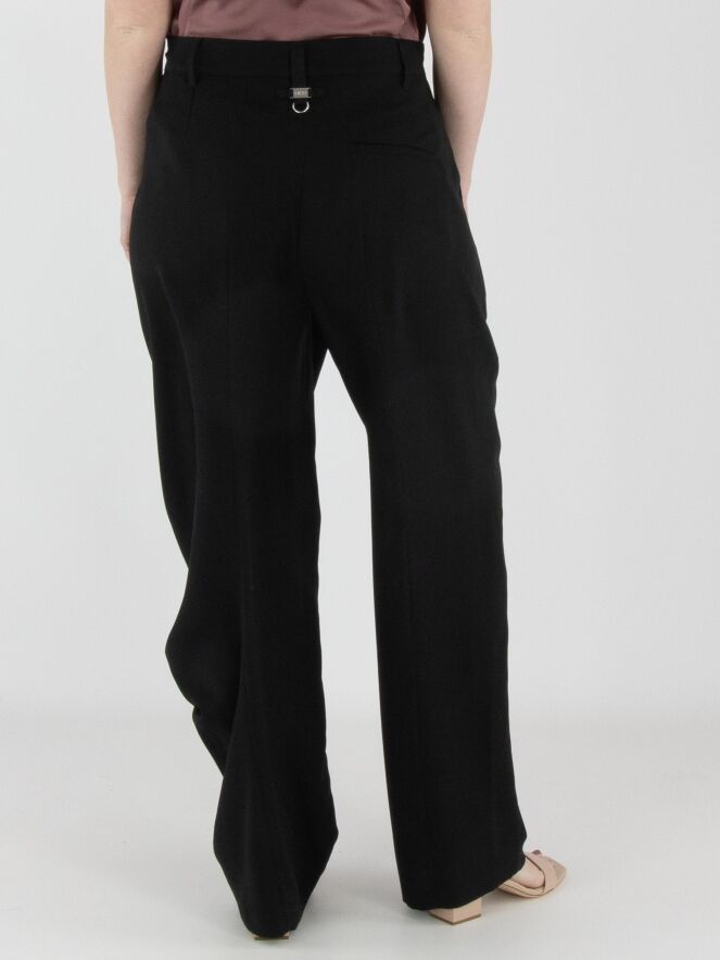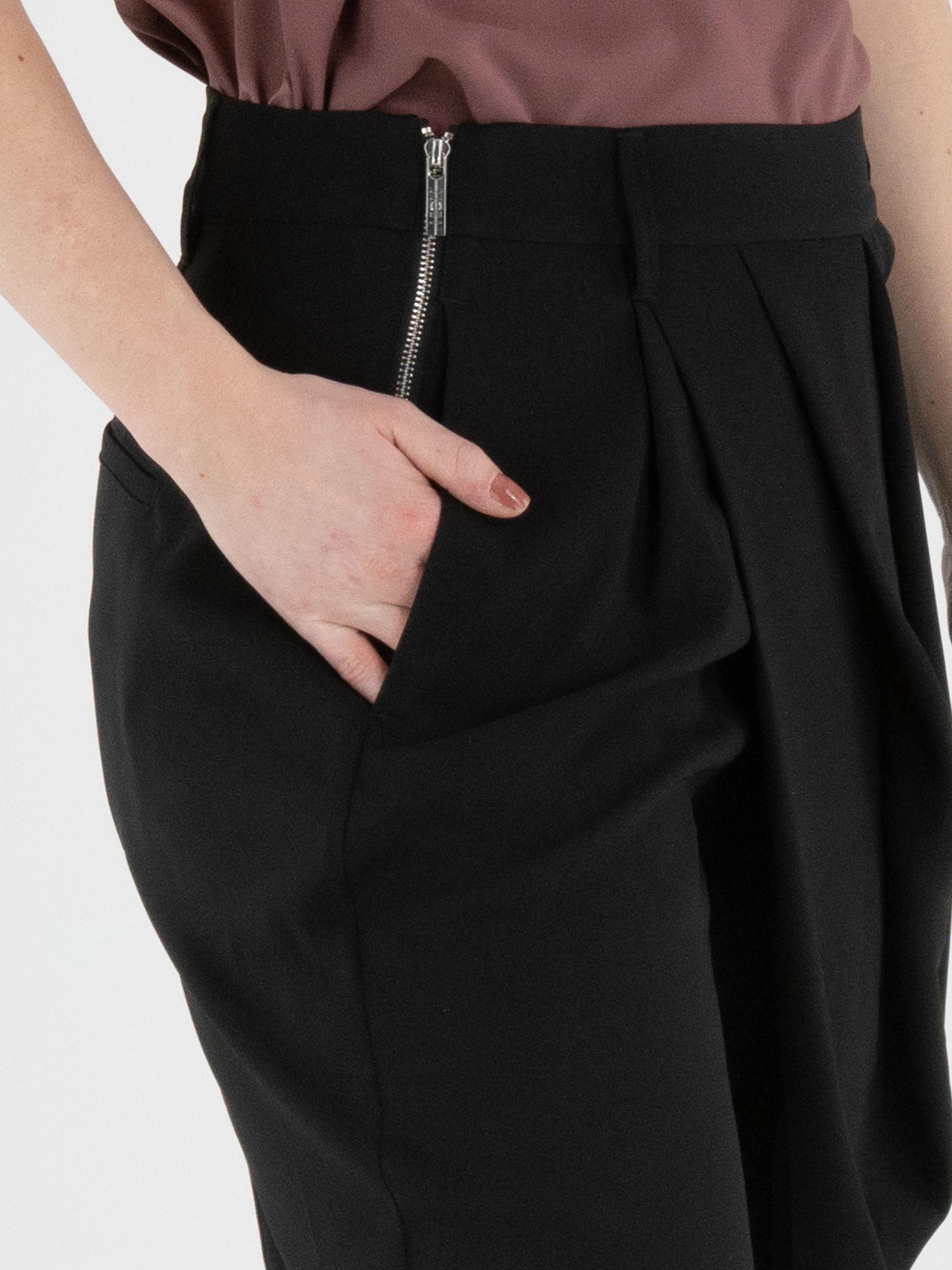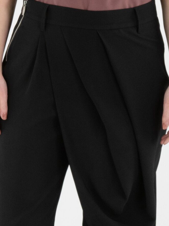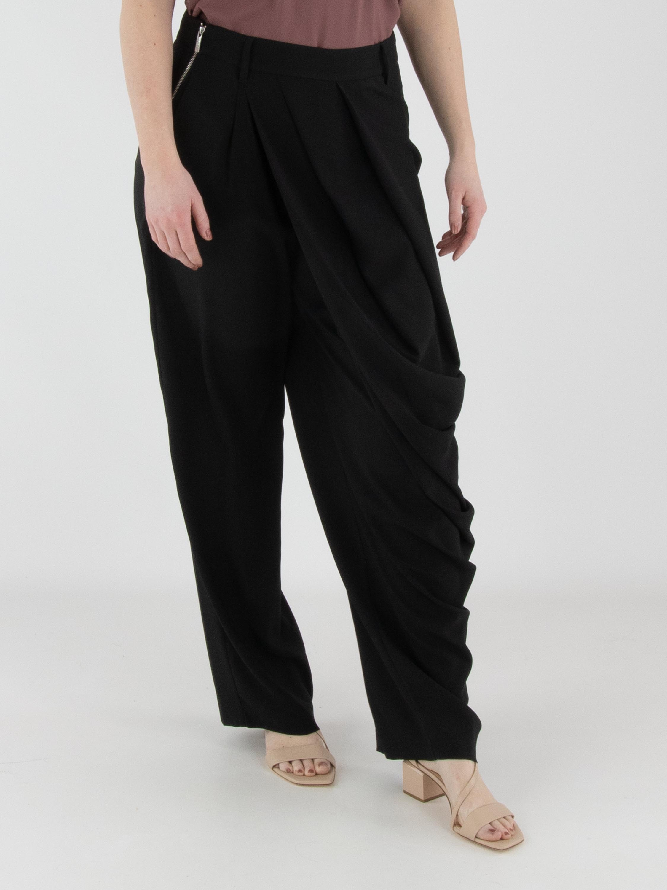 Un pantalon en crêpe de High en noir. À l’avant, plusieurs plis diagonaux partent de la ceinture et créent un effet drapé sur la jambe droite. Une fermeture éclair est placée sur le côté gauche à la taille. Les jambes sont droites. Ce pantalon peut être lavé à la main.