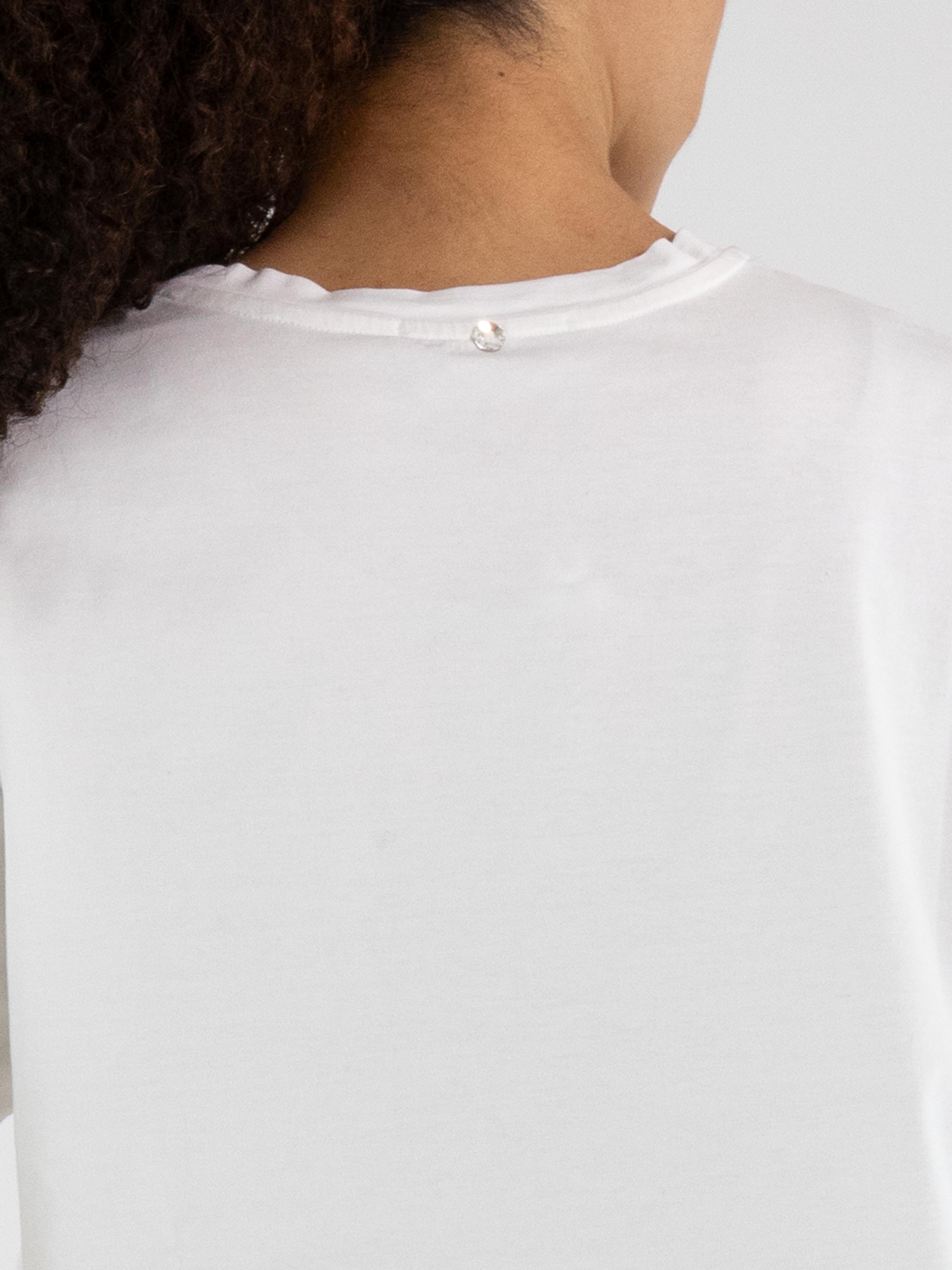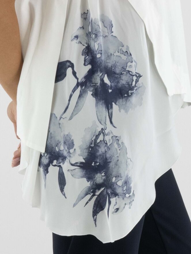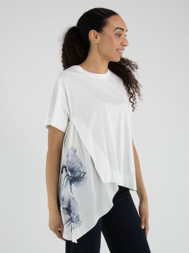 T-shirt de High en blanc crème. Un empiècement en satin mat avec un imprimé graphique d’orchidées dans plusieurs nuances de bleu marine est inséré sur le côté droit, créant un contraste artistique et affirmé. Doté d’un col rond et de manches courtes, il est souligné par plusieurs coutures diagonales qui renforcent son caractère contemporain. Ce t-shirt de créateur exclusif doit être lavé à la main.