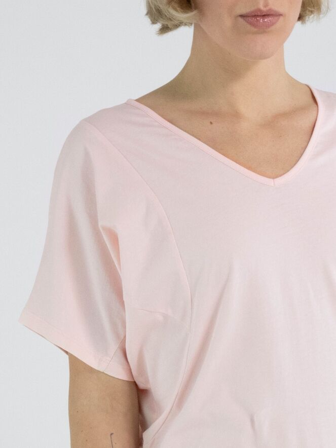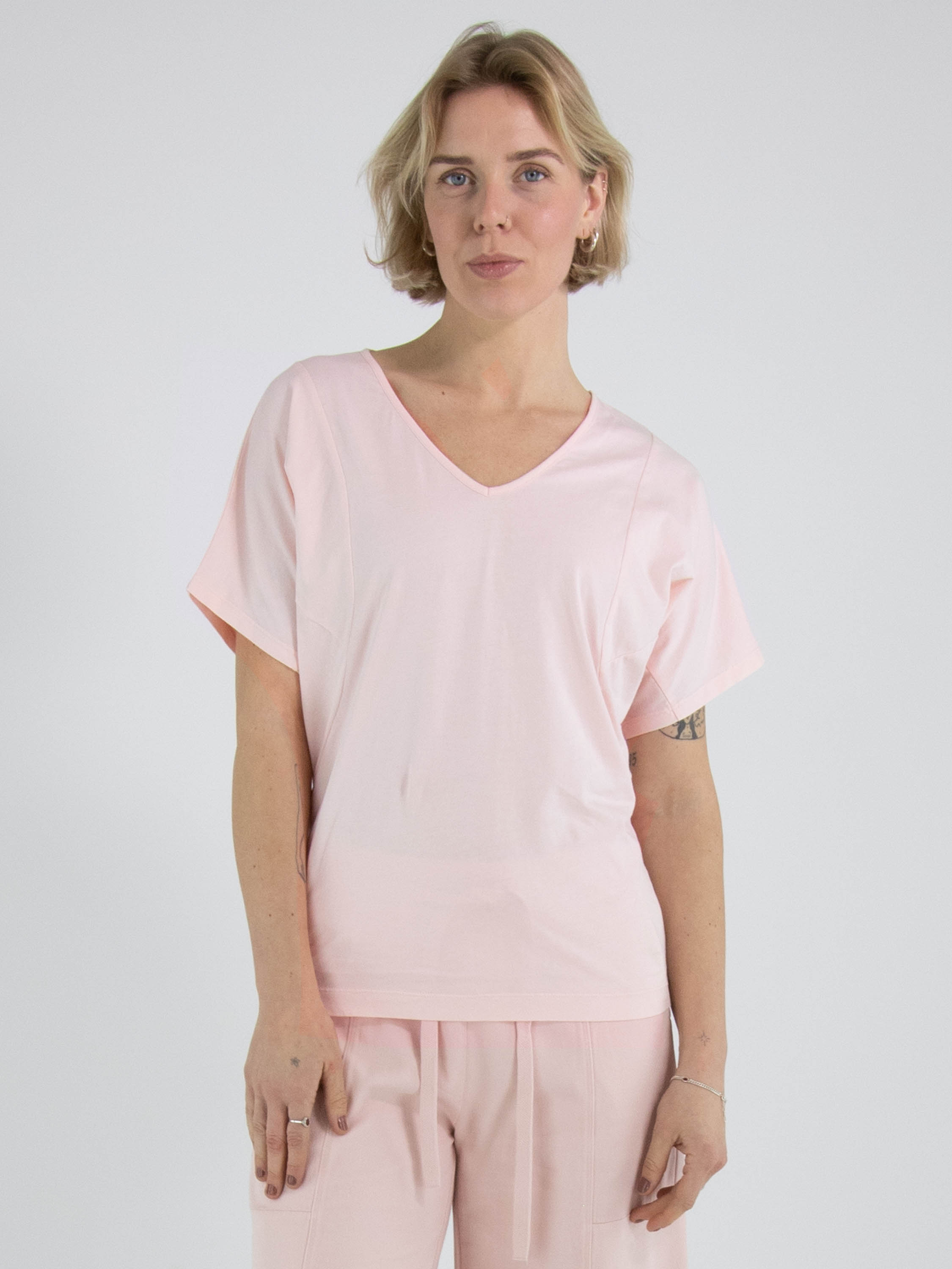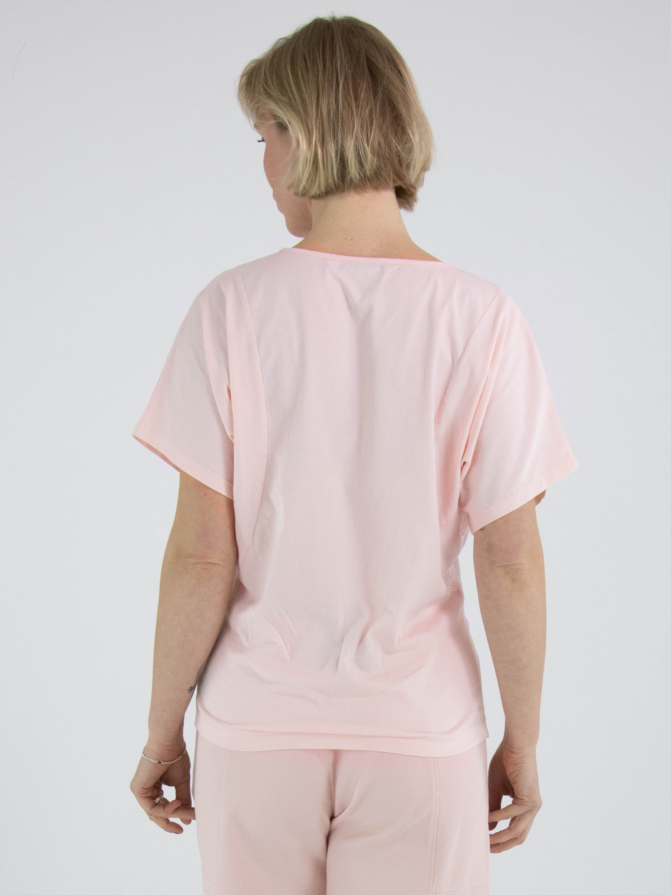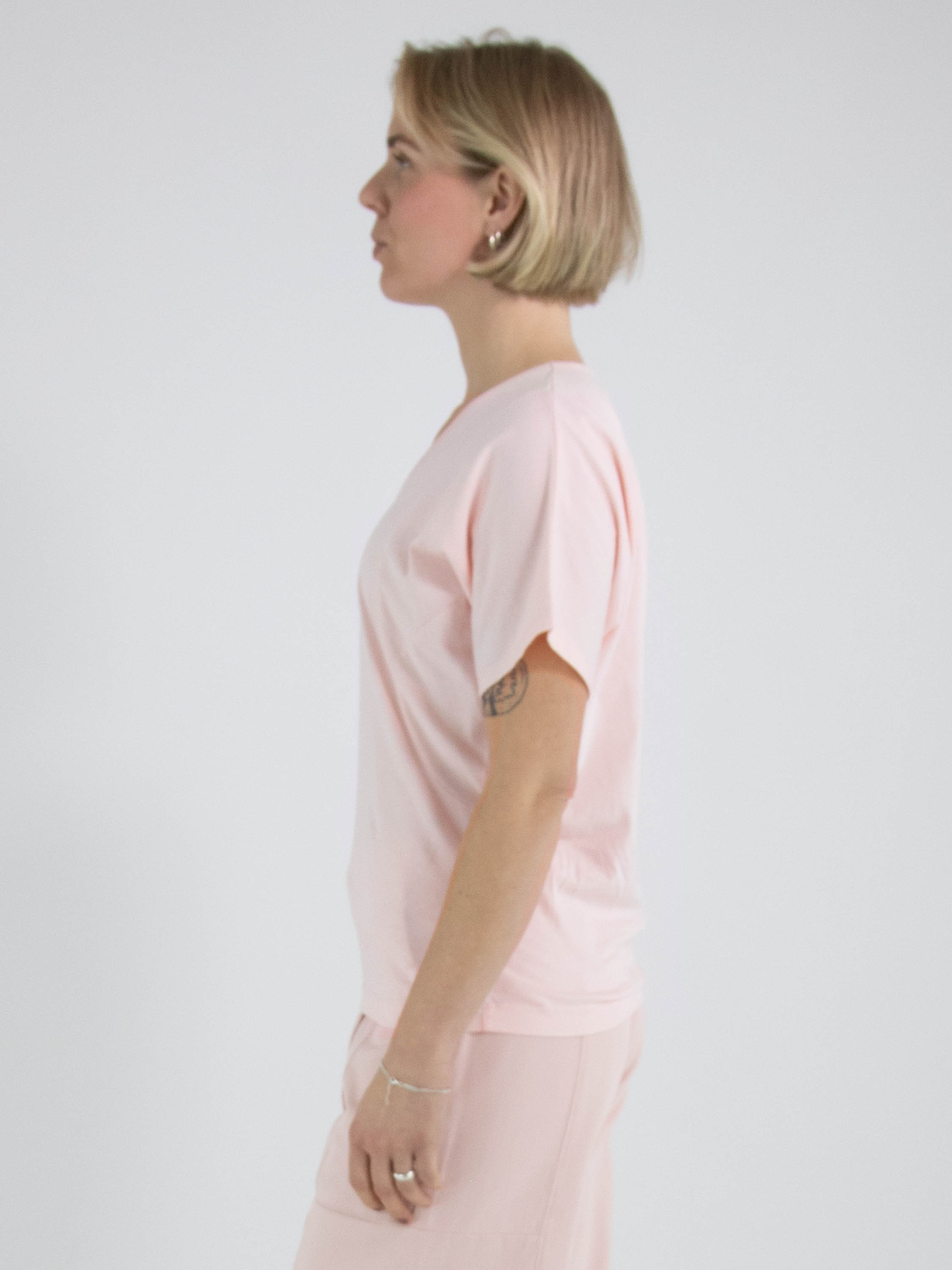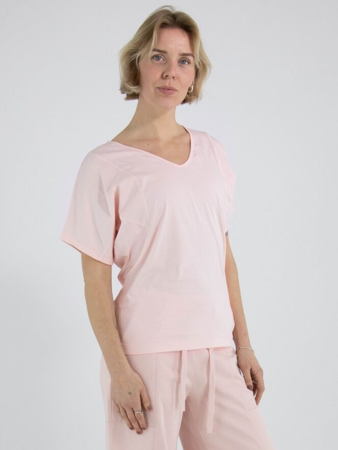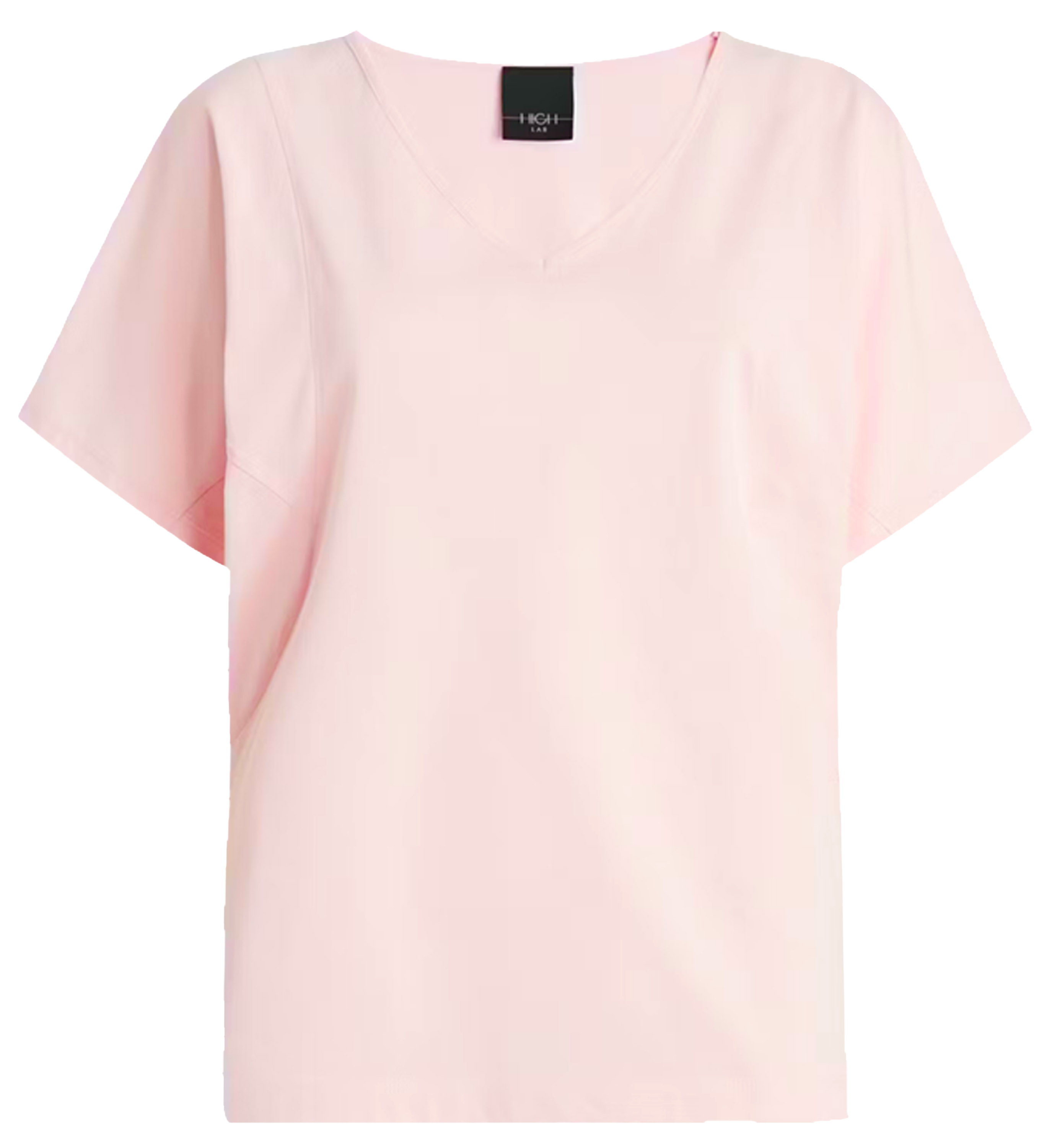 Un shirt de High Lab de couleur rose pastel. Le shirt possède des manches courtes et un col en V. Ce shirt peut être lavé à la main.