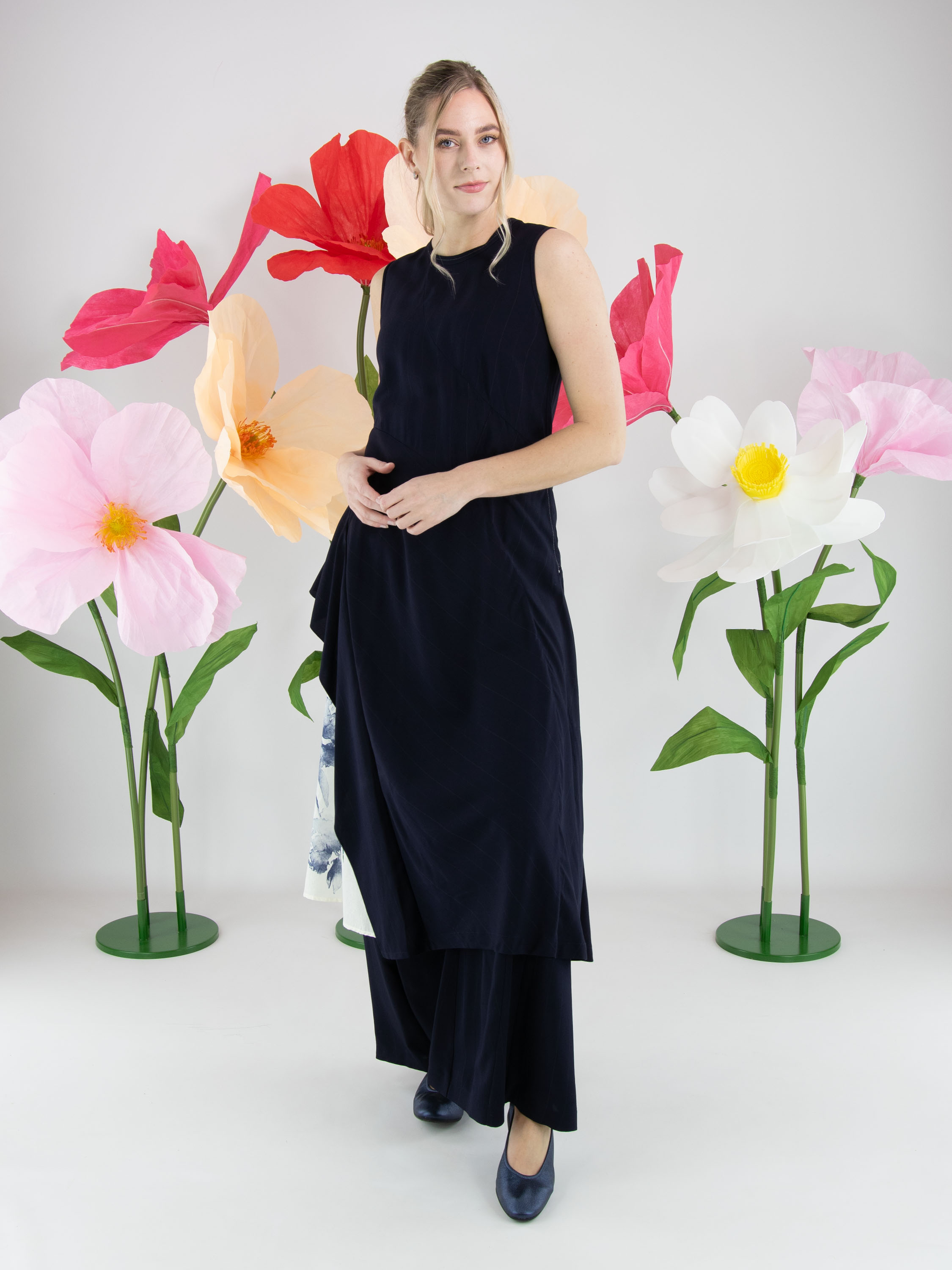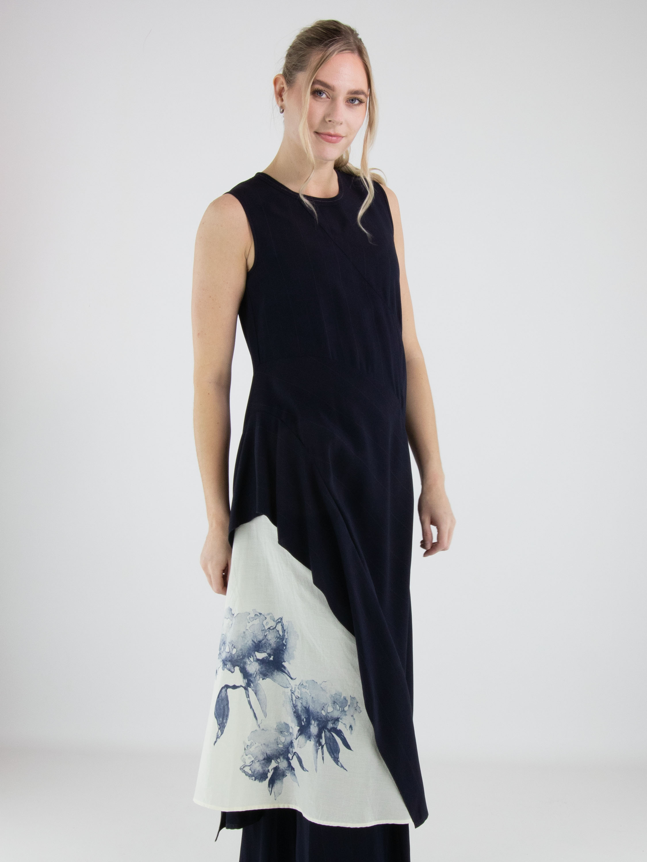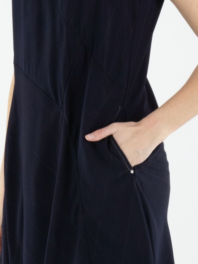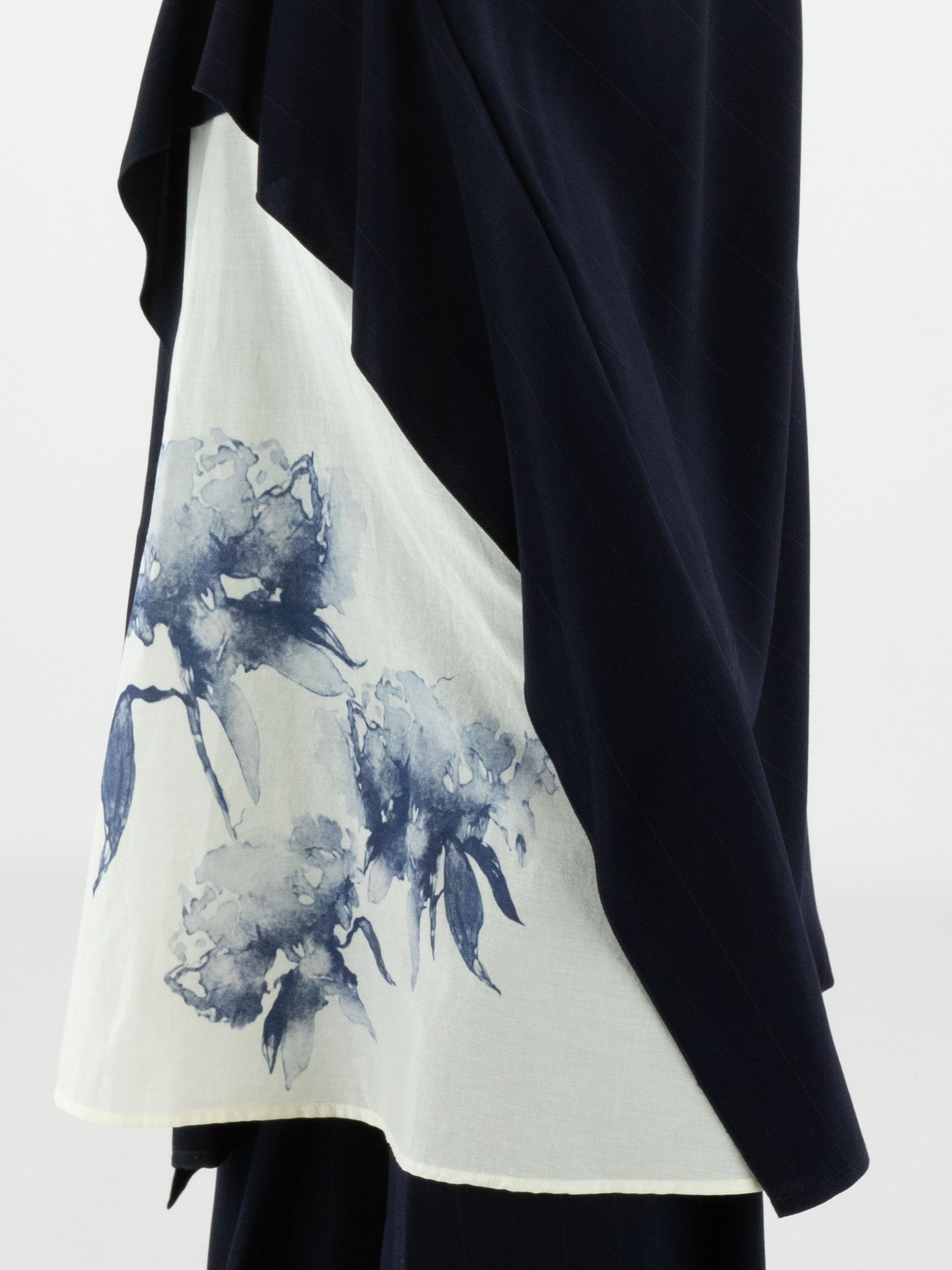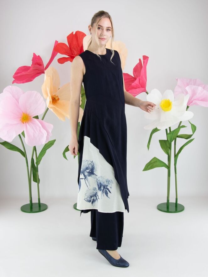 Robe de High dans un motif à fines rayures ton sur ton en deux nuances de bleu marine. Elle présente un col rond et une courte fermeture zippée au dos descendant sous les omoplates. Des coutures diagonales partant de l’encolure et de la taille structurent subtilement la silhouette. À partir de la hanche, un empiècement blanc crème orné d’un imprimé graphique d’orchidées dans plusieurs tons de bleu marine crée un contraste artistique affirmé. Une poche discrète est intégrée à la taille sur le côté gauche. Cette robe de créateur exclusive ne doit pas être lavée.
