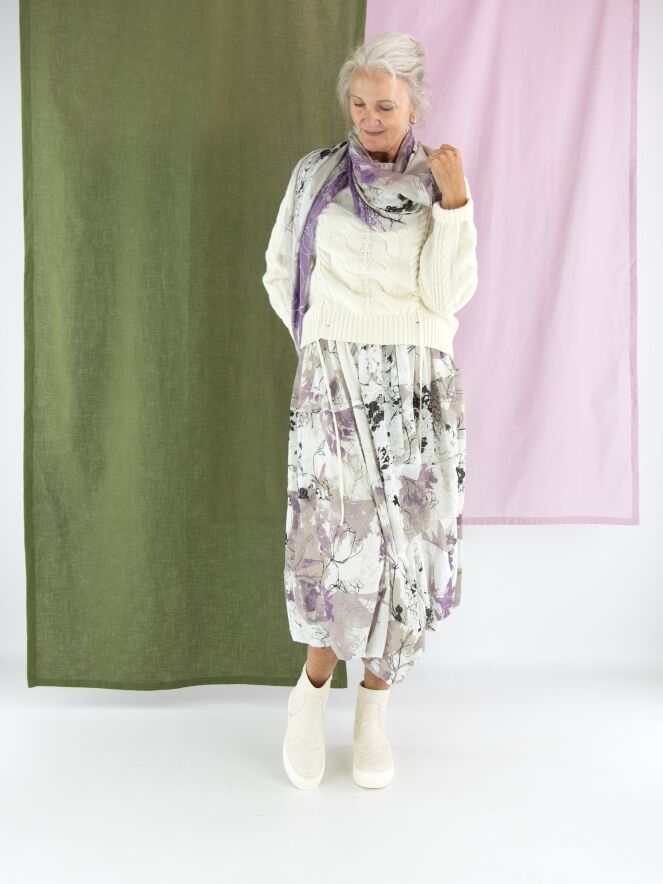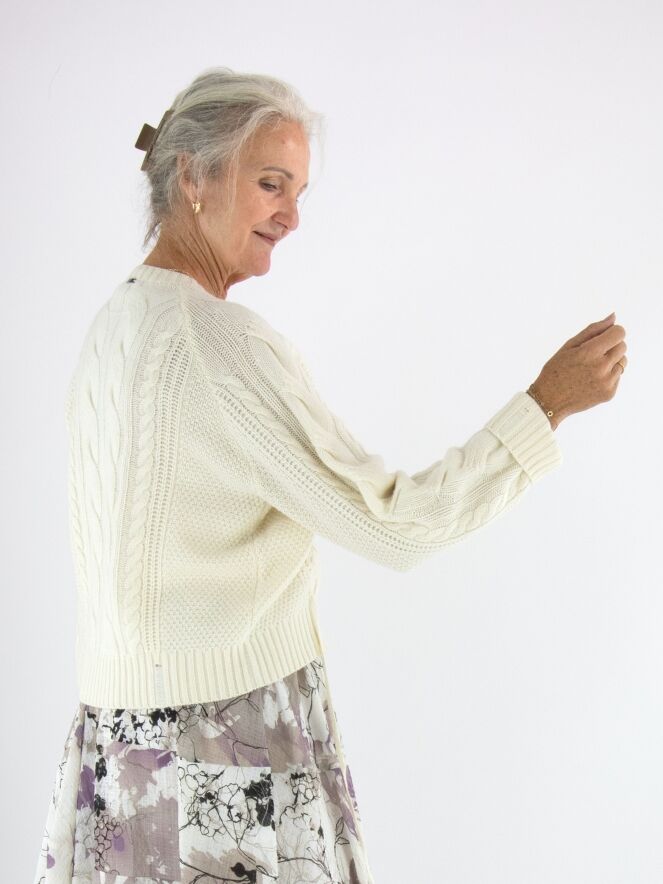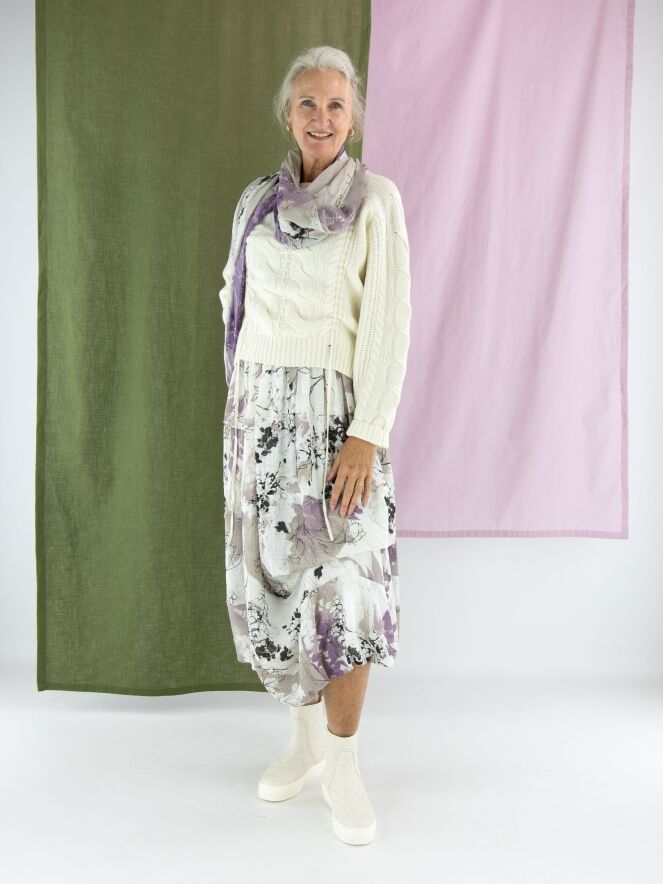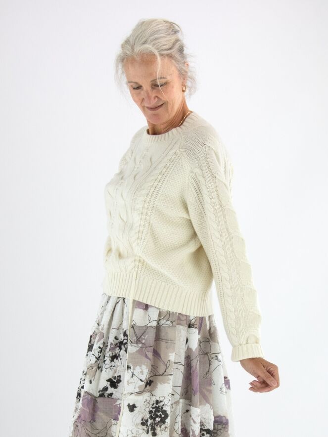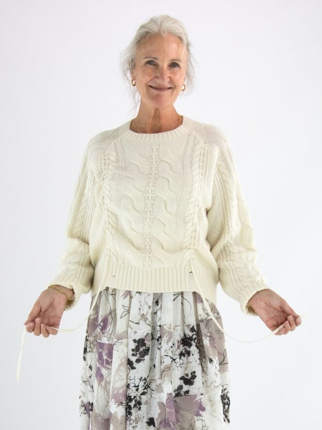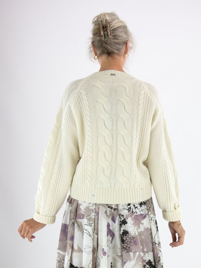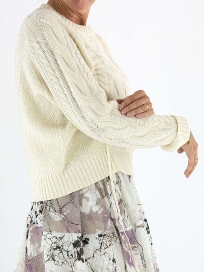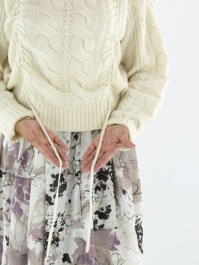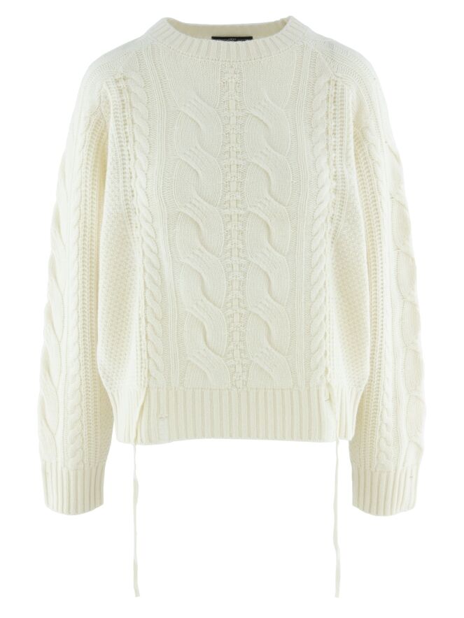Un pull torsadé de luxe de High en blanc crème. Le pull présente une encolure ronde et deux rubans partent du motif à l’avant pour descendre jusqu’à l’ourlet. Ce pull doit être lavé à la main.