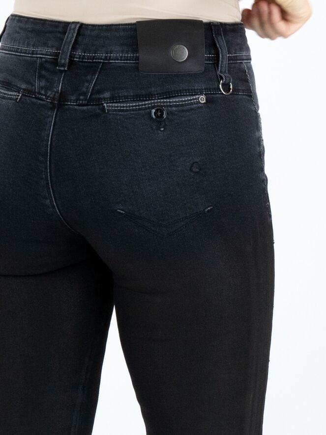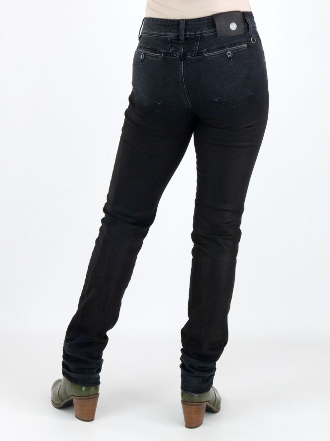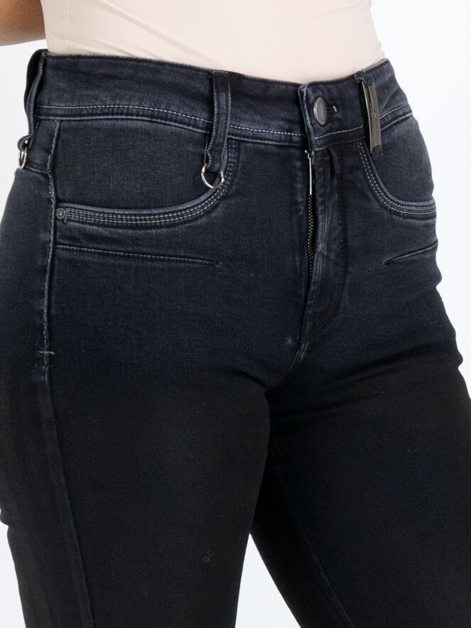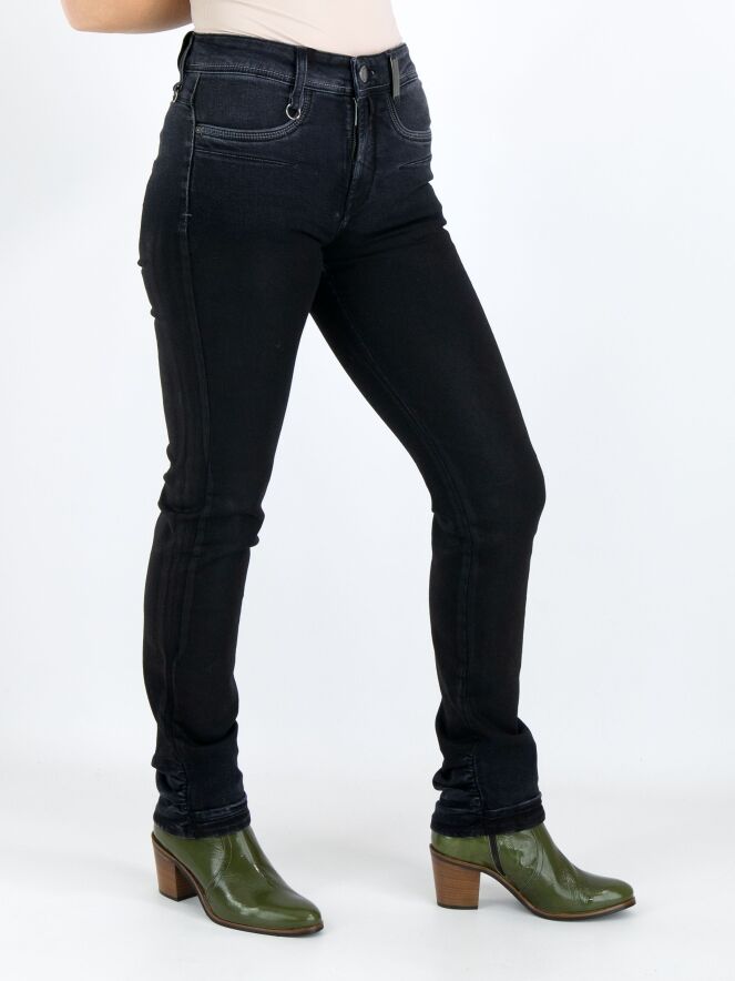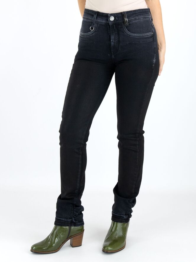 Un jean skinny ciré de High en couleur anthracite. Le long des bords arrondis des poches, plusieurs coutures décoratives blanches sont présentes. En bas des jambes, à l'avant, il y a une couture avec une bordure en relief. Ce jean peut être lavé à la main.