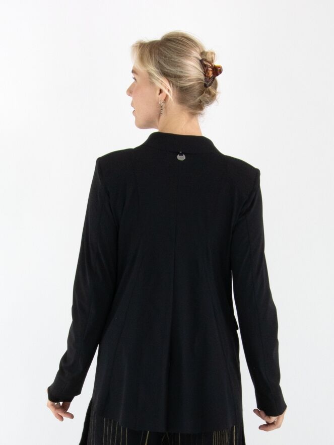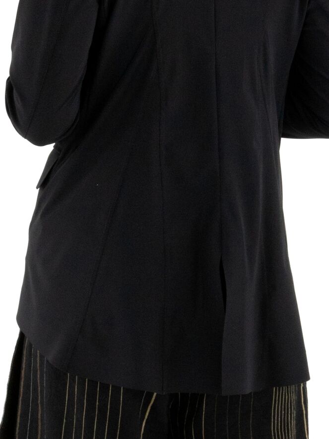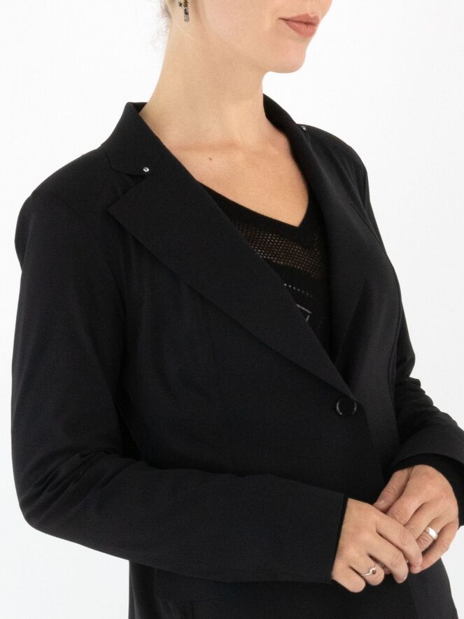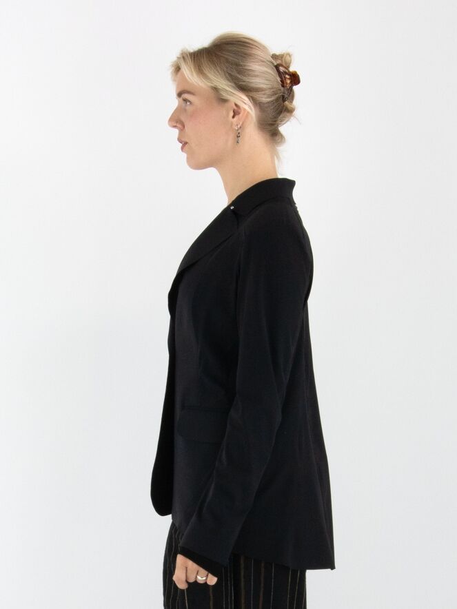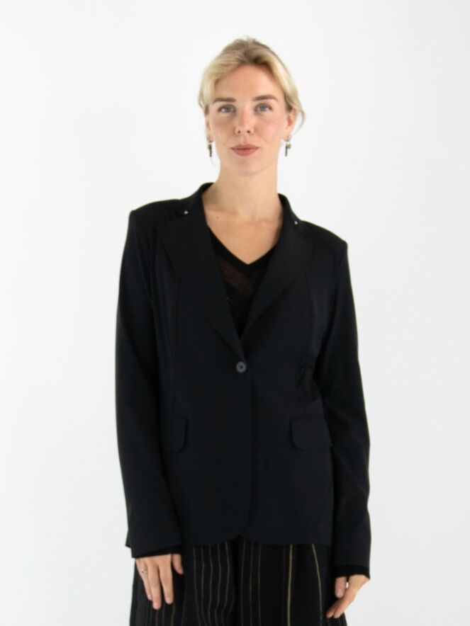 Blazer noir de la marque High. Il se ferme avec un seul bouton. Deux clous argentés ornent le col au niveau de l'encolure. Une fente est placée au centre du bas du dos. Le blazer est non doublé et doit être lavé à la main.