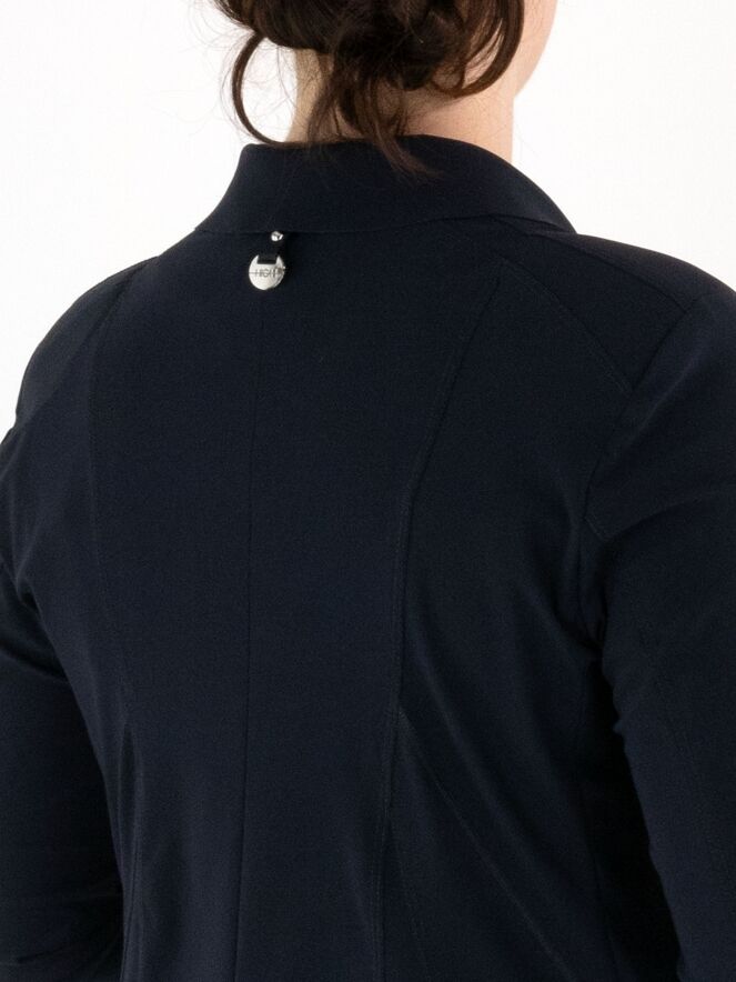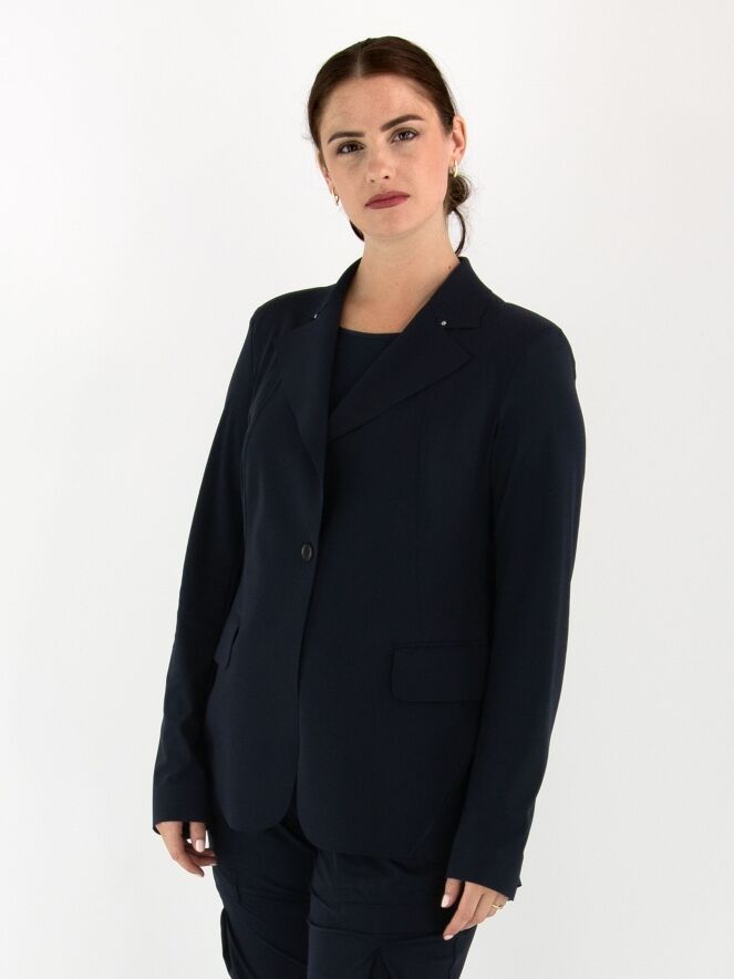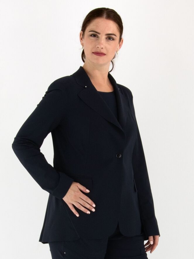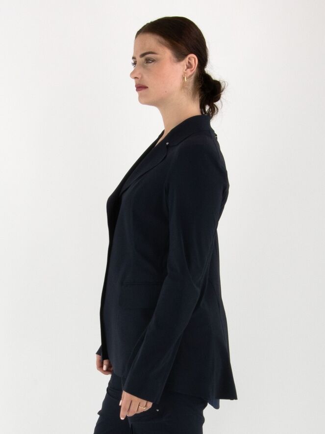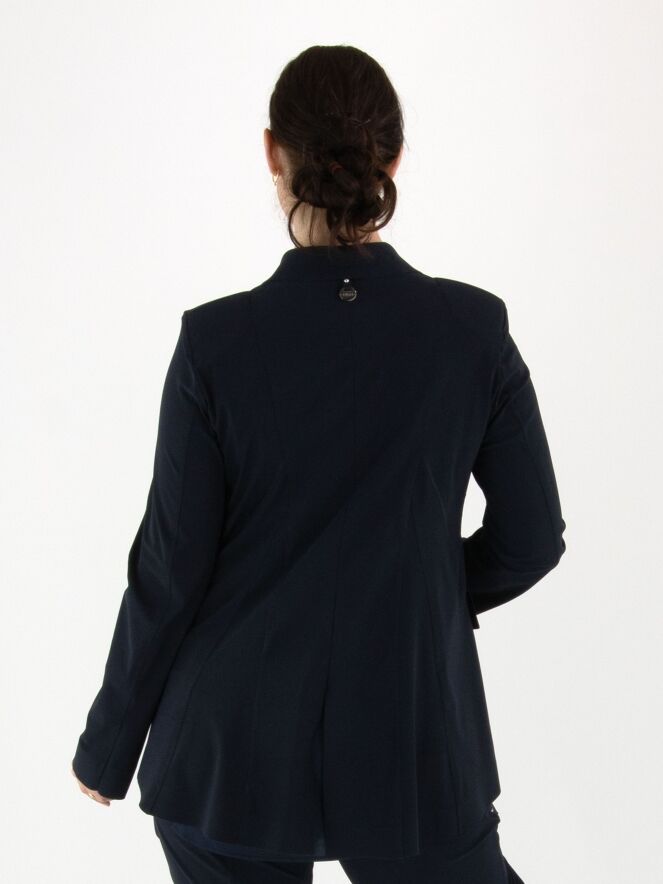 Blazer bleu marine de la marque High. Il se ferme par un seul bouton. Deux clous argentés ornent le col au niveau de l’encolure. Une fente est placée au centre du dos, en bas. Ce blazer est non doublé et se lave à la main.