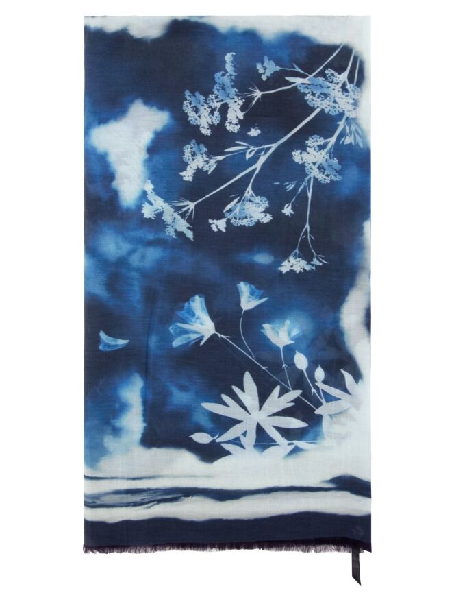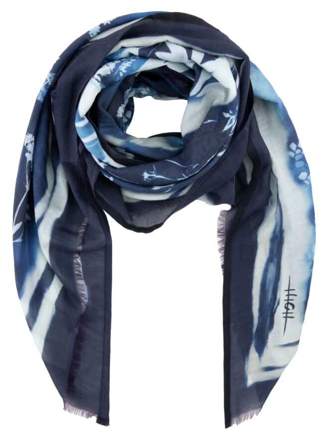 Un châle luxueux et légèrement transparent de High avec un imprimé floral façon batik dans plusieurs nuances de bleu. Les bords du châle sont finement effilochés. Ce châle ne doit pas être lavé.