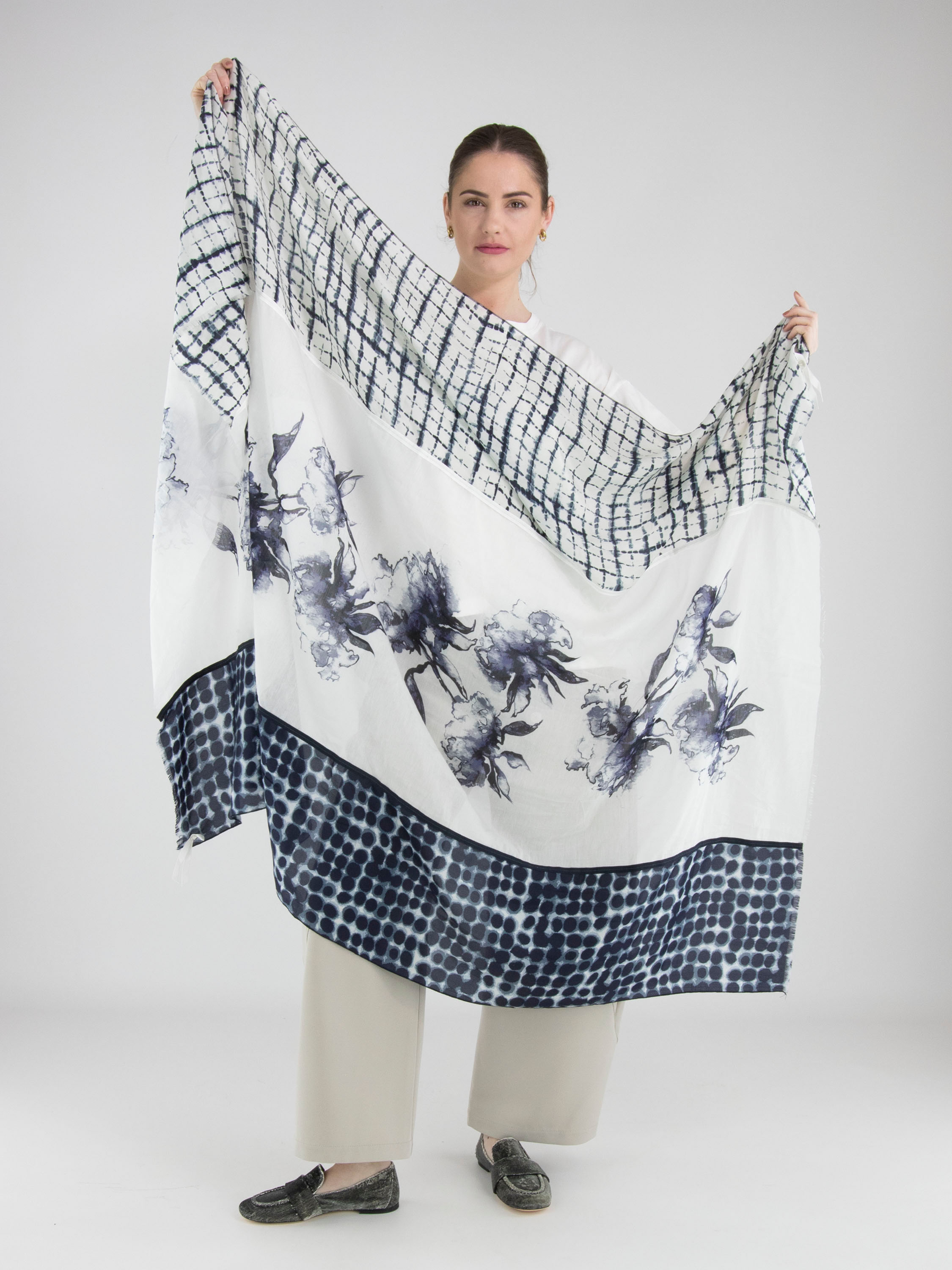 Un châle luxueux et légèrement transparent de High avec un double imprimé. La partie centrale présente un imprimé floral graphique façon aquarelle, tandis que les deux extrémités sont ornées d’un imprimé en blocs avec des motifs circulaires. Le châle est décliné dans plusieurs nuances de bleu associées au blanc crème. Ce châle ne doit pas être lavé.