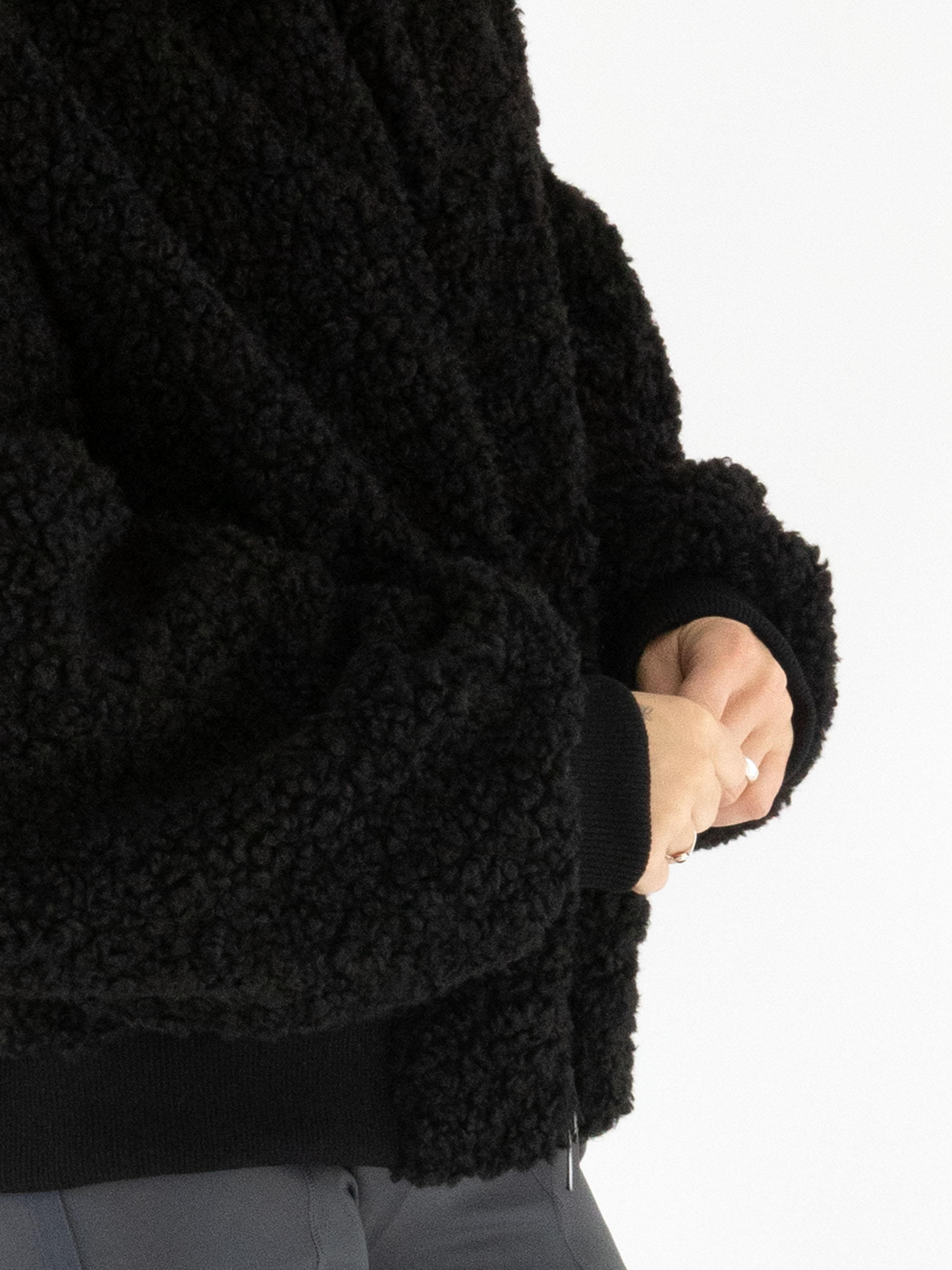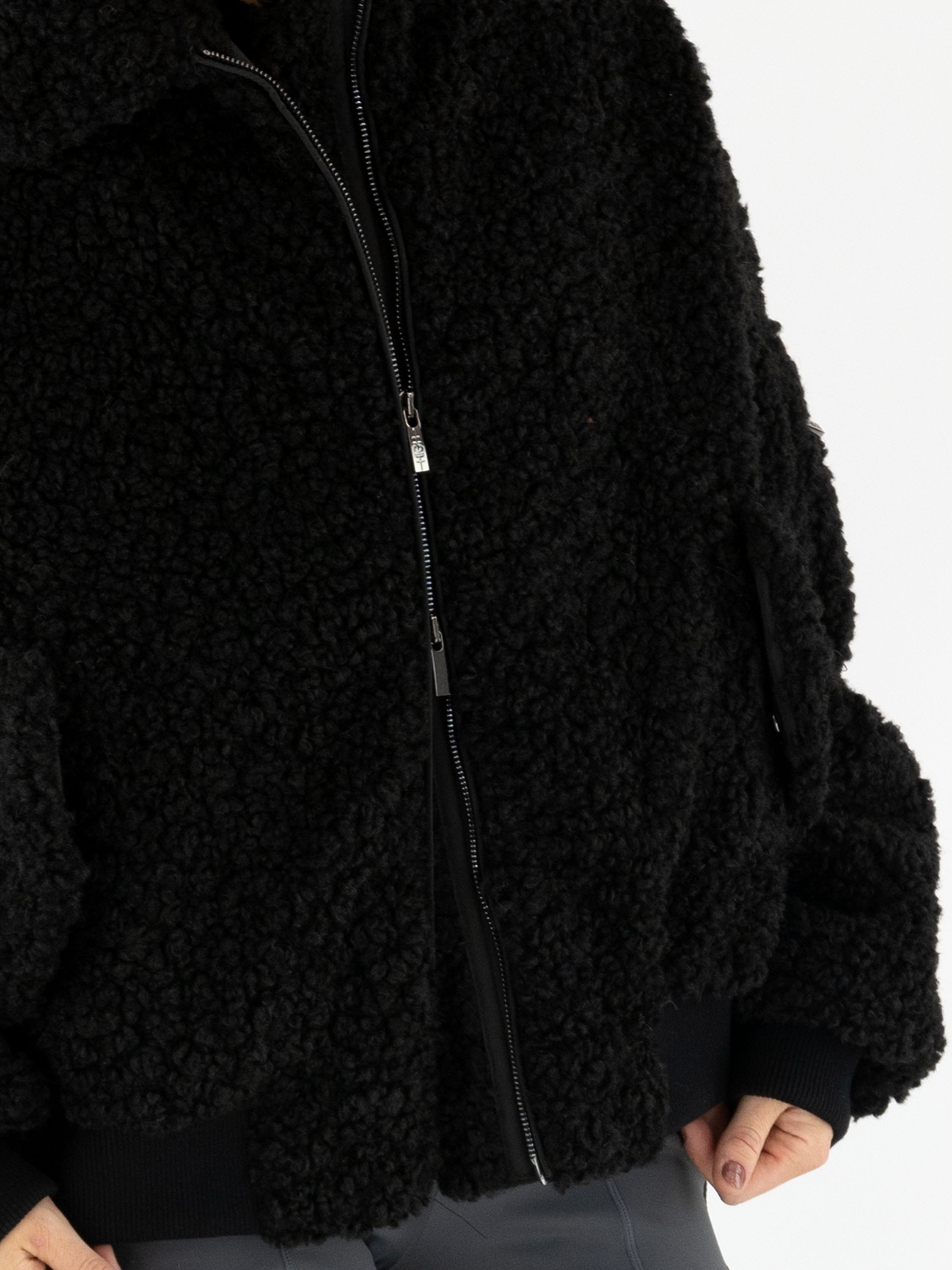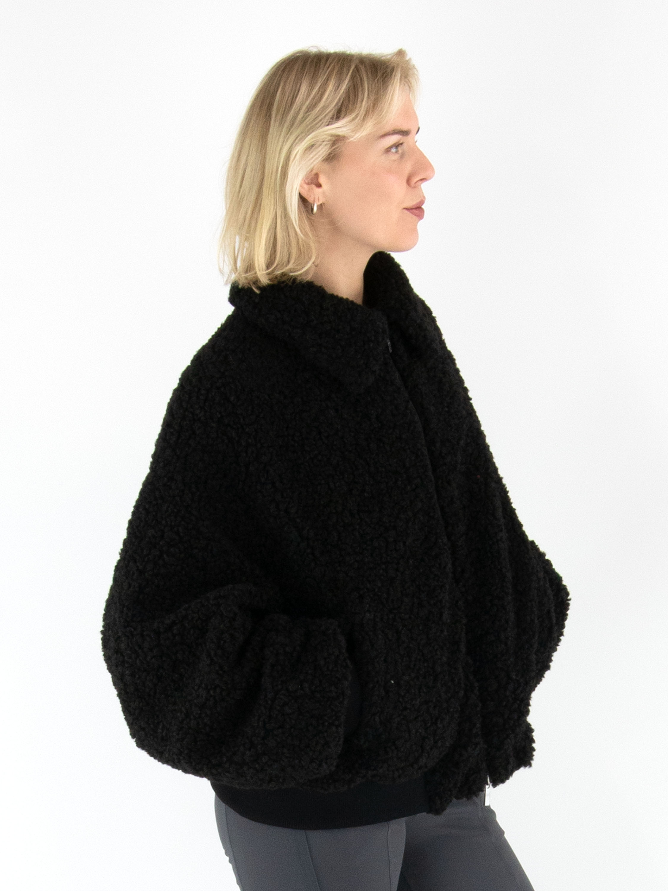 Un manteau court en curly de High en noir. Il se ferme par un zip et possède des poches fendues à hauteur de taille avec un revers. Les poignets et le bas du manteau sont soulignés par une large bordure en tricot finement côtelé, apportant une touche sportive. Ce manteau ne doit pas être lavé.