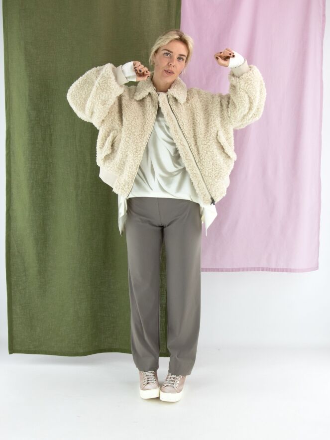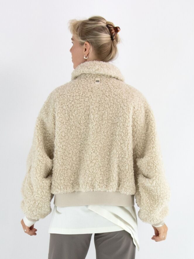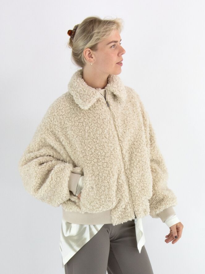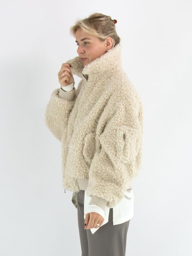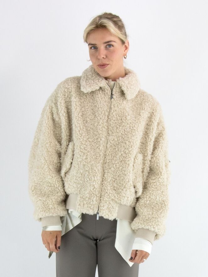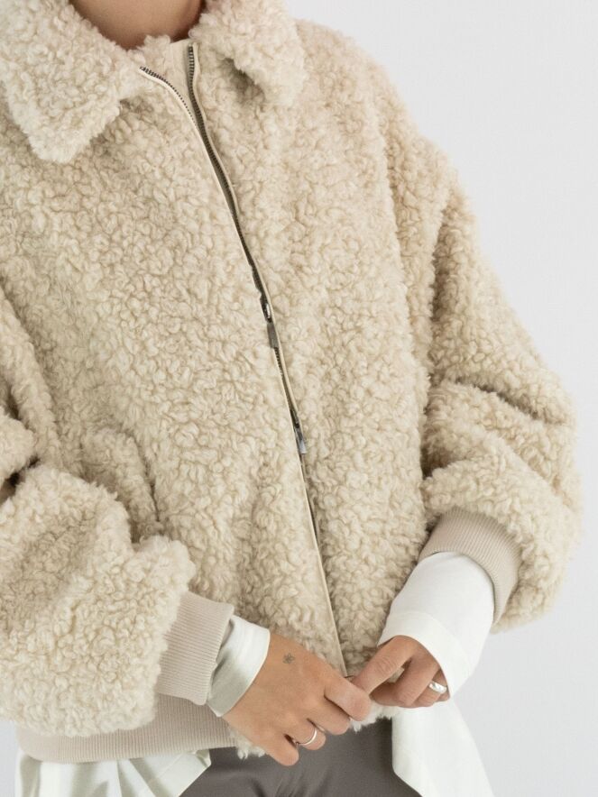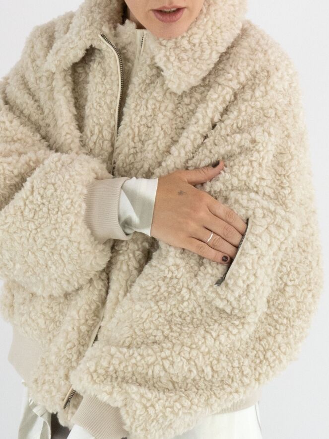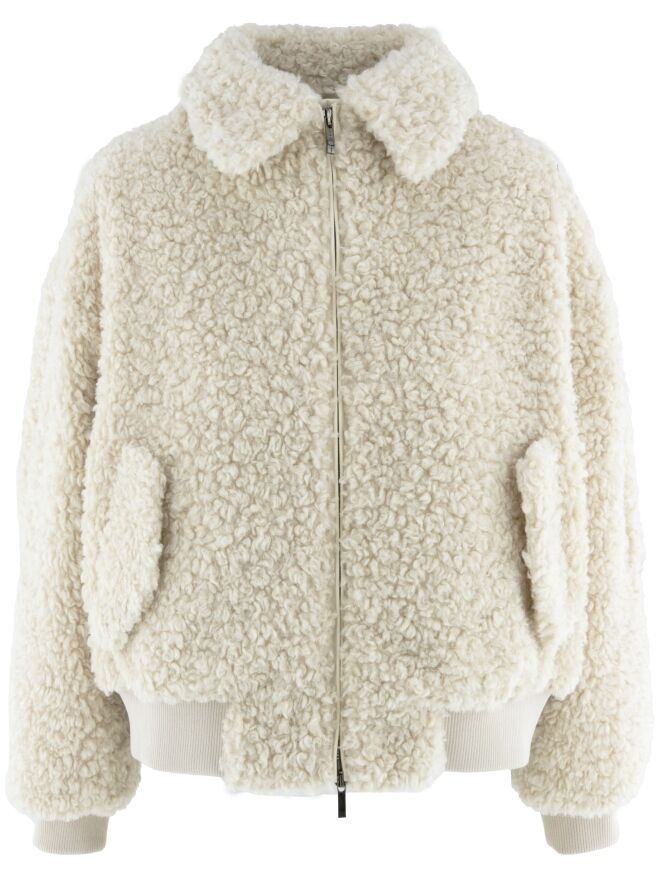 Manteau court en fourrure bouclée de High dans une teinte blanc cassé. Il est doté d’une fermeture zippée et de poches à rabat au niveau de la taille. Les poignets et le bas sont finis avec un large bord en maille côtelée fine. Ce manteau ne doit pas être lavé.