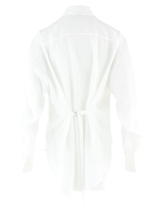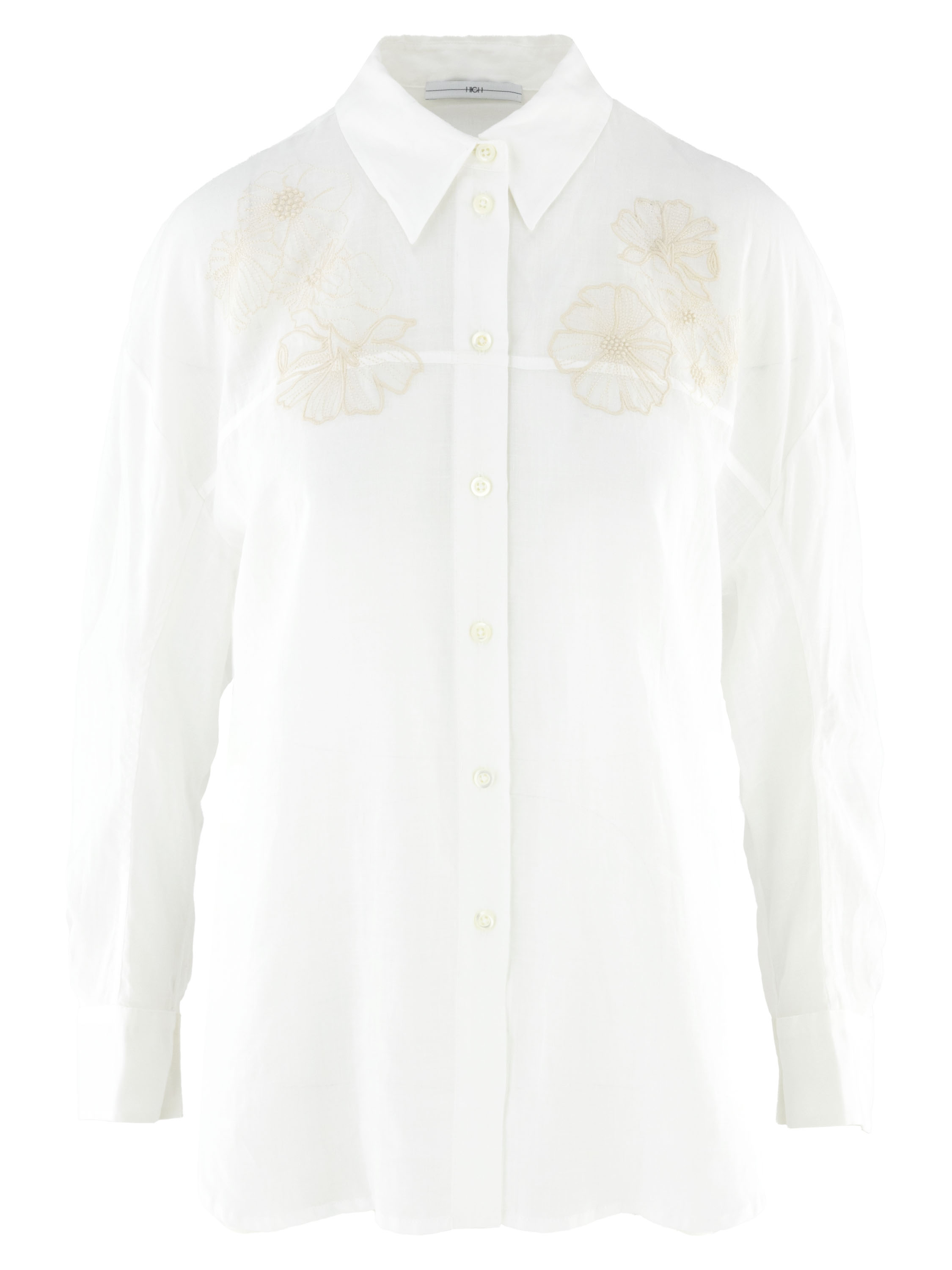 Une blouse ample de High en blanc. Au-dessus de la poitrine, juste sous les épaules, une broderie florale dans une teinte sable est réalisée. À la taille, une ceinture étroite dans le même tissu que la blouse est fixée à l’arrière, permettant de créer un effet cintré au dos. Cette blouse peut être lavée à la main.