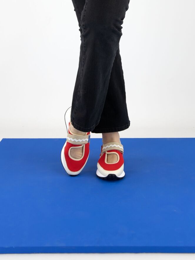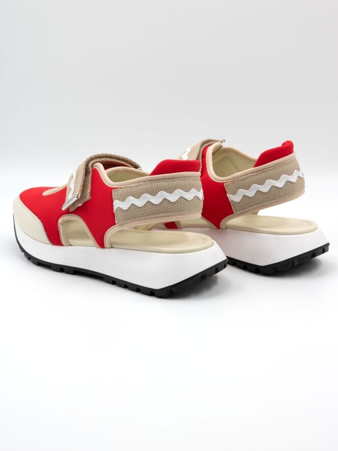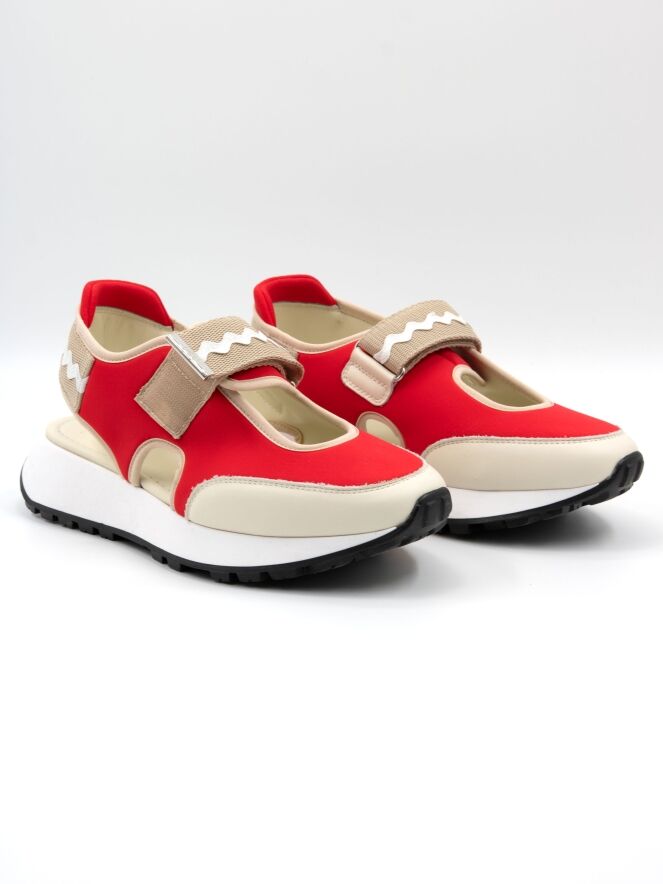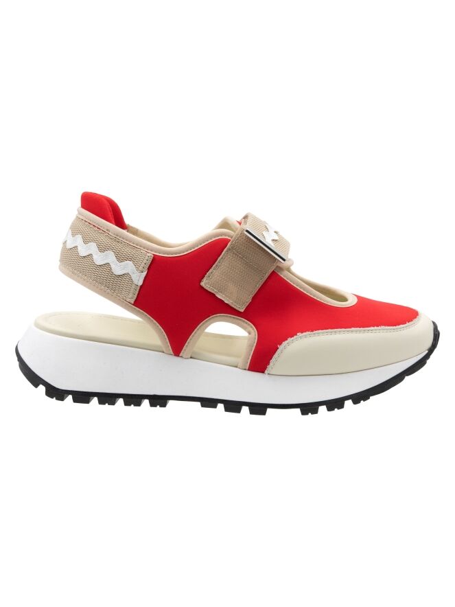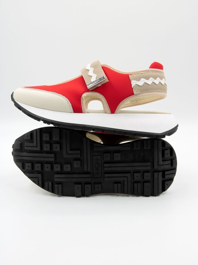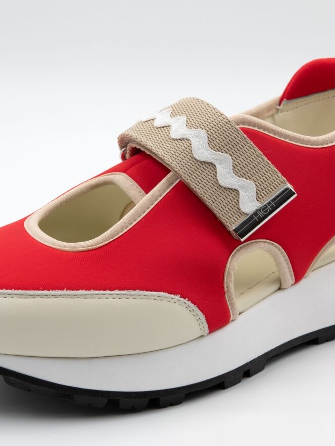 Une basket à talon ouvert de High dans les couleurs rouge et sable. Une ouverture se trouve au milieu de l'avant-pied. Les bords sont ornés d'une bordure en cuir couleur sable. Une fermeture à scratch traverse l'avant-pied. La semelle est d'une couleur blanche éclatante.