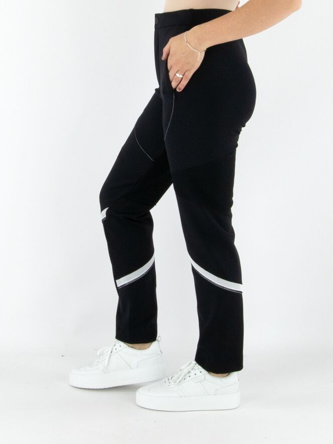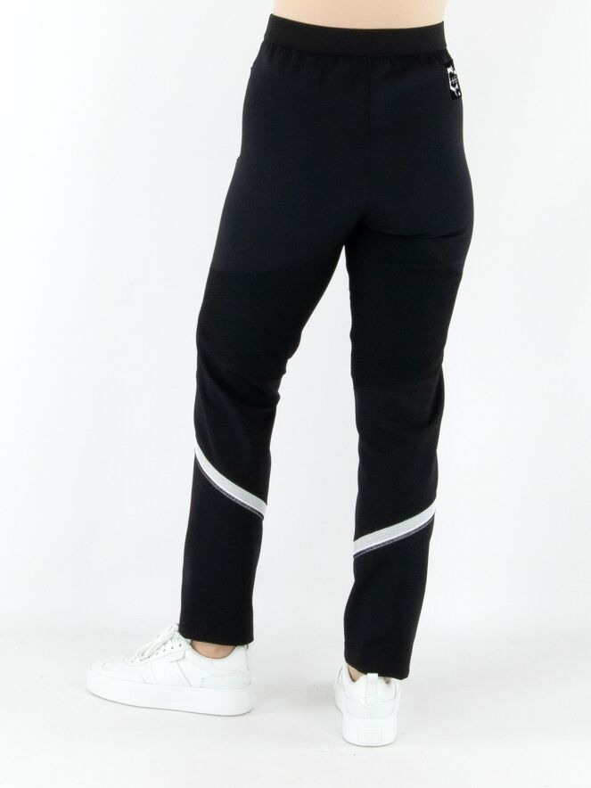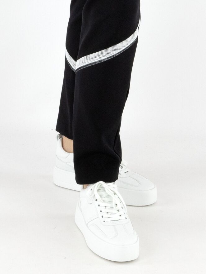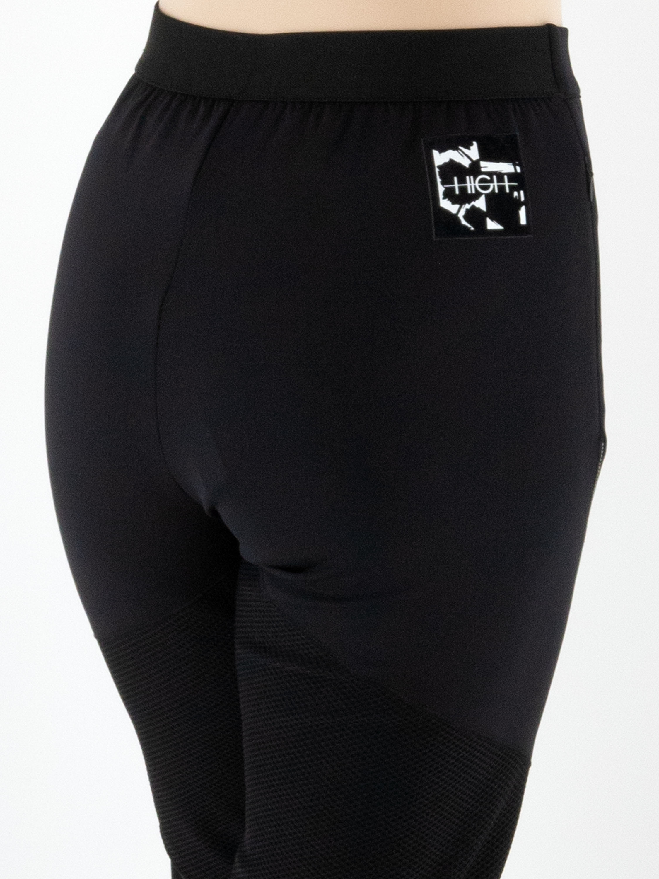 Pantalon de High en noir classique. La ceinture élastique assure un confort optimal, tandis que les poches latérales sont dotées de fermetures zippées pratiques. Au niveau des genoux et le long du bas de jambe, un tissu en maille noir et blanc apporte une touche moderne et sportive. Une couture blanche arrondie partant des poches souligne ce design contemporain. Ce pantalon de créateur exclusif doit être lavé à la main.