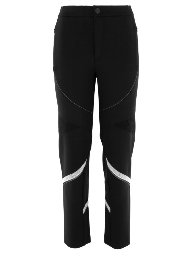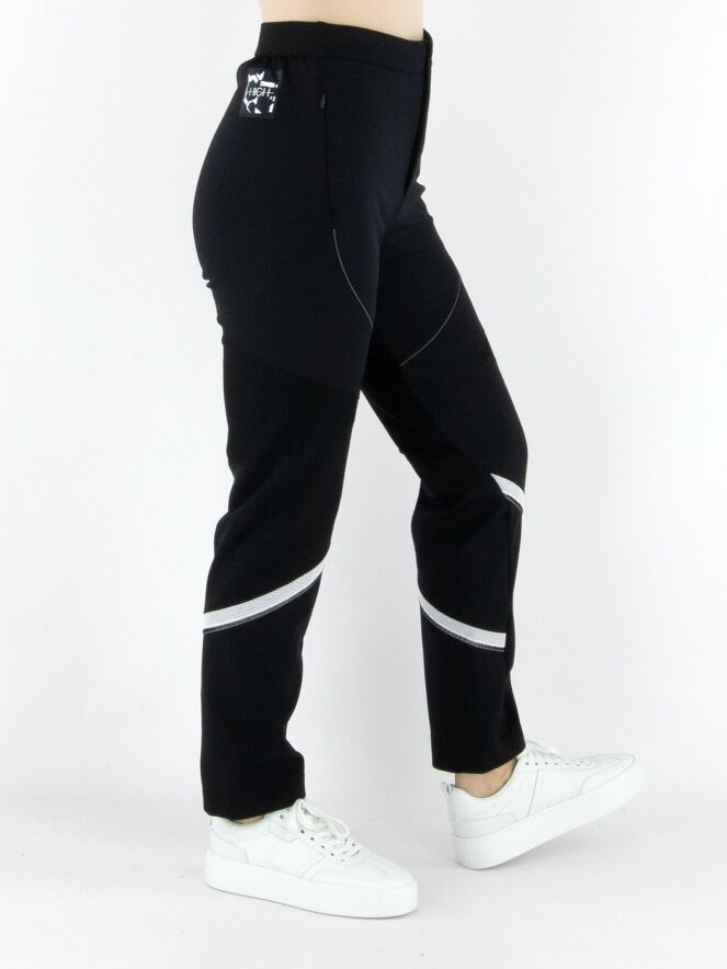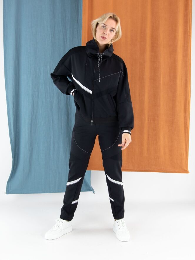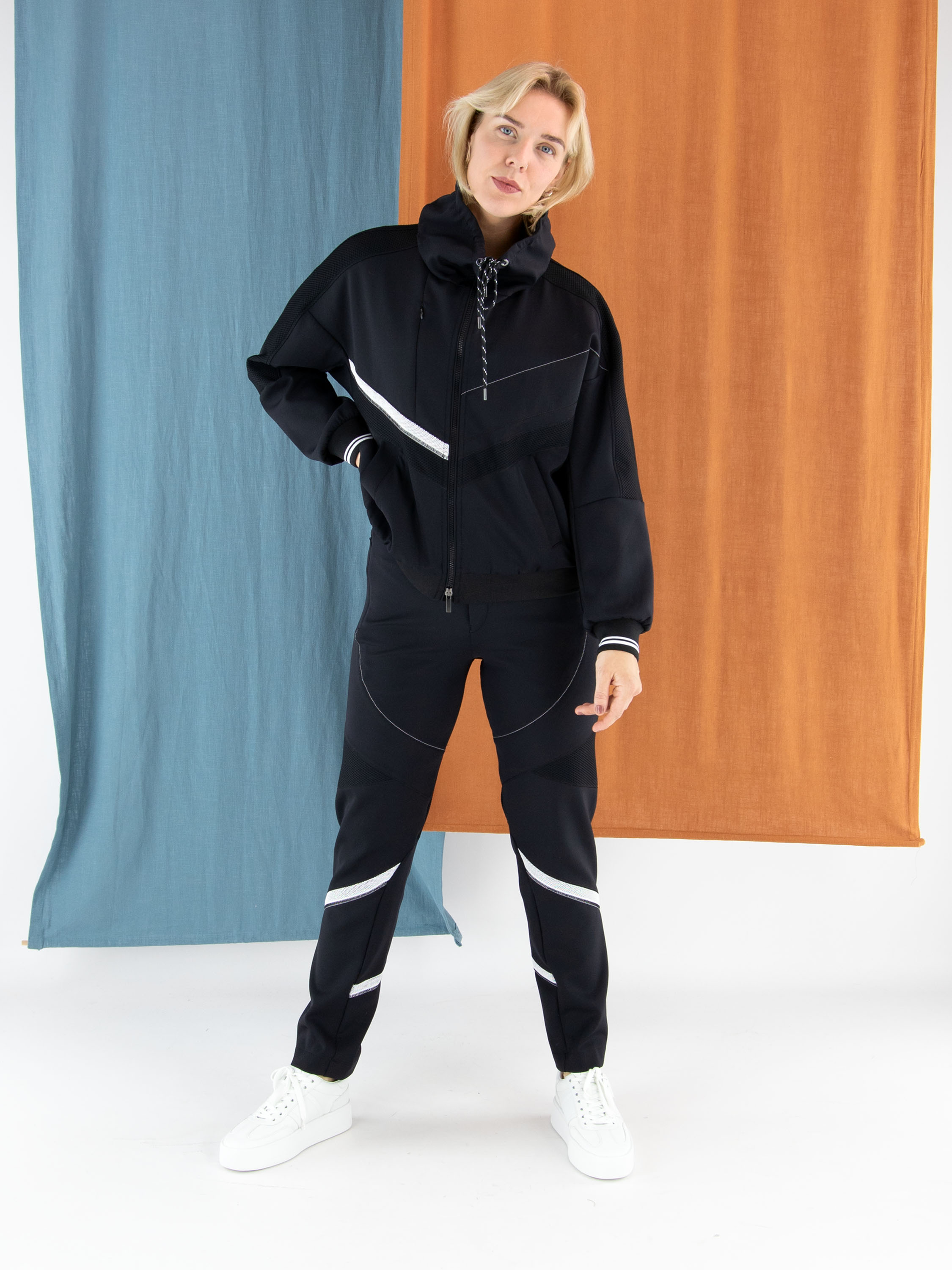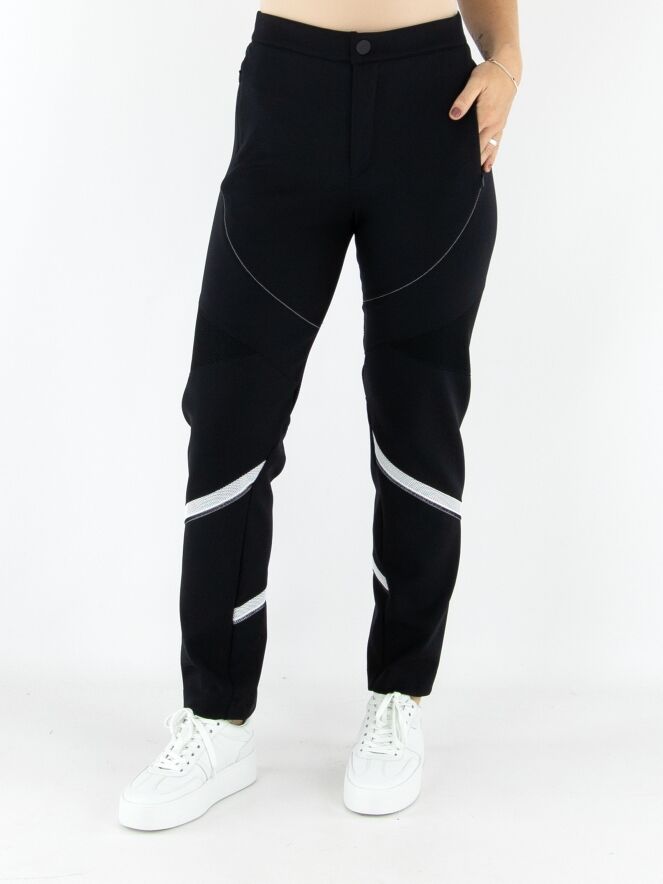 Pantalon de High en noir classique. La ceinture élastique assure un confort optimal, tandis que les poches latérales sont dotées de fermetures zippées pratiques. Au niveau des genoux et le long du bas de jambe, un tissu en maille noir et blanc apporte une touche moderne et sportive. Une couture blanche arrondie partant des poches souligne ce design contemporain. Ce pantalon de créateur exclusif doit être lavé à la main.