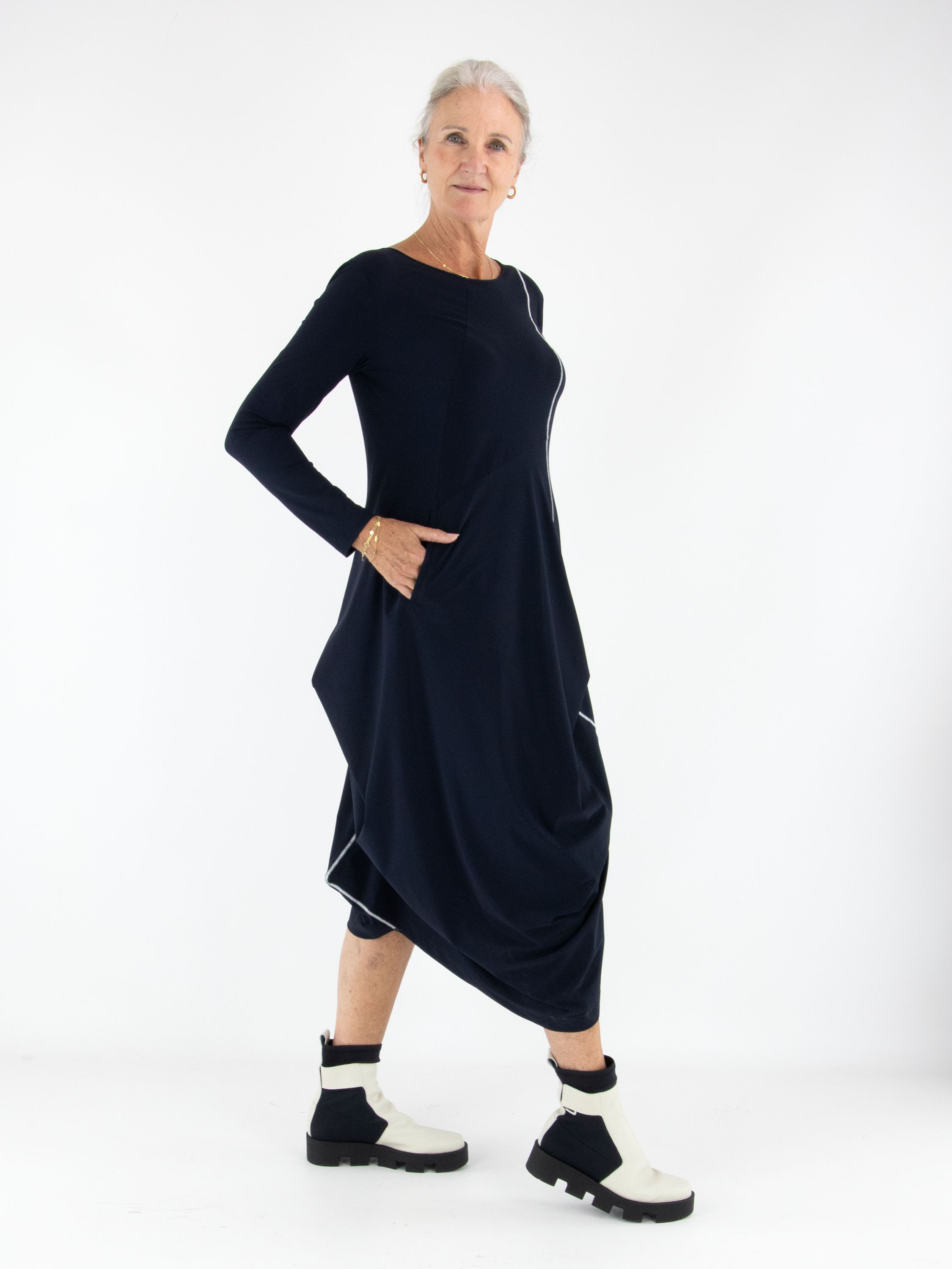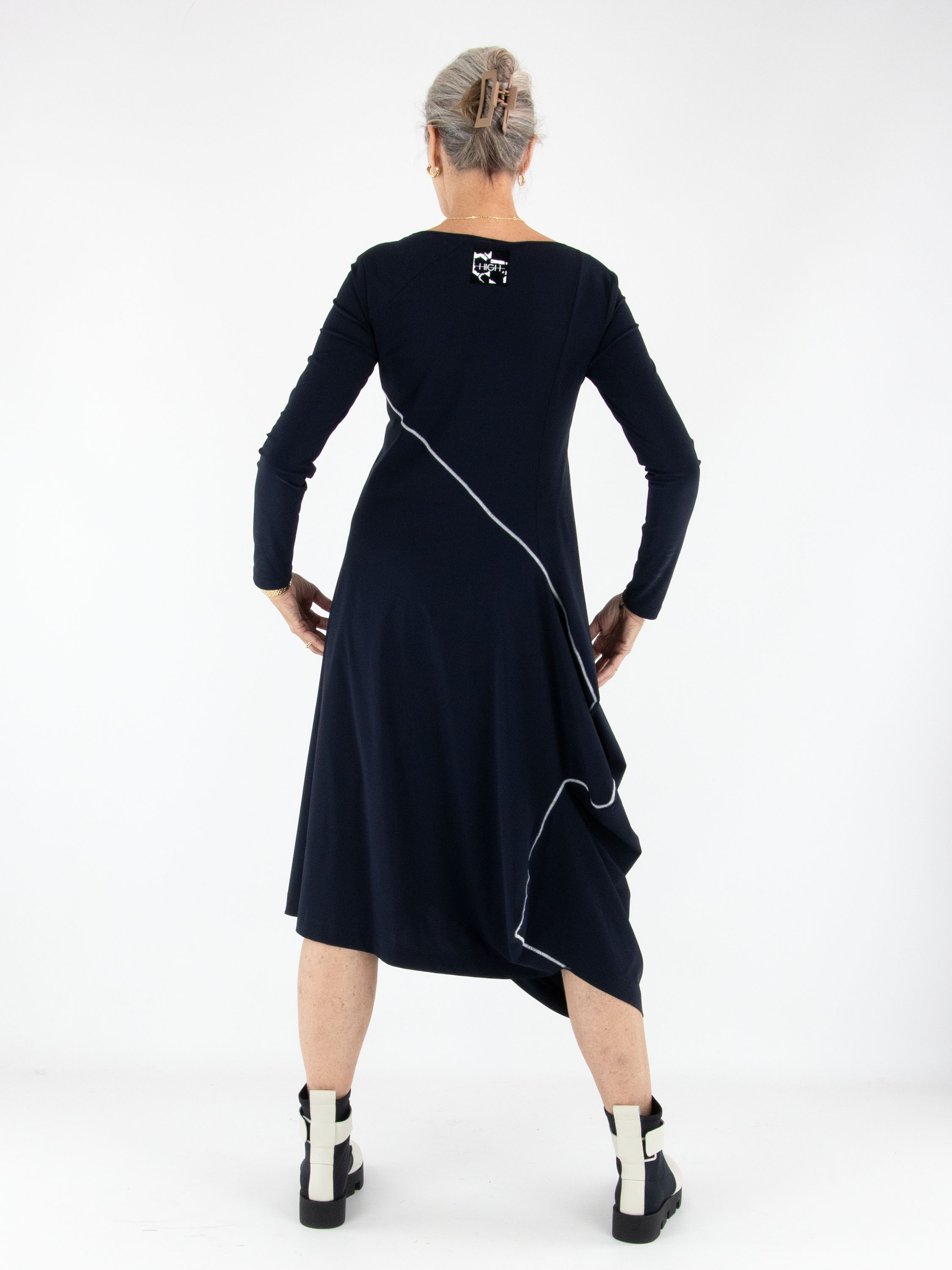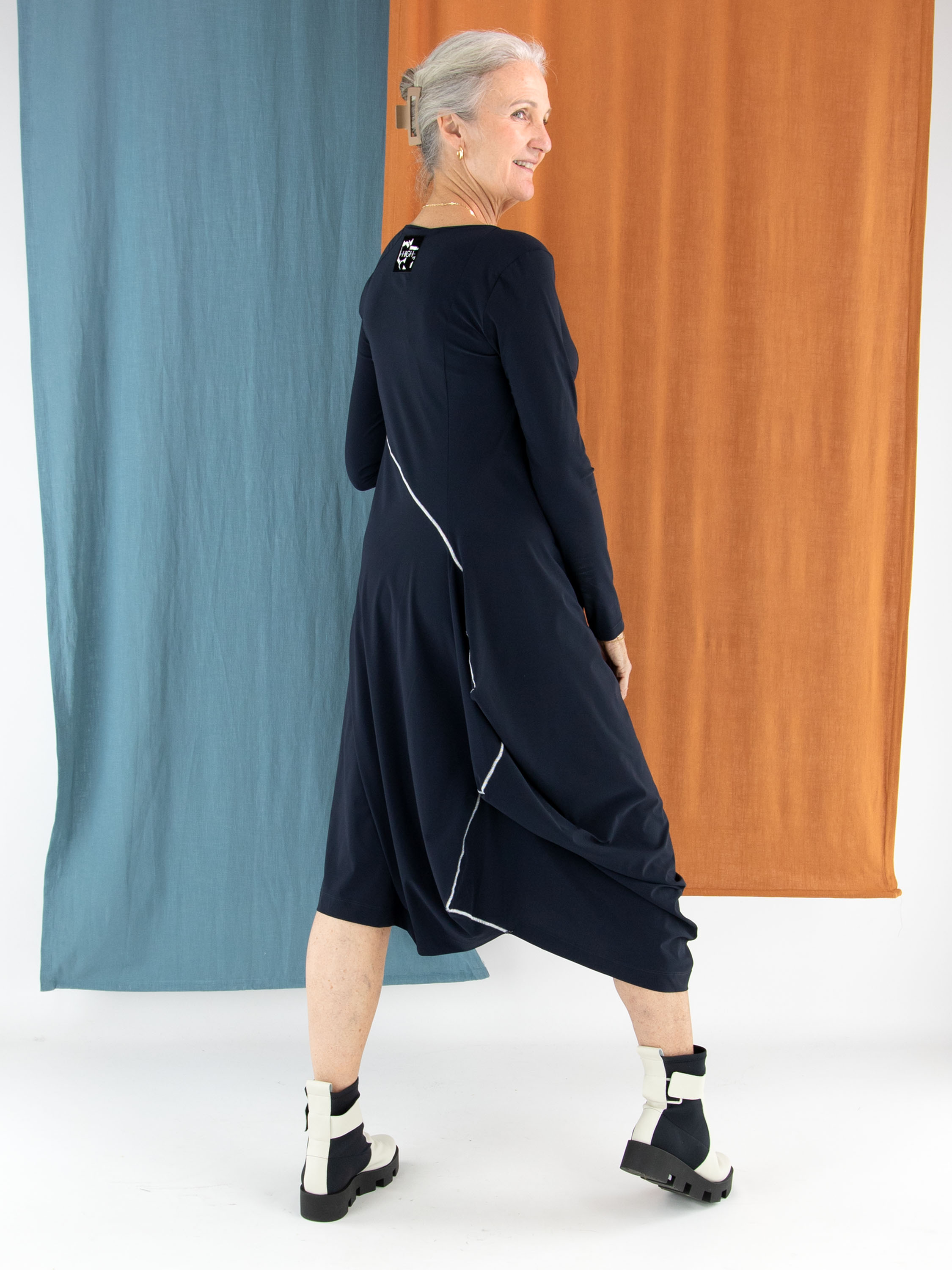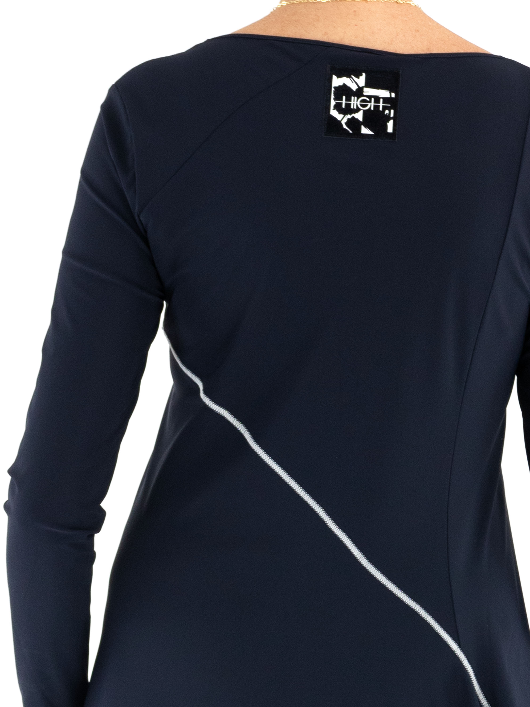 Robe de High en bleu marine. Une couture décorative descend en diagonale depuis l’épaule gauche, apportant une touche moderne et raffinée. À hauteur de taille, une poche discrète est intégrée sur le côté droit. Dotée d’un col rond et de manches longues, cette robe de créateur exclusive peut être lavée à 30 degrés.