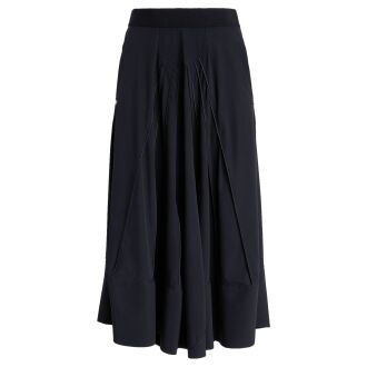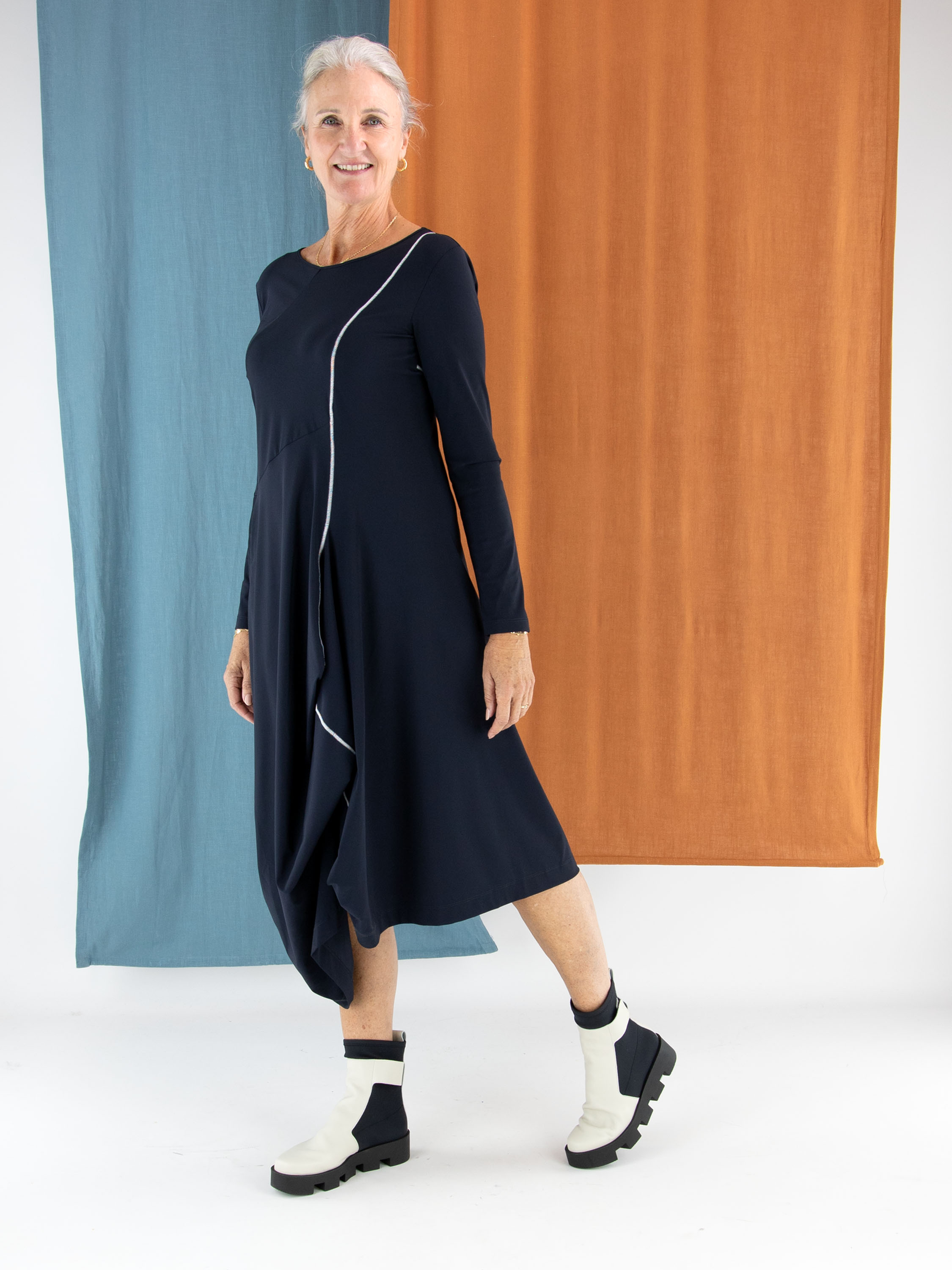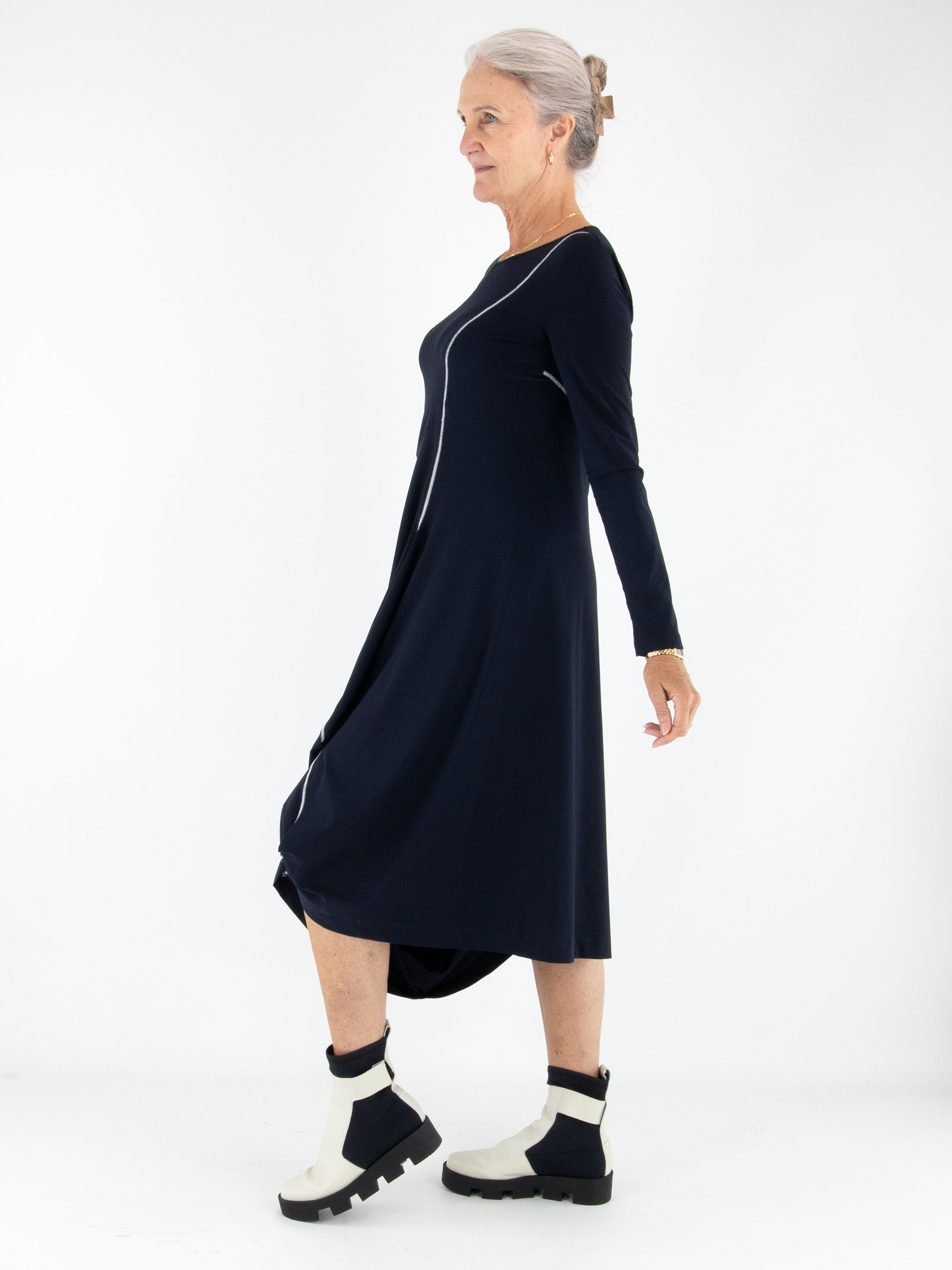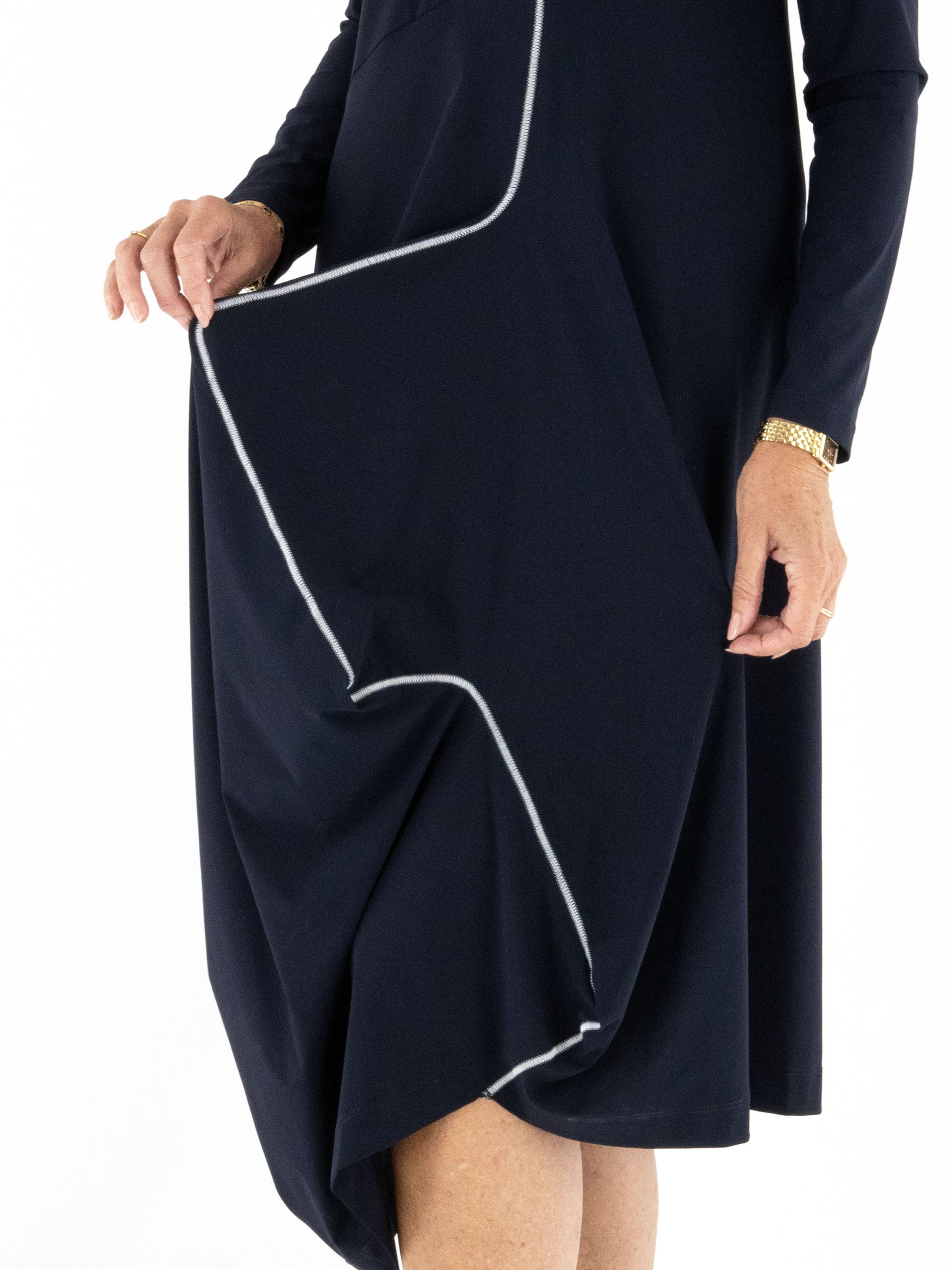 Robe de High en bleu marine. Une couture décorative descend en diagonale depuis l’épaule gauche, apportant une touche moderne et raffinée. À hauteur de taille, une poche discrète est intégrée sur le côté droit. Dotée d’un col rond et de manches longues, cette robe de créateur exclusive peut être lavée à 30 degrés.