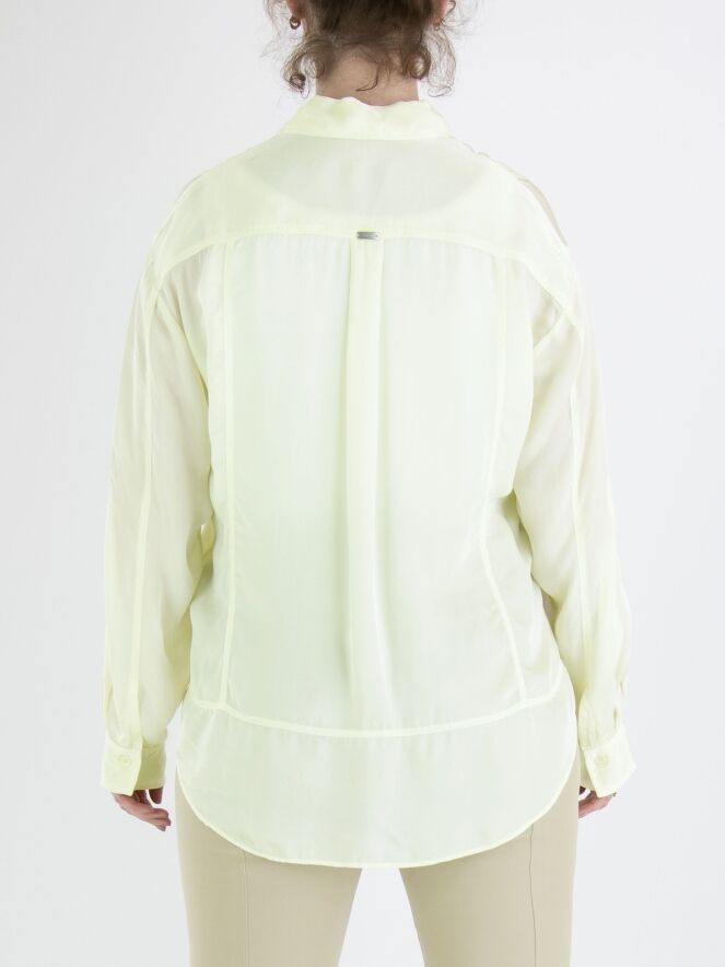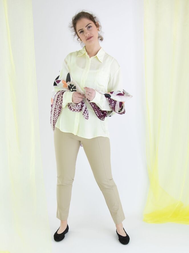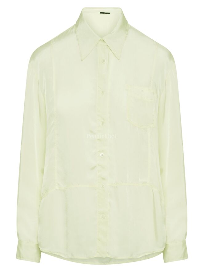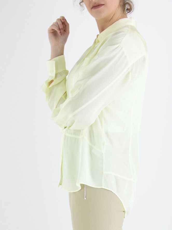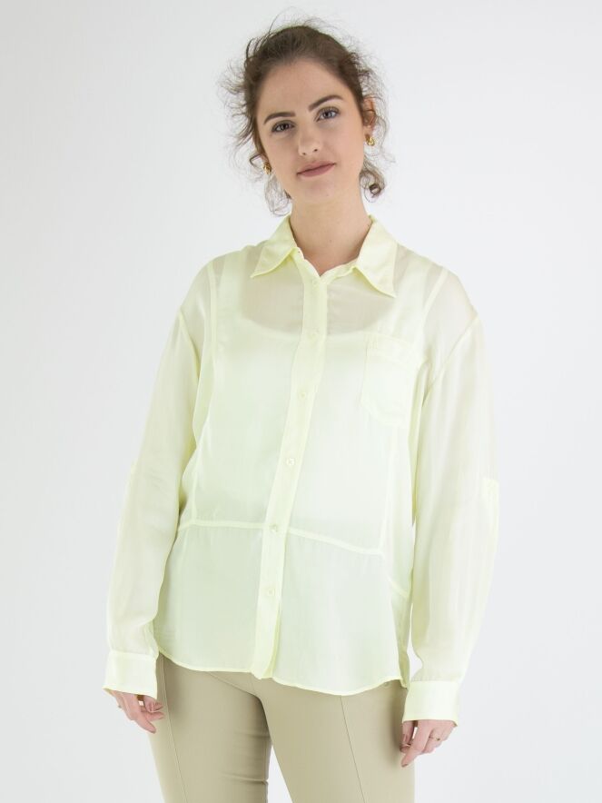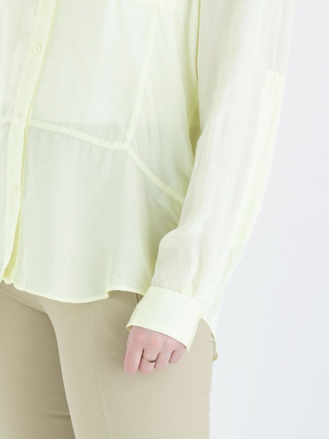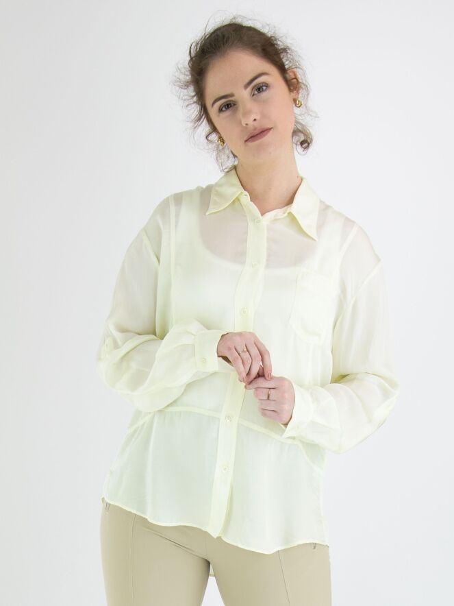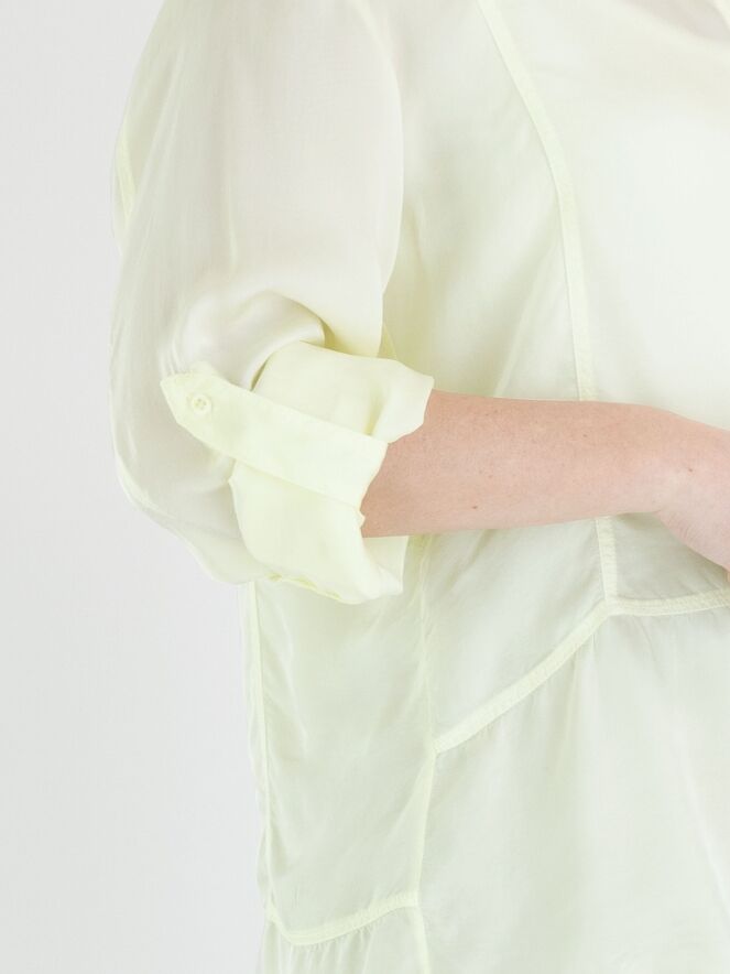 Un chemisier en satin mat de la marque High, de couleur jaune citron. La blouse est légèrement transparente et peut être lavée à la main.