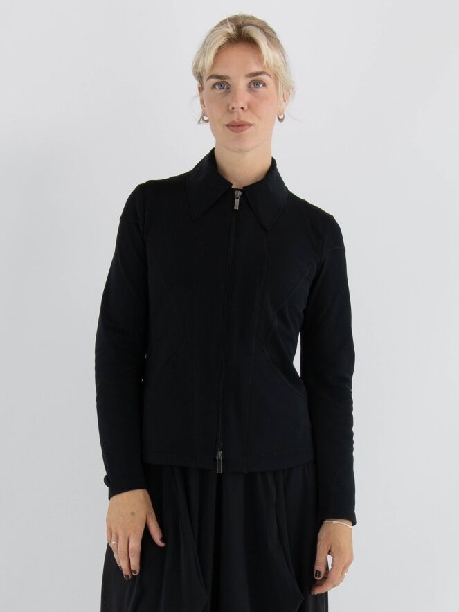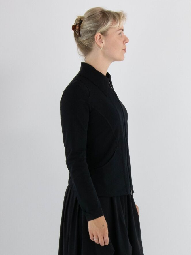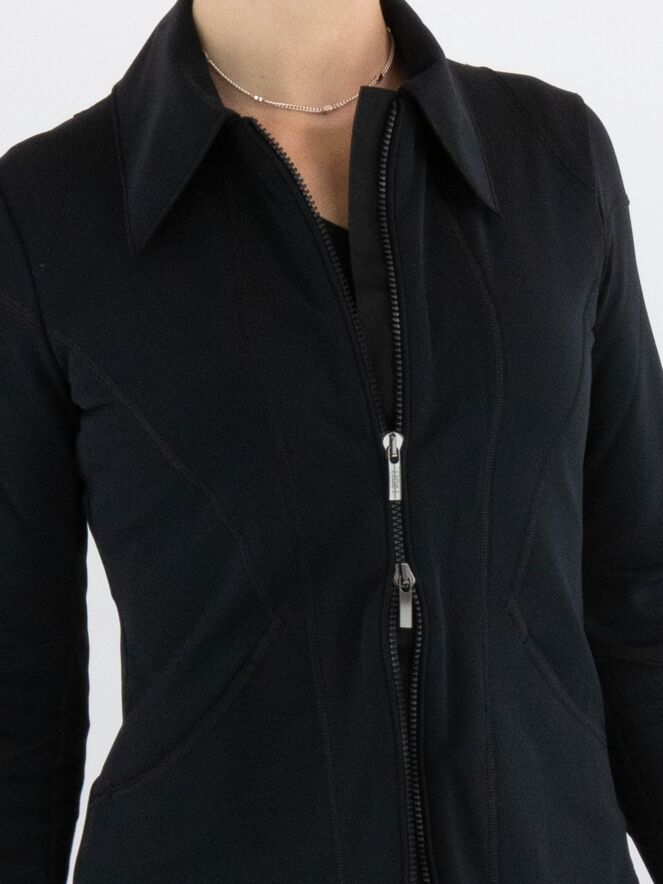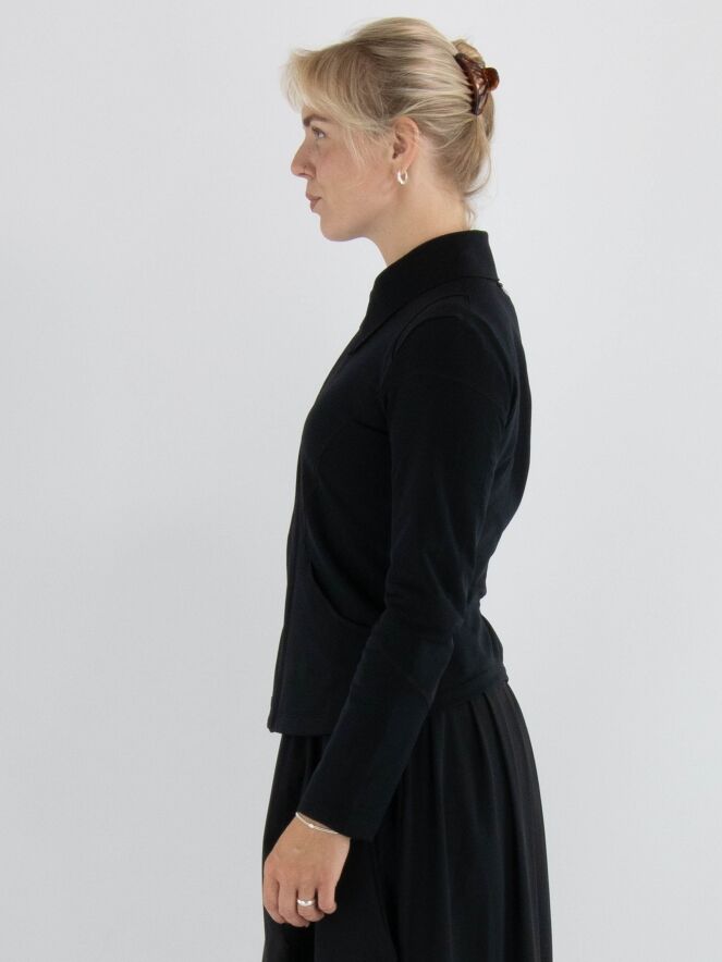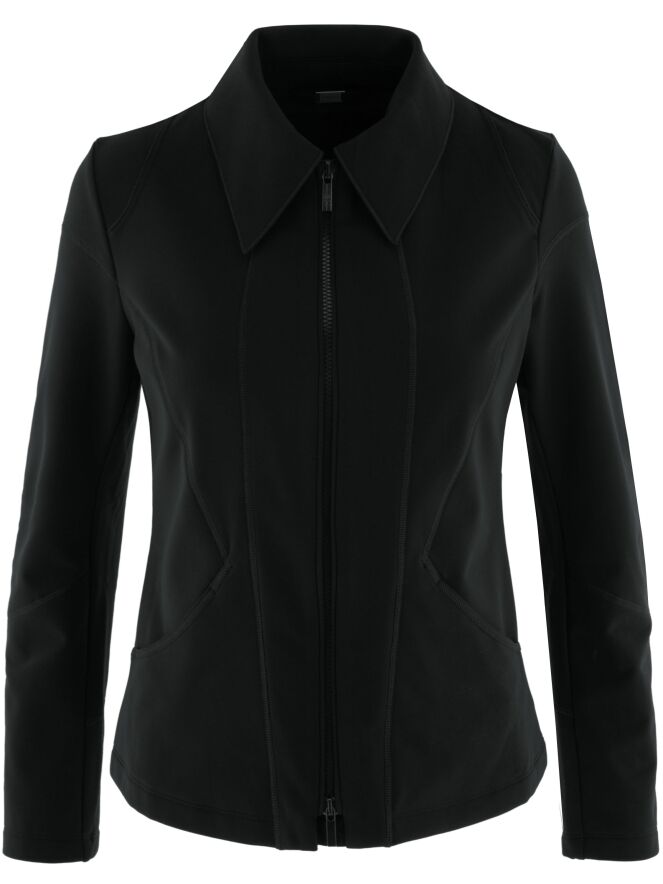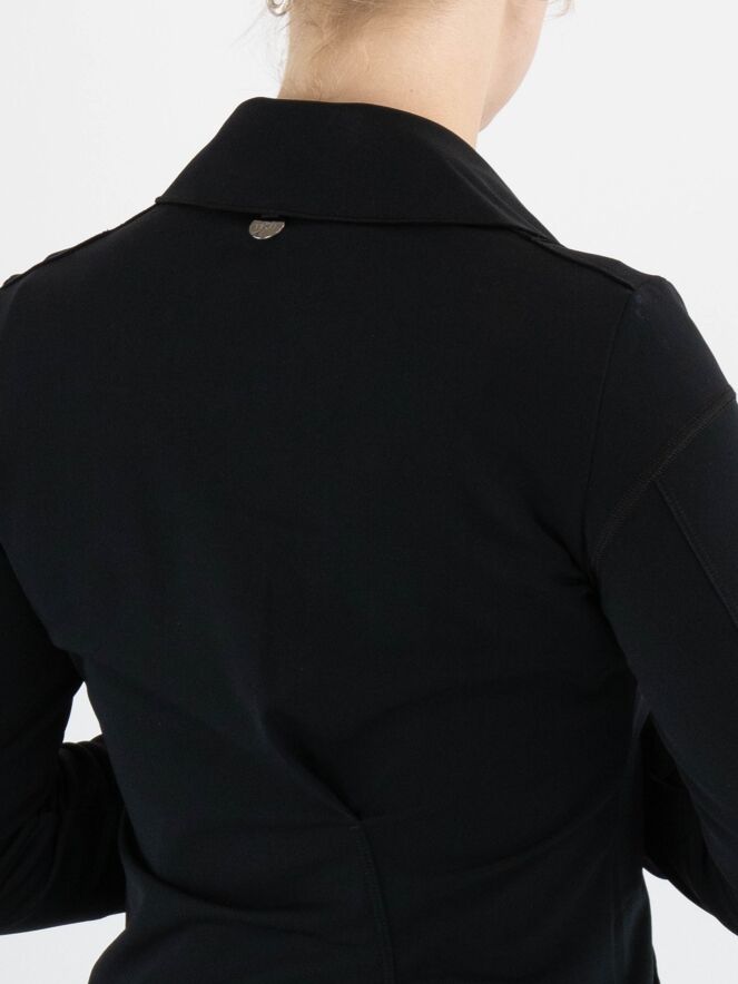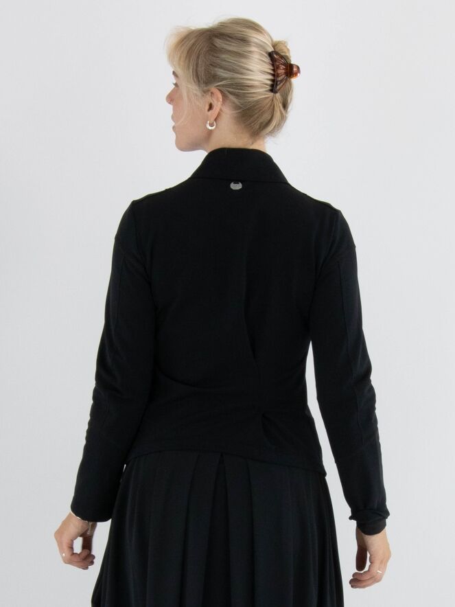 Blazer de la marque High en noir. Ce blazer présente plusieurs coutures décoratives et une fermeture zippée. À l’arrière, sur le côté droit de la taille, se trouve un pli plissé avec une couture diagonale. Ce blazer peut être lavé à 30 degrés.