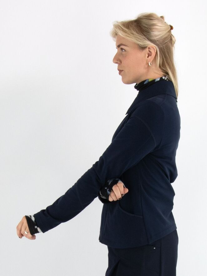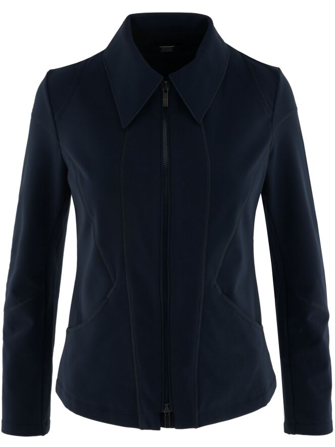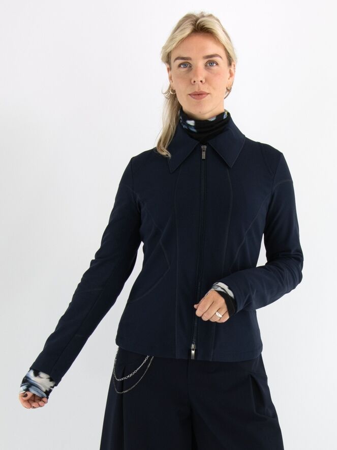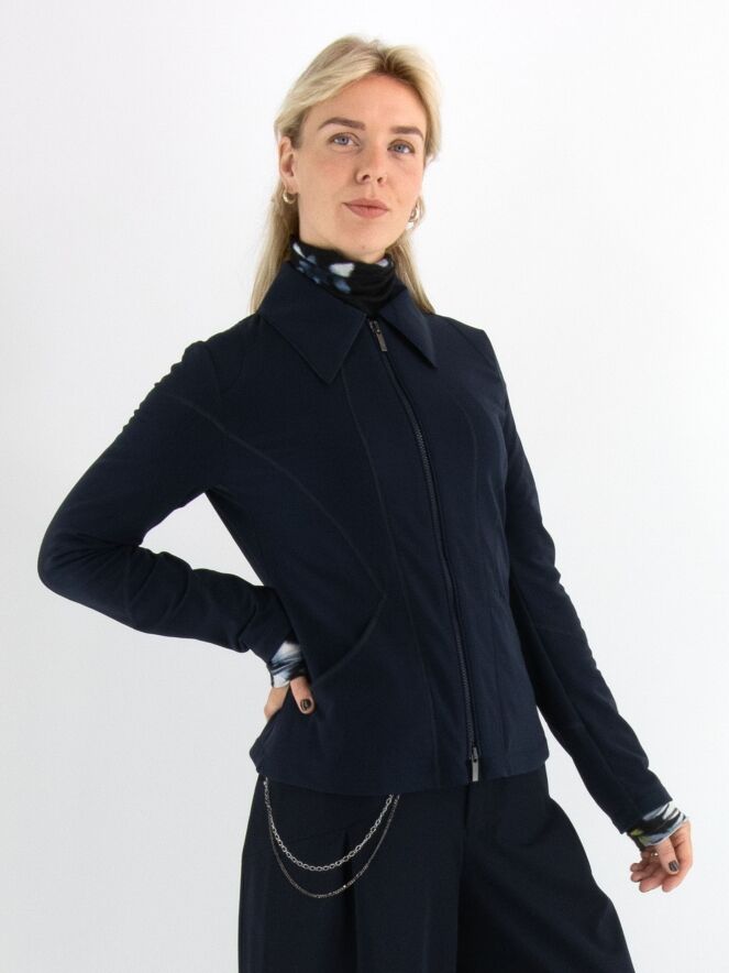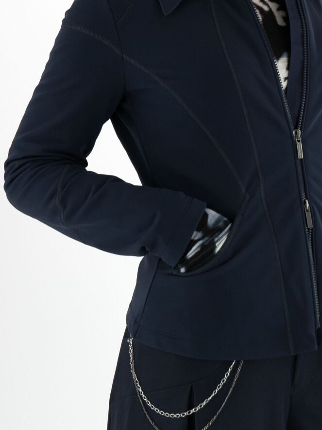 Une veste de la marque High en bleu marine. Elle présente plusieurs surpiqûres décoratives et une fermeture zippée. Au dos, légèrement à droite du centre au niveau de la taille, se trouve un pli plissé avec une couture en diagonale. Cette veste peut être lavée à 30 degrés.