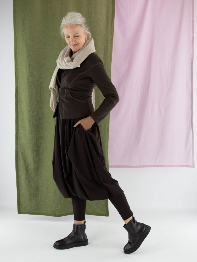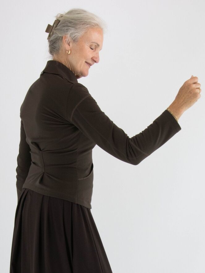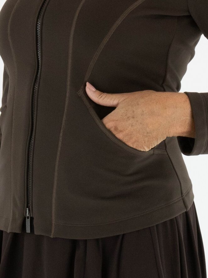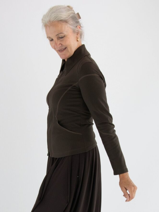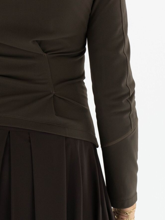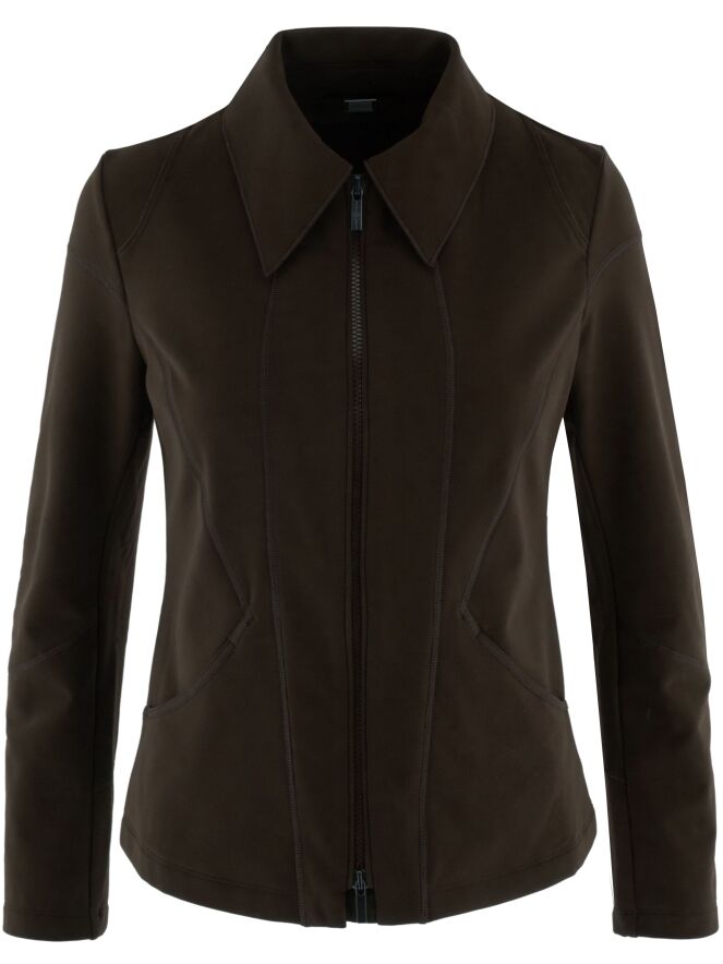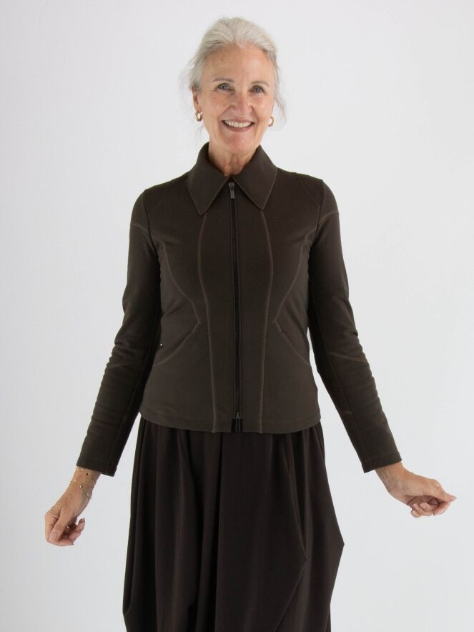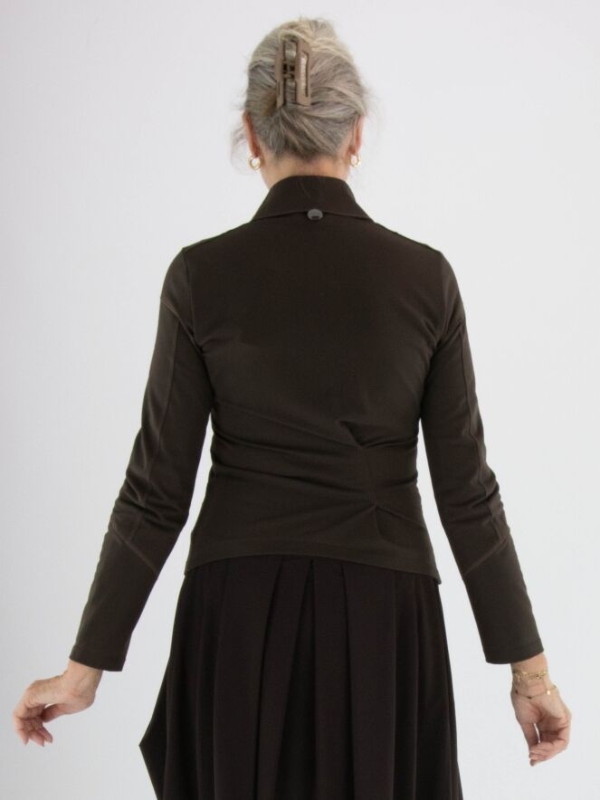 Blazer de la marque High en vert olive. Ce blazer présente plusieurs coutures décoratives et une fermeture zippée. À l’arrière, légèrement à droite de la taille, se trouve un pli plissé avec une couture en diagonale. Ce blazer peut être lavé à 30 degrés.