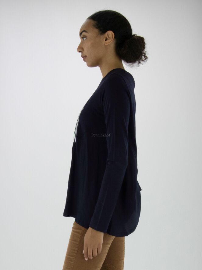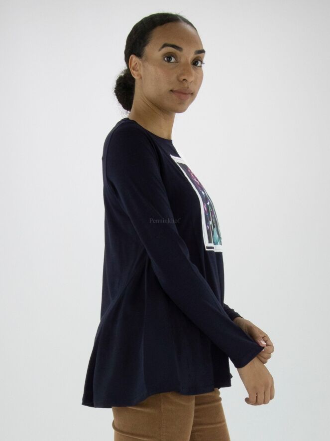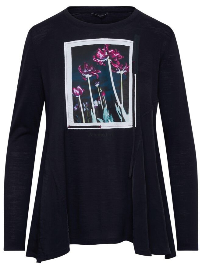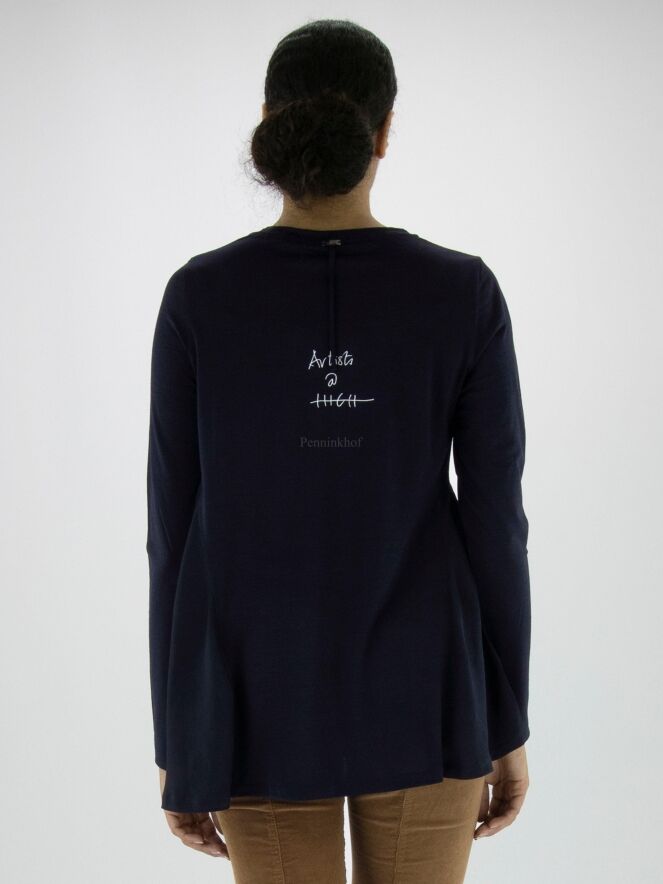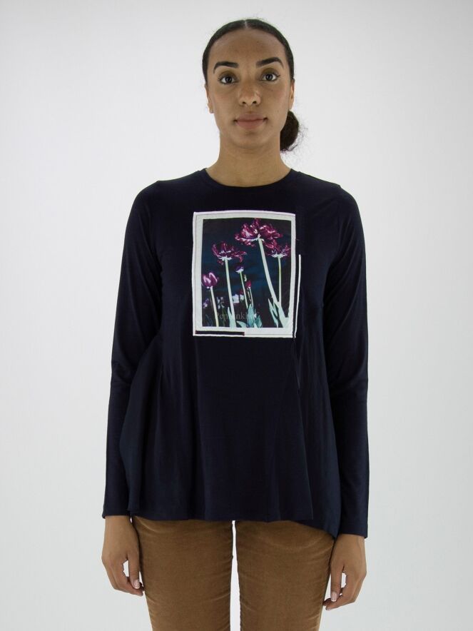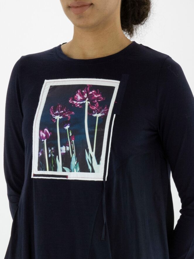 Un T shirt de High en bleu marine. Sur le devant figure une photo du photographe Enrico de Luigi. Le T - shirt a une ligne A et à partir de l'aisselle, les côtés sont dans un tissu satiné mat. Ce T - shirt peut être lavé à la main.