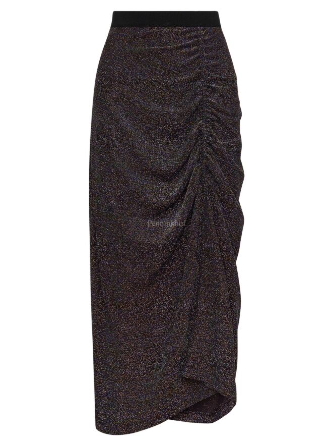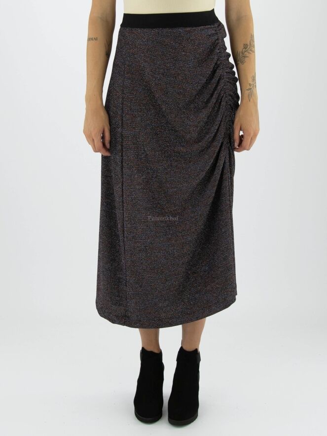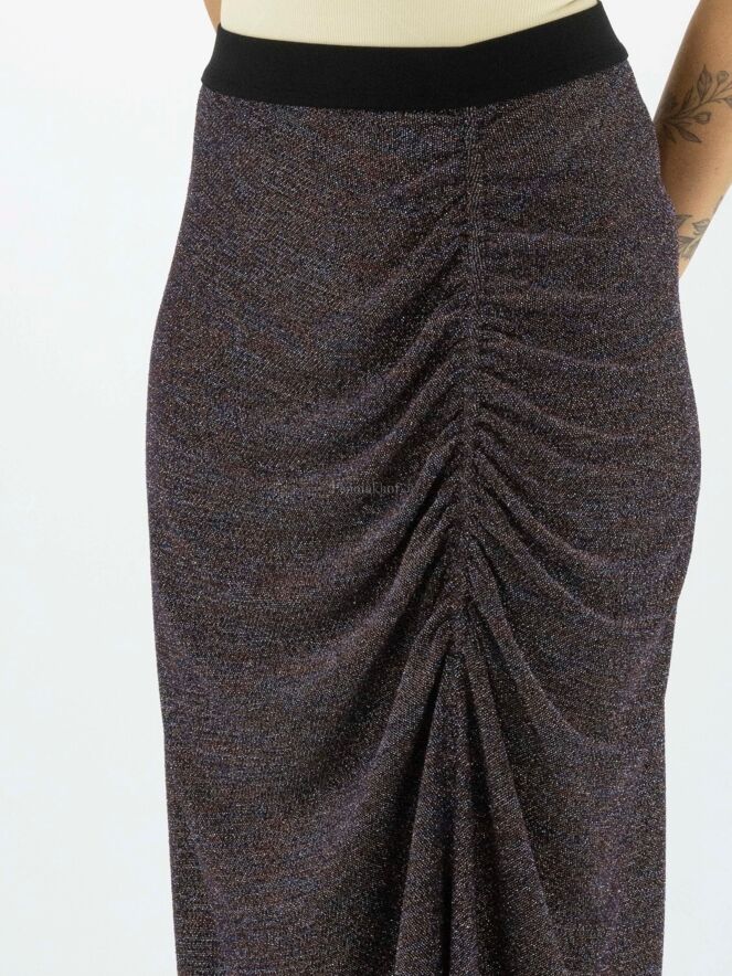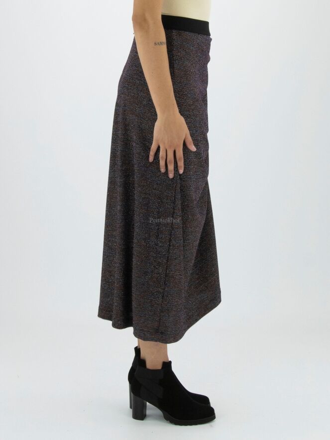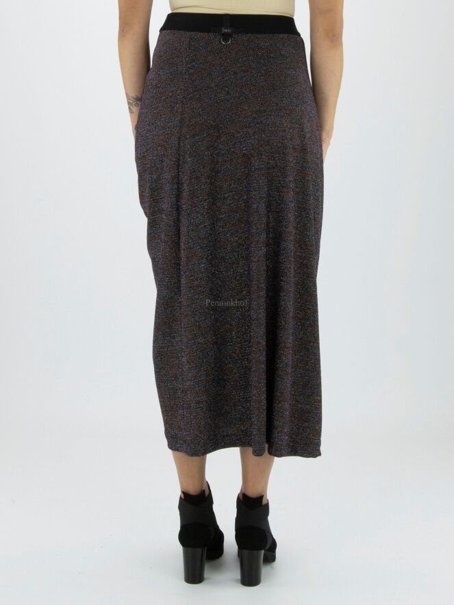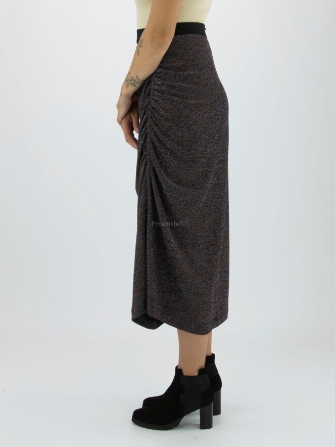 Jupe en lurex de la marque High, dont le tissu se décline en plusieurs couleurs, comme le bordeaux, le bleu, l'argent et le noir. La taille est élastiquée. Sur le devant, il y a une couture verticale au milieu, le long de laquelle le tissu est plissé, ce qui donne un effet de drapé. Cette jupe peut être lavée à la main.