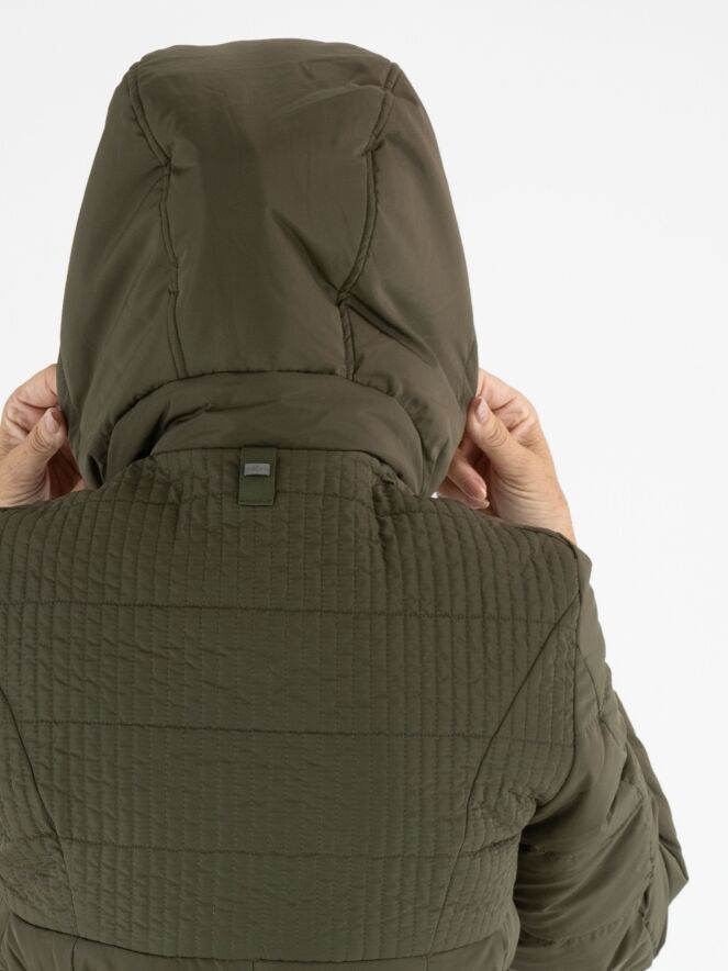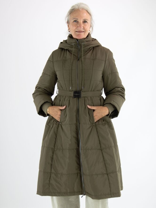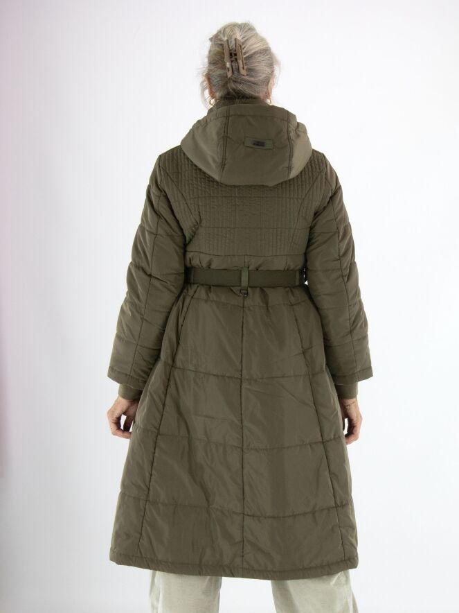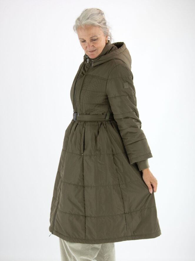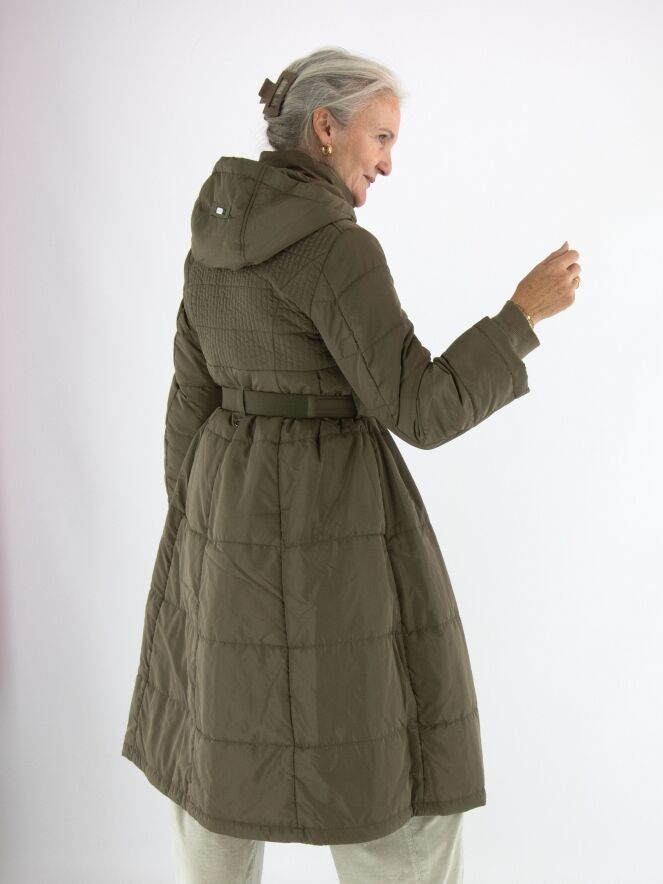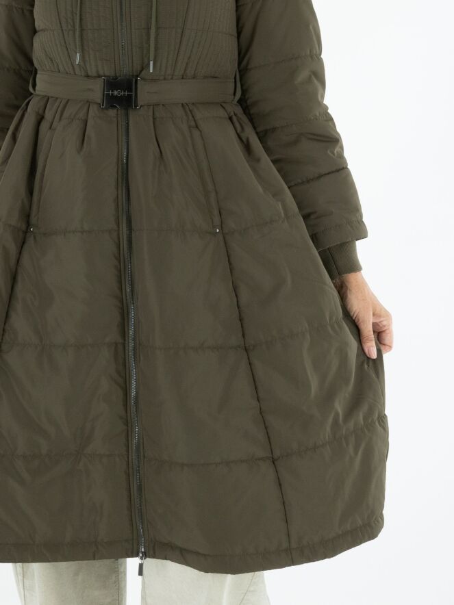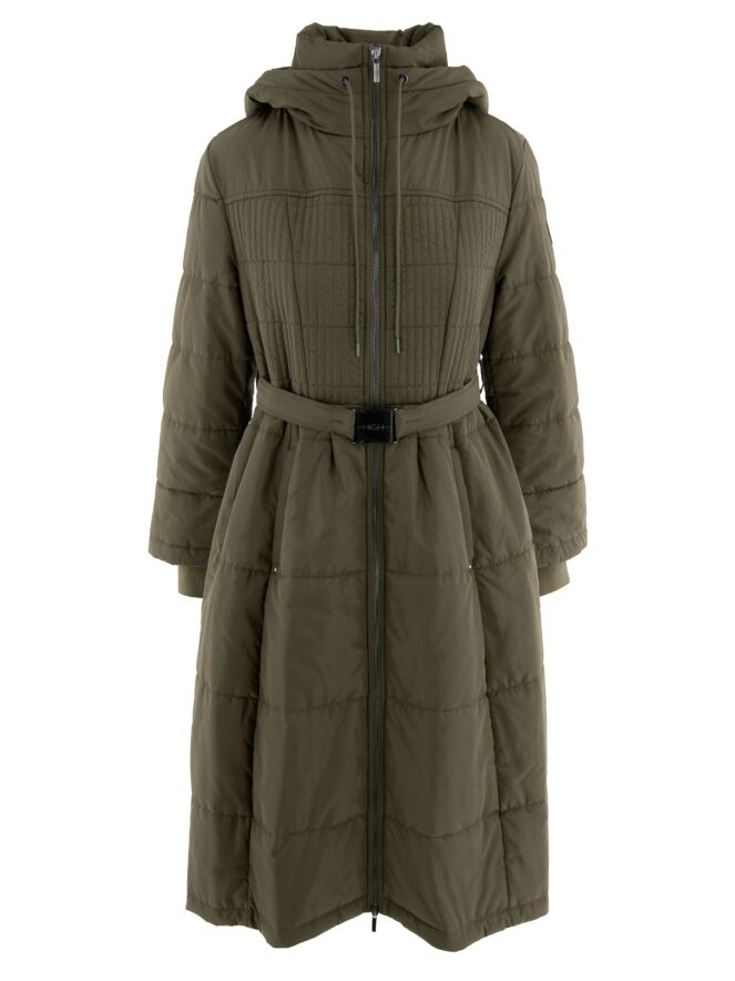 Manteau long de la marque High en vert olive. Un cordon est inséré dans un tunnel le long du bord de la capuche. À la taille, une ceinture avec une boucle couleur nickel structure la silhouette. De la poitrine à la taille, le tissu est cousu en motif smocké. Ce manteau est doté de poches latérales et peut être lavé à 30 degrés.