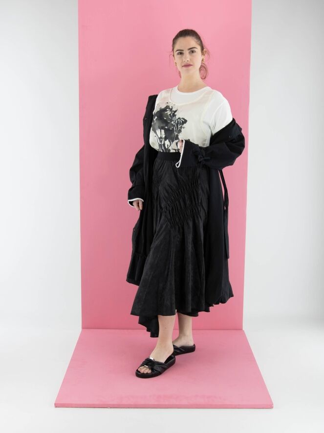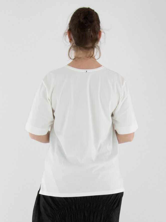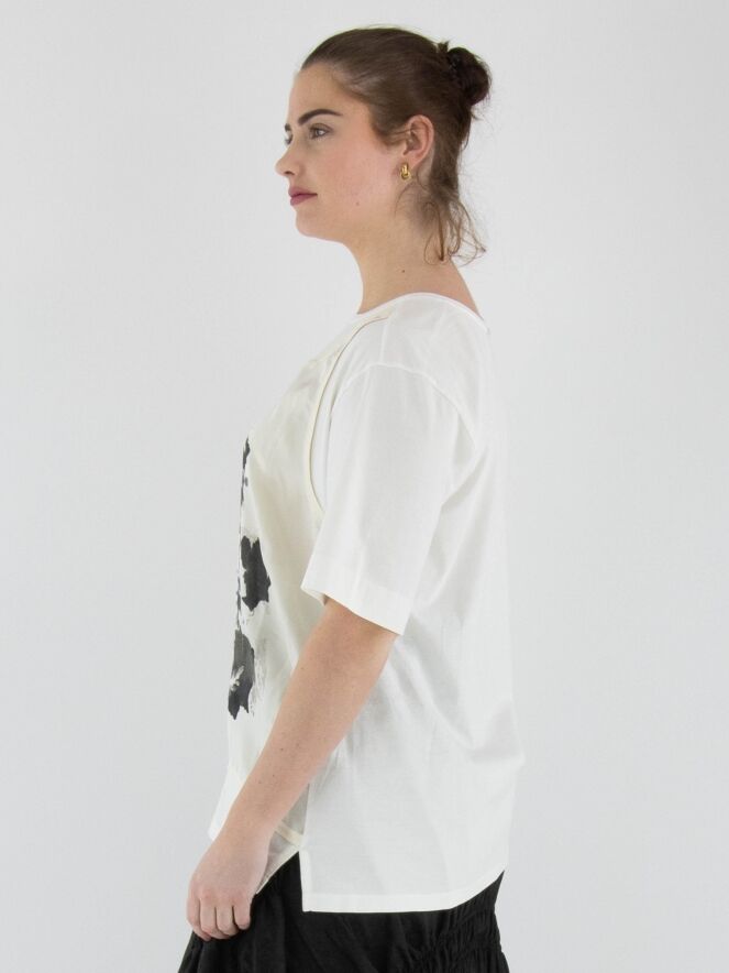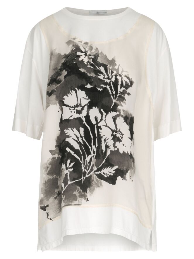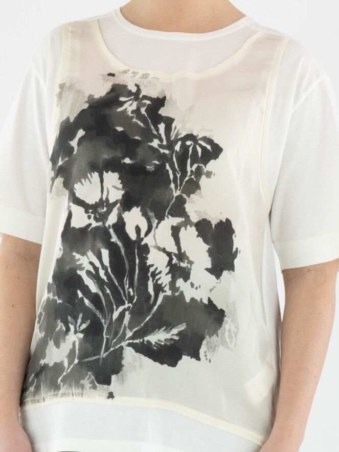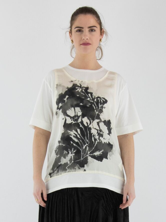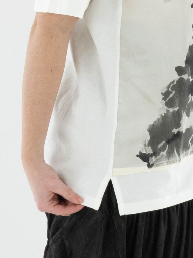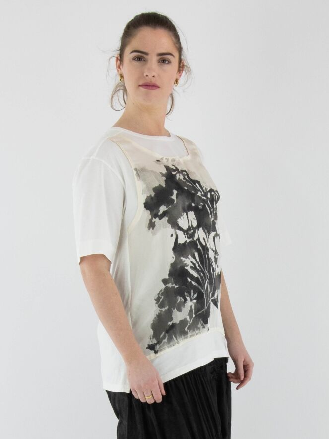 Un t-shirt de High avec un imprimé graphique dans plusieurs nuances de gris et de noir sur un fond blanc crème. L’arrière est en uni blanc crème. L’imprimé est appliqué sur un tissu en satin mat, en forme de débardeur, fixé sur le t-shirt. Ce t-shirt doit être lavé à la main.