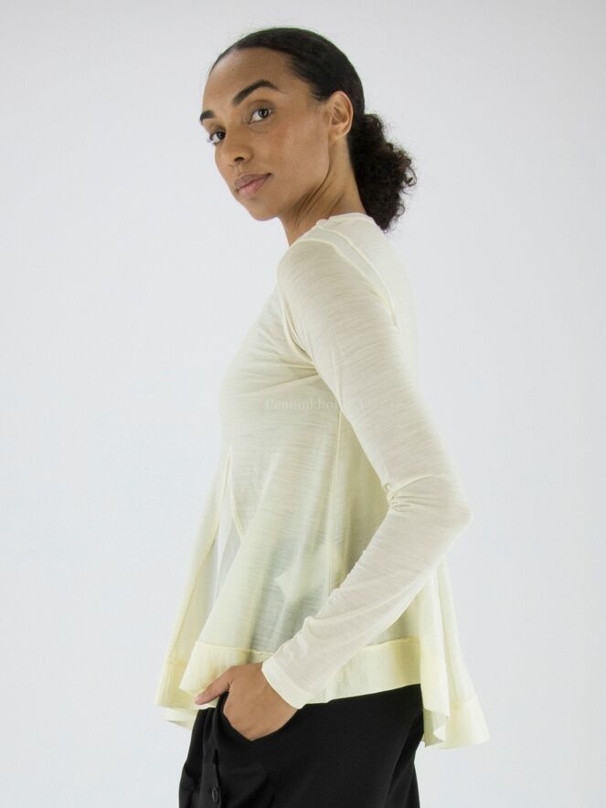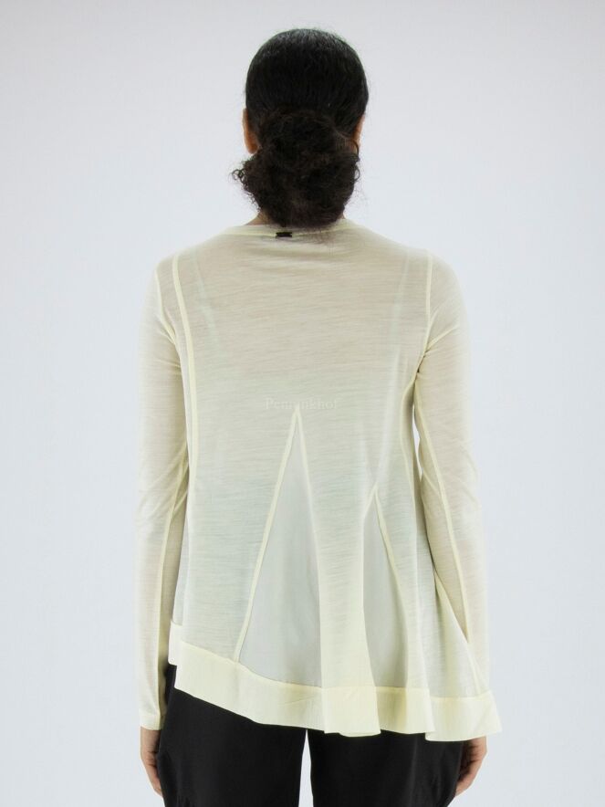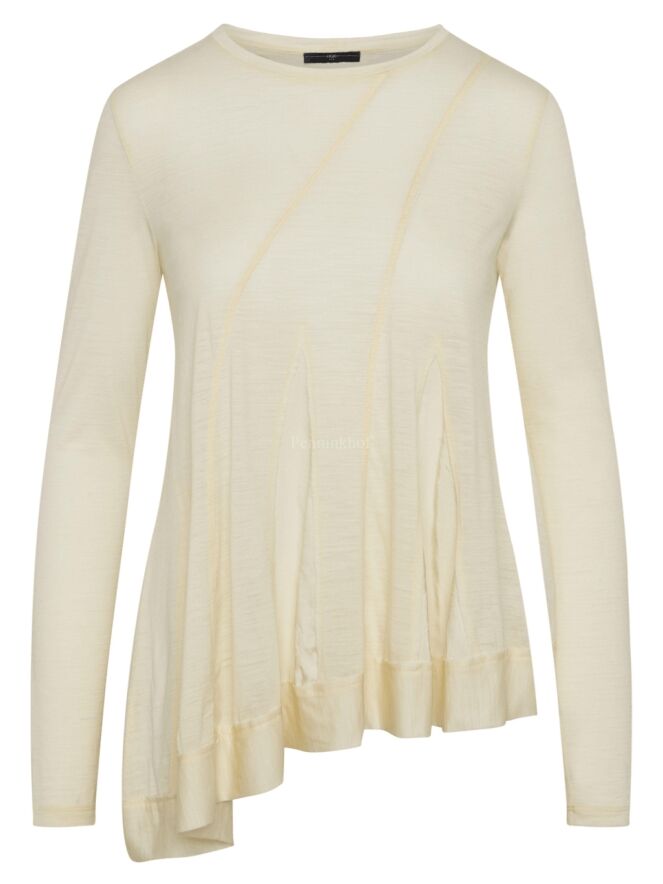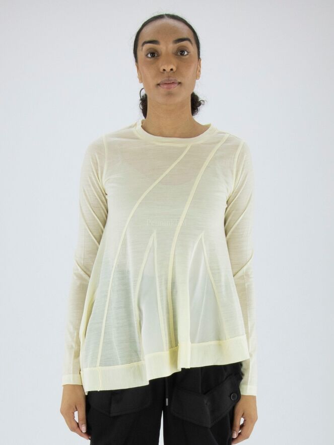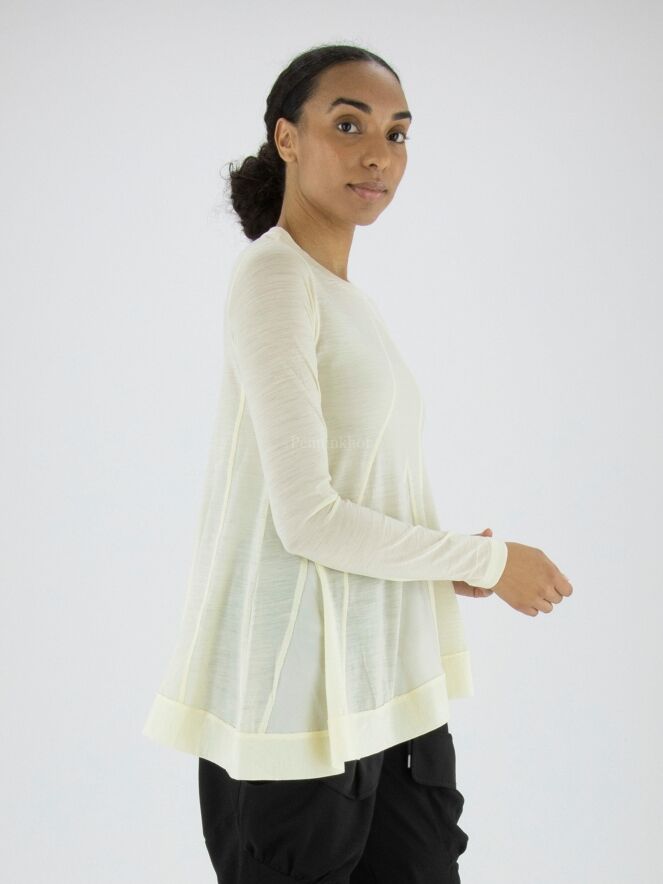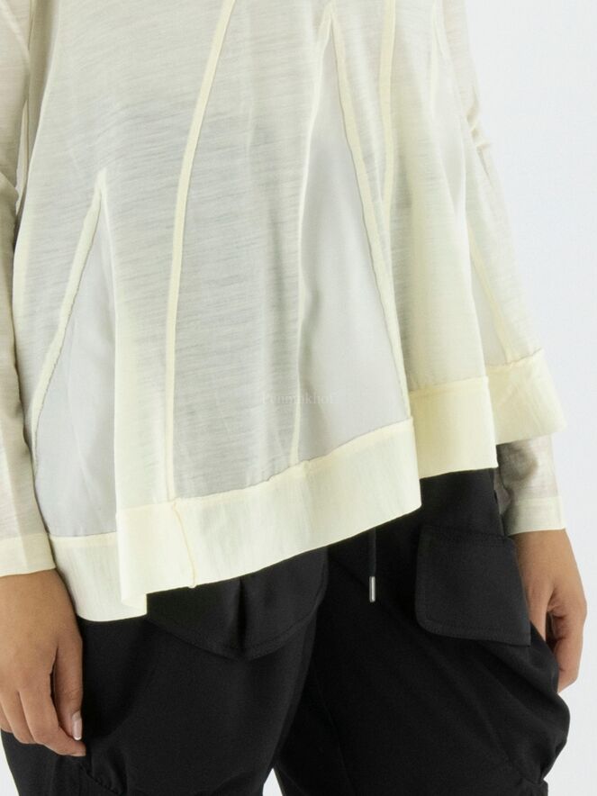 T shirt de High, de couleur blanc crème. Sur le devant, il y a des coutures en diagonale entre lesquelles se trouve un tissu satiné mat. Au bas de la chemise, une large bande est cousue. Cette T shirt peut être lavée à la main.