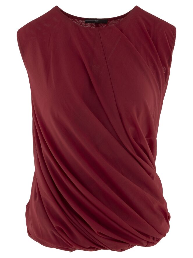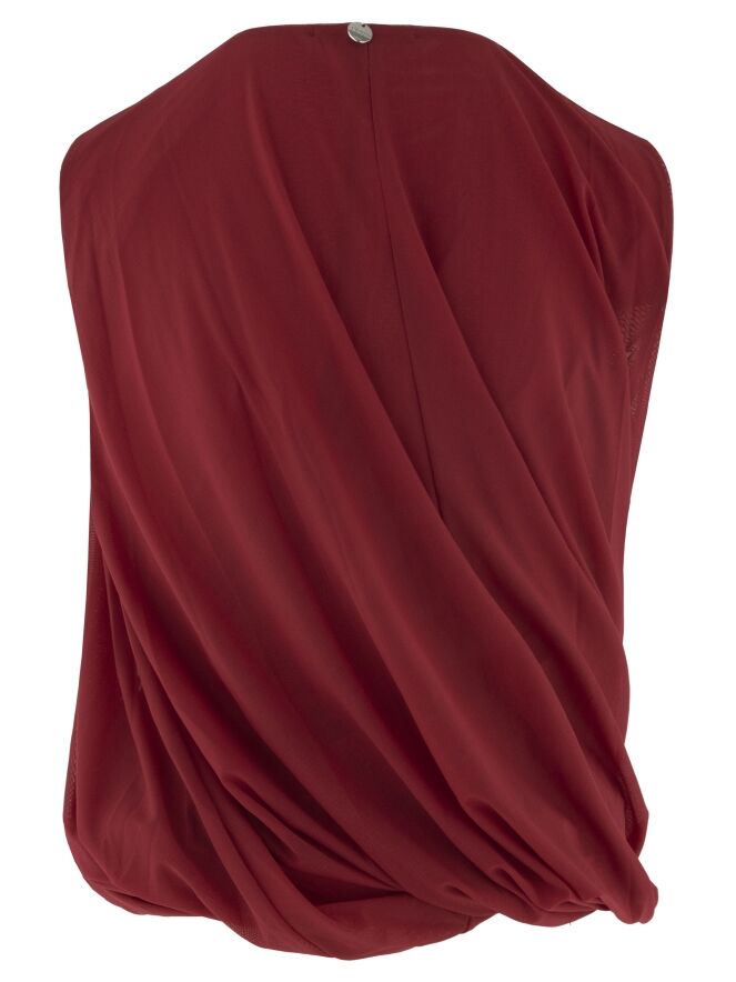 Un top de High en rouge framboise. Le modèle est réalisé dans un tissu double, torsadé à l’intérieur, créant un effet de drapé unique. Le top présente une encolure ronde et peut être lavé à la main.