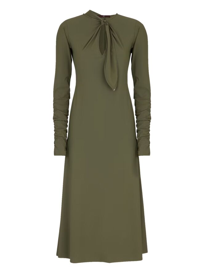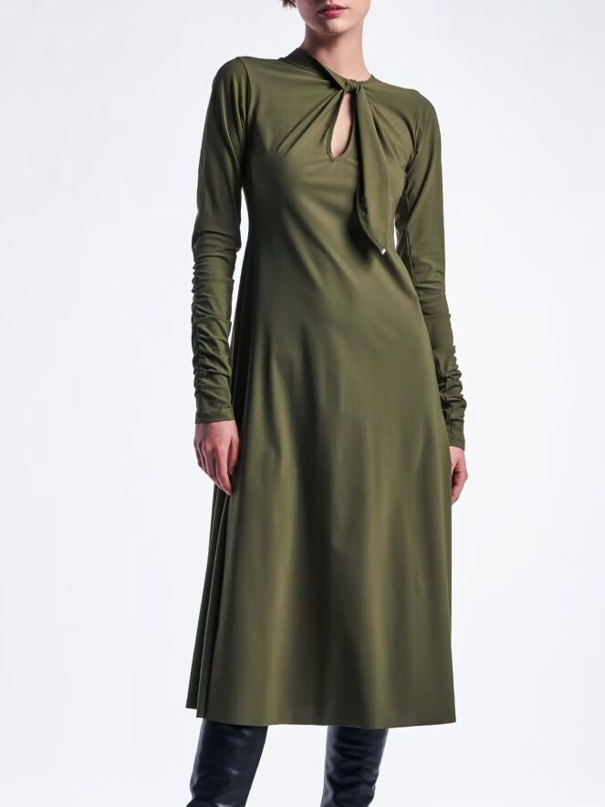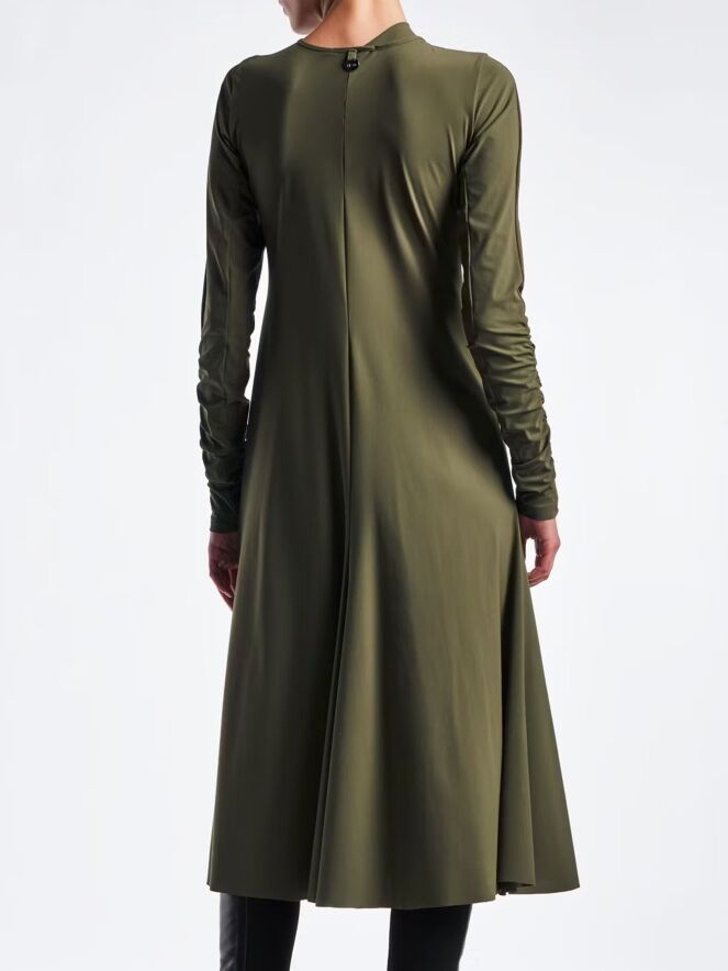 Une robe de High de couleur vert olive. Au centre du col rond haut, il y a un effet cache-cœur avec une ouverture jusqu'à la poitrine. Le tissu des manches longues est finement plissé le long de la couture à partir du coude. À partir de la taille, la robe a une légère forme en A. Cette robe peut être lavée à la main.
