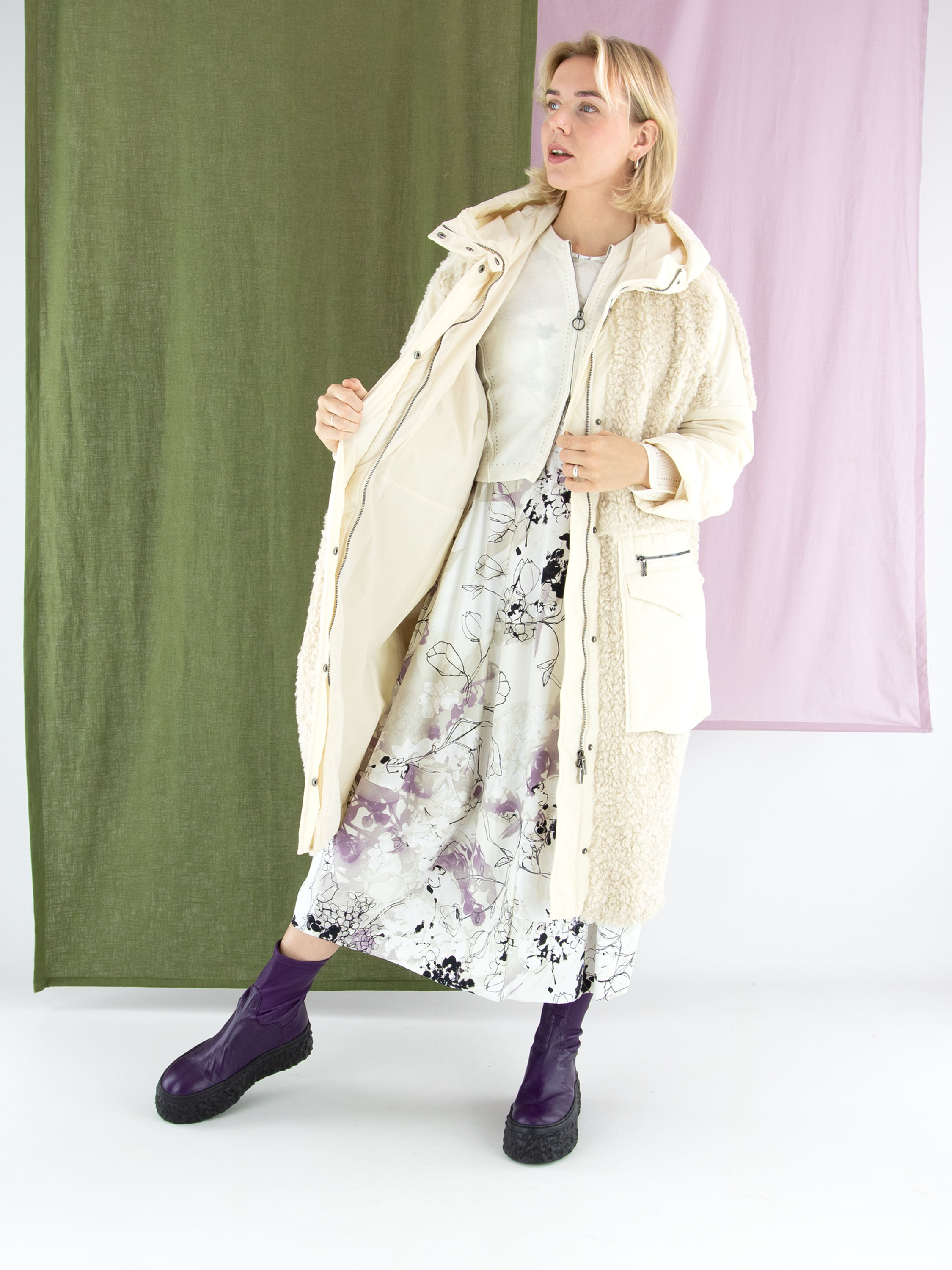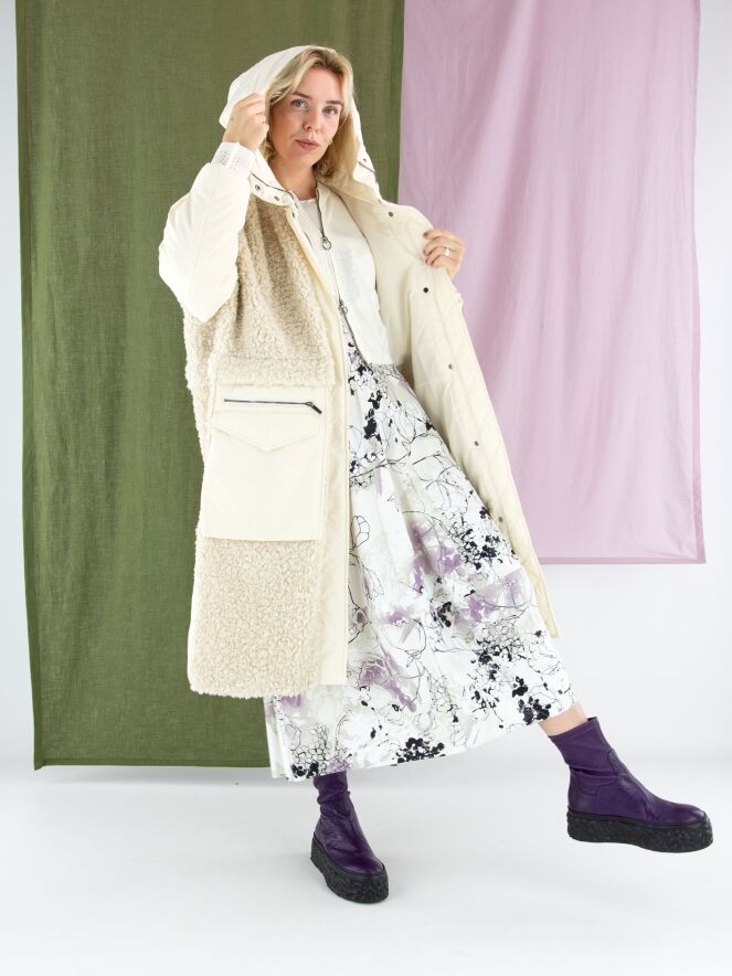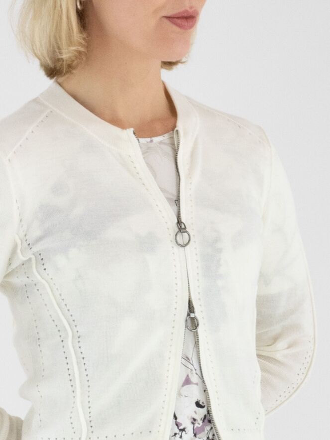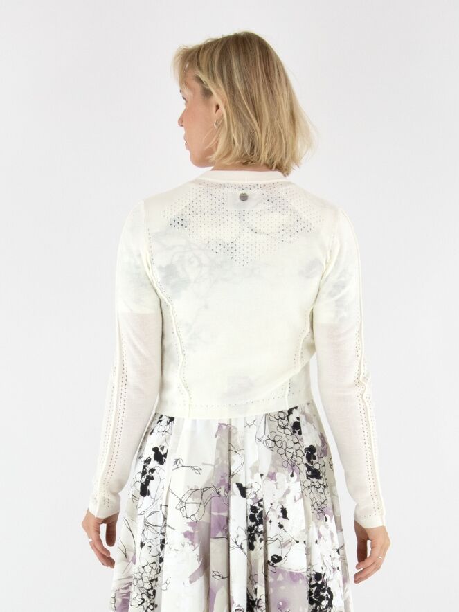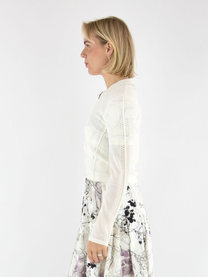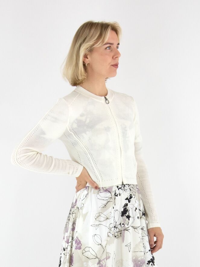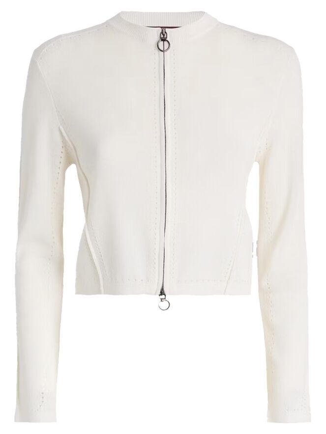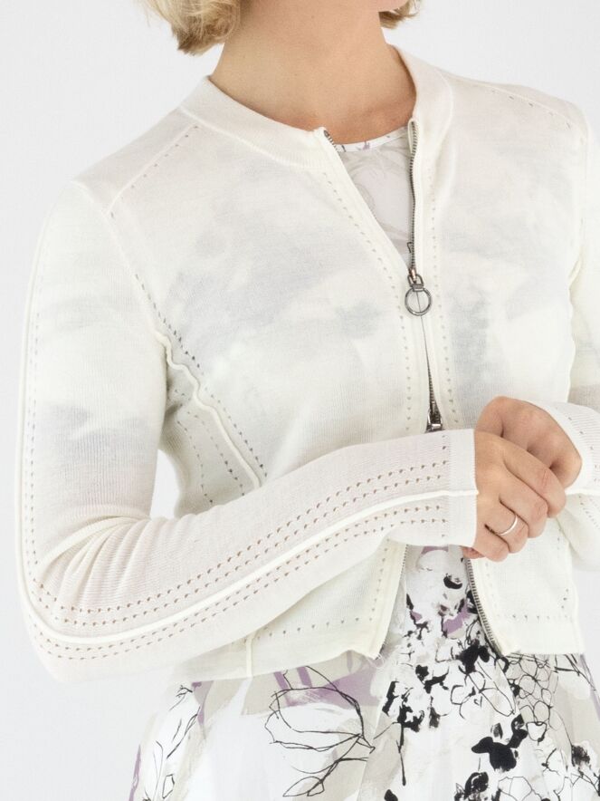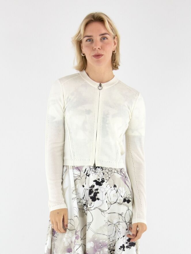 Un cardigan court de High en blanc cassé. Une bordure en maille finement côtelée souligne l’encolure ronde. Plusieurs lignes ajourées sont travaillées le long de la fermeture éclair, sur les côtés et sur les manches longues, apportant au modèle une allure raffinée et aérienne. Ce cardigan peut être lavé à la main.