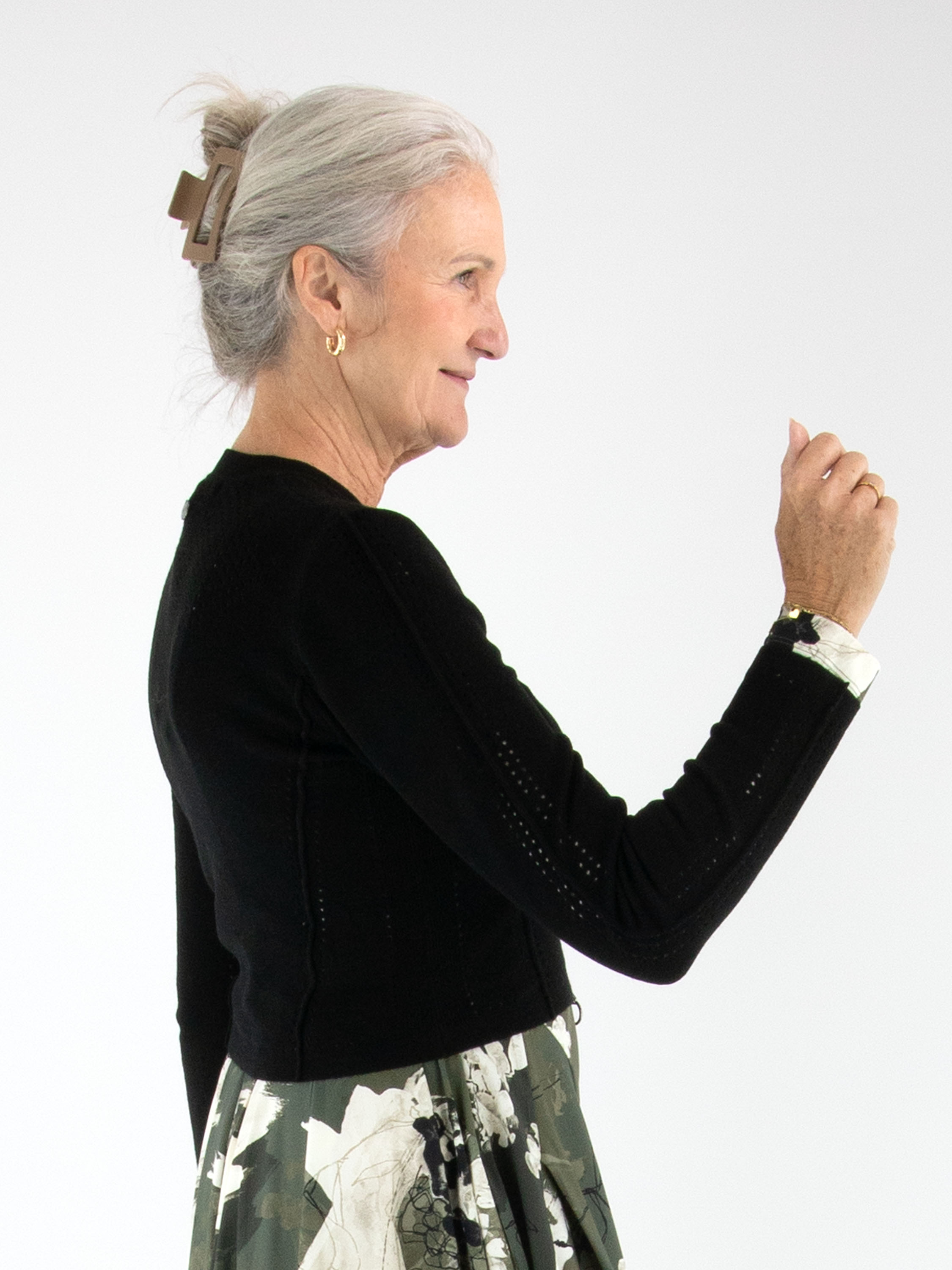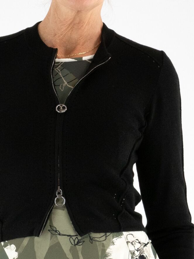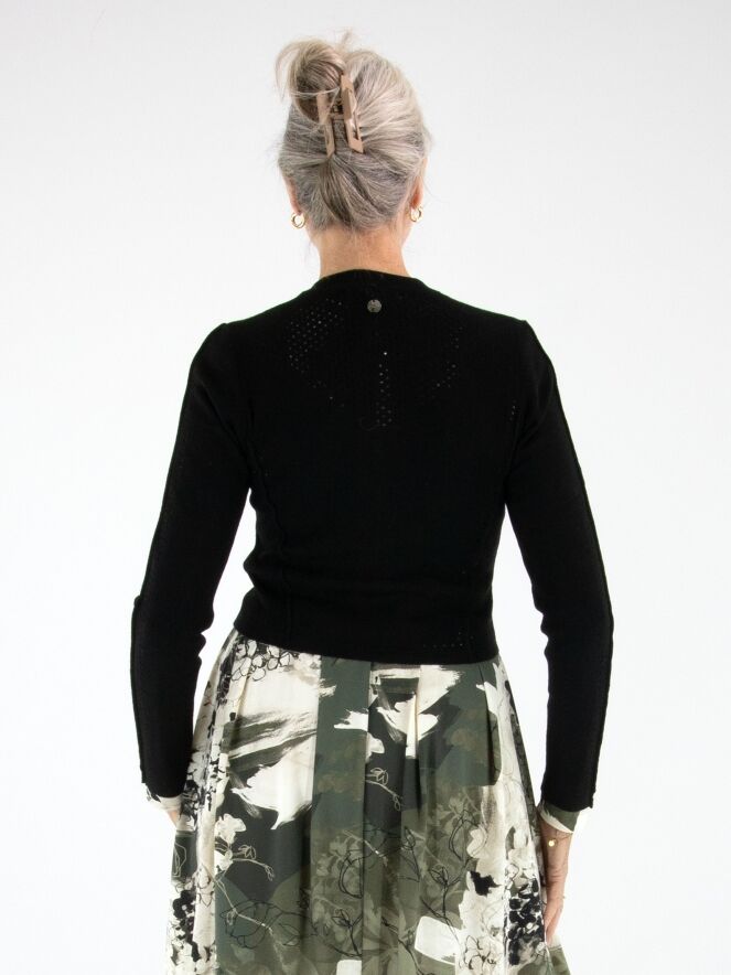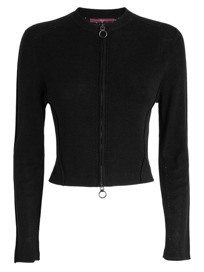 Un cardigan court de High en noir. L’encolure ronde est soulignée par une bordure en maille finement côtelée. Le long de la fermeture éclair, sur les côtés et sur les manches longues, se dessinent plusieurs lignes ajourées qui apportent une touche raffinée et moderne. Ce cardigan peut être lavé à la main.