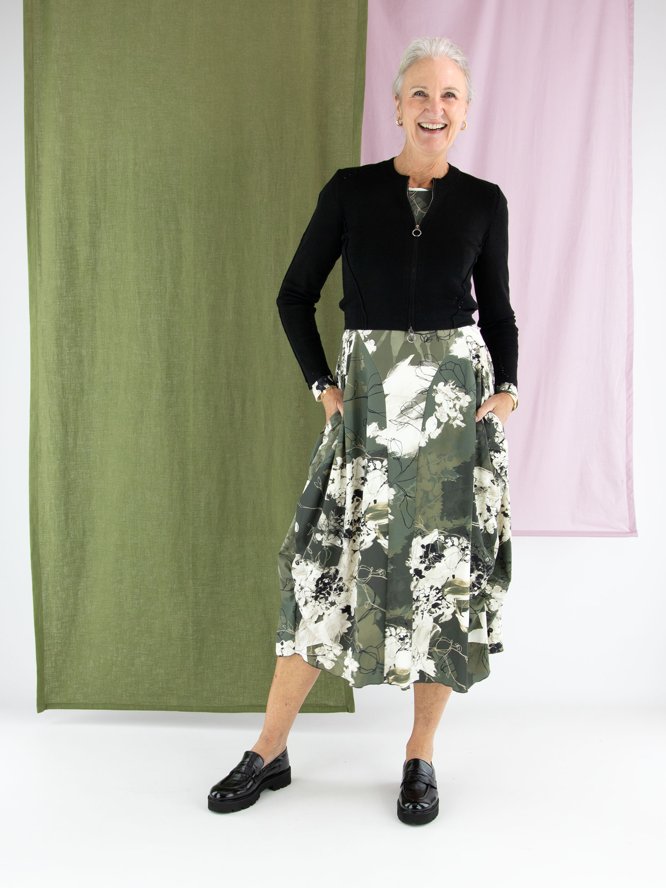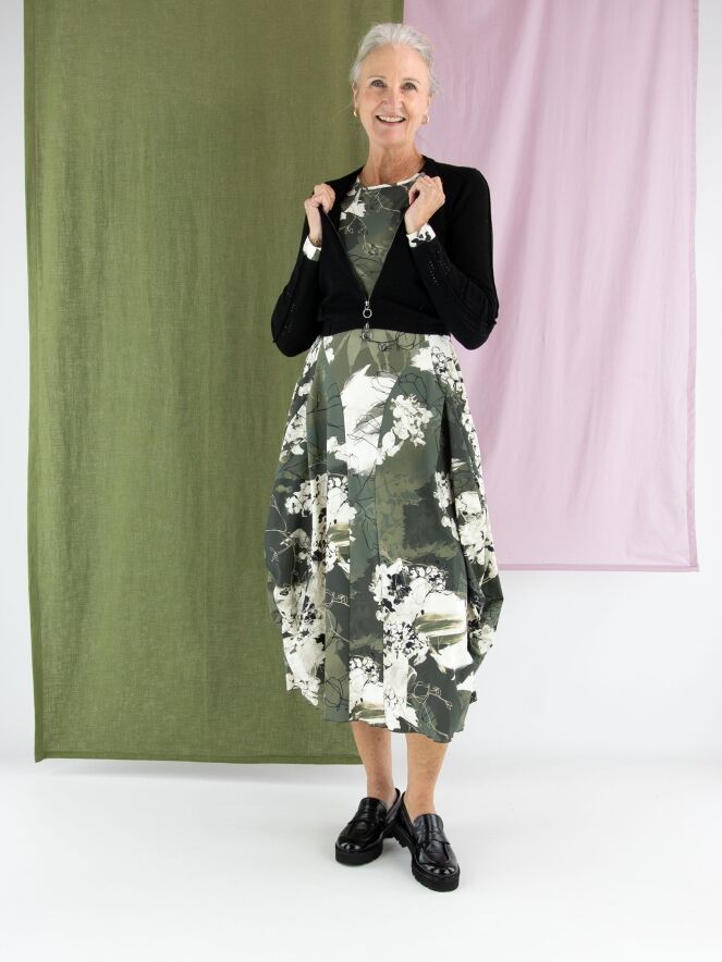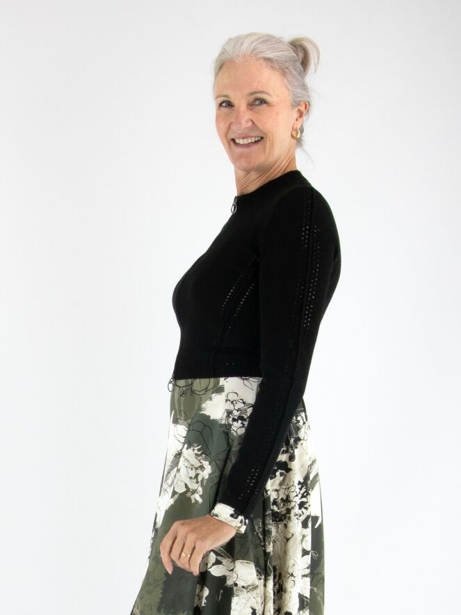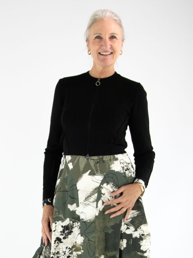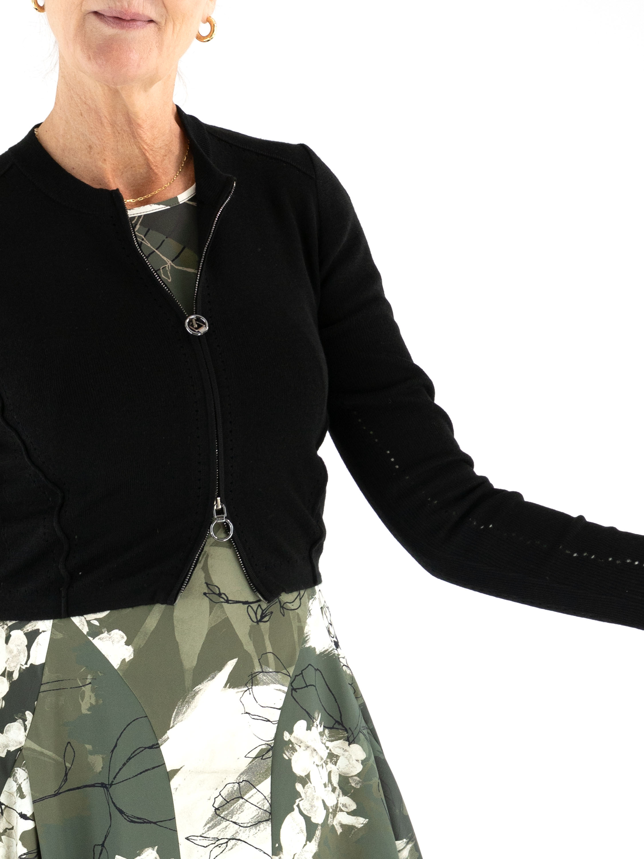 Un cardigan court de High en noir. L’encolure ronde est soulignée par une bordure en maille finement côtelée. Le long de la fermeture éclair, sur les côtés et sur les manches longues, se dessinent plusieurs lignes ajourées qui apportent une touche raffinée et moderne. Ce cardigan peut être lavé à la main.