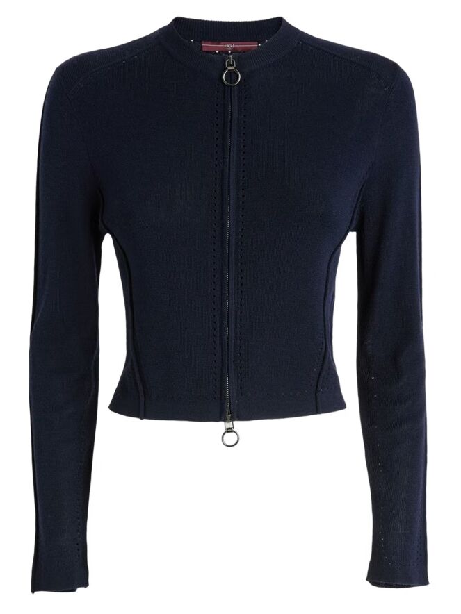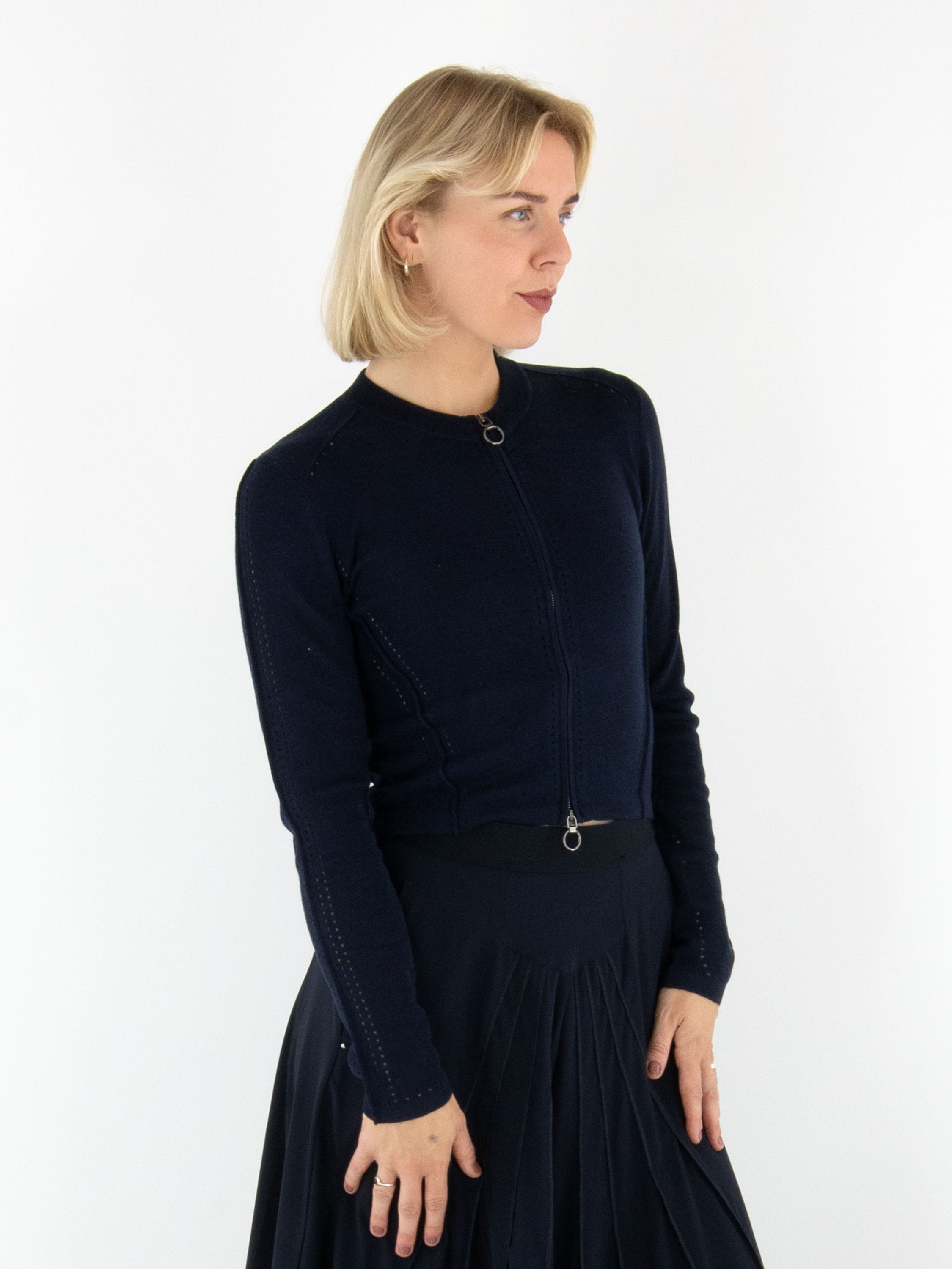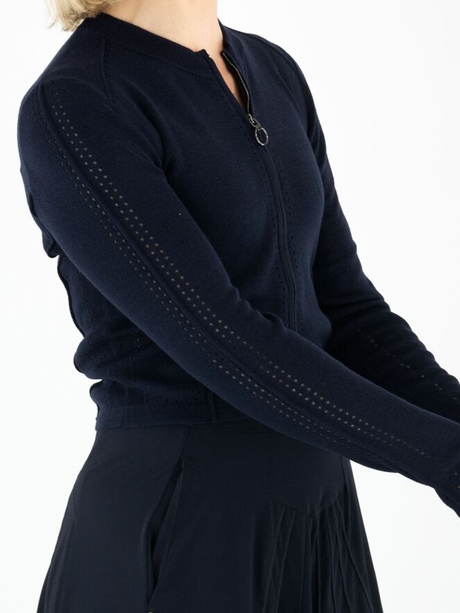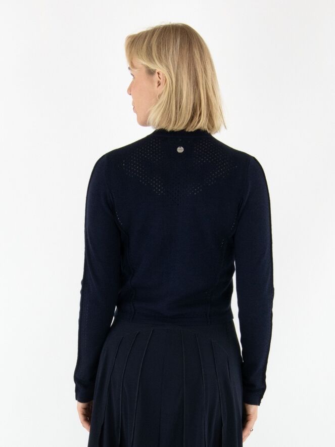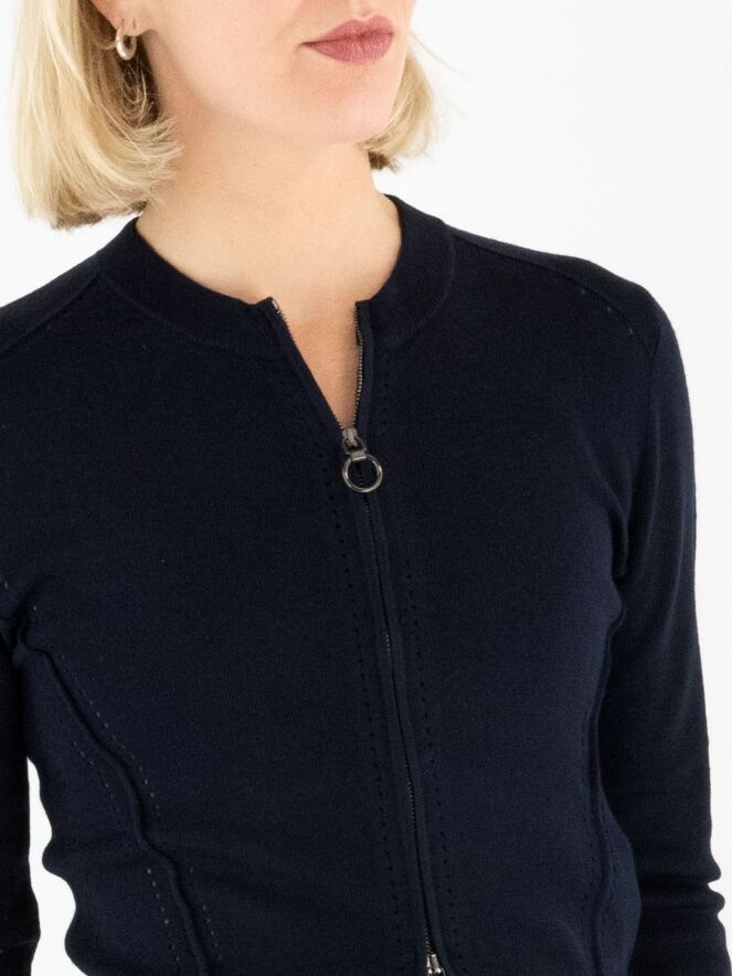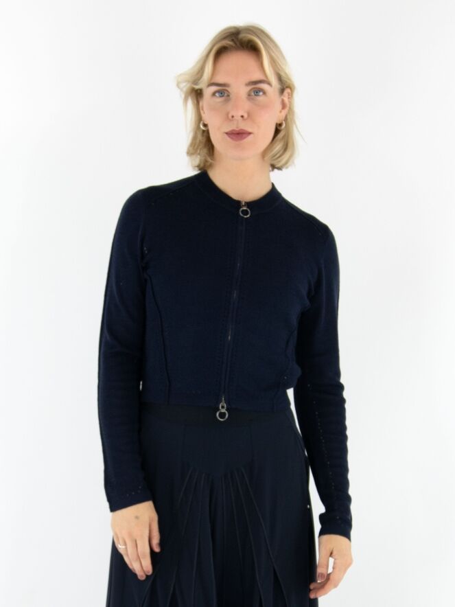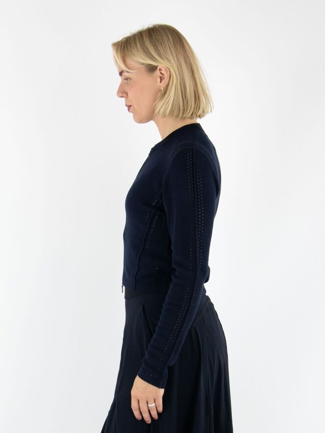 Un cardigan court de High en bleu marine. Une bordure en tricot finement côtelé souligne l’encolure ronde. Des lignes ajourées parcourent la fermeture éclair, les côtés et les manches longues, conférant au modèle une allure raffinée et moderne. Ce cardigan peut être lavé à la main.