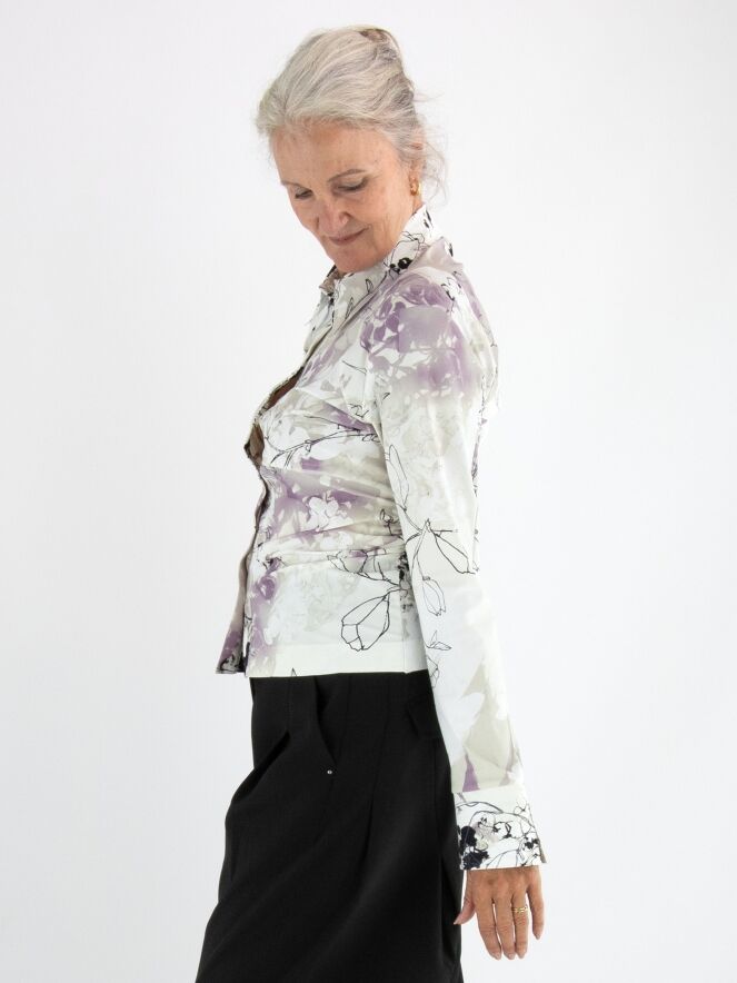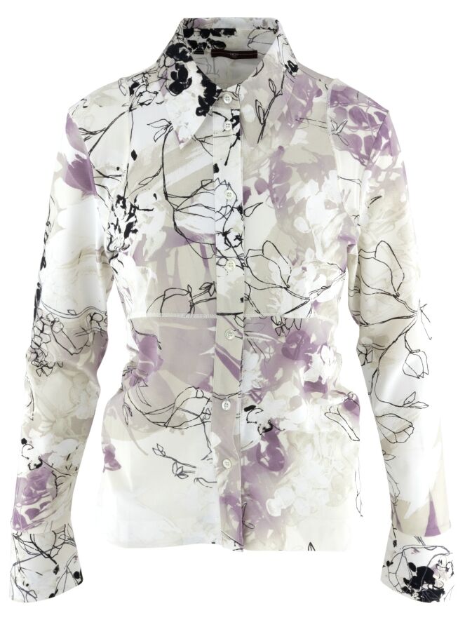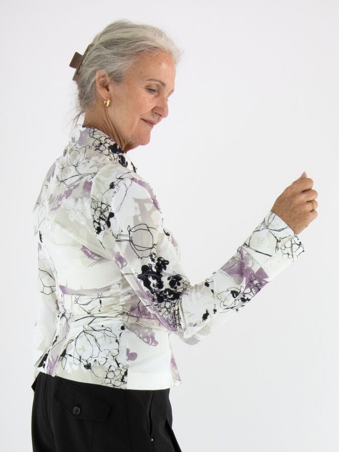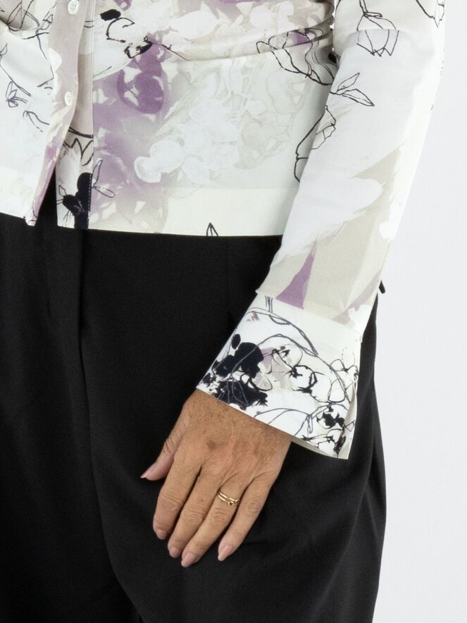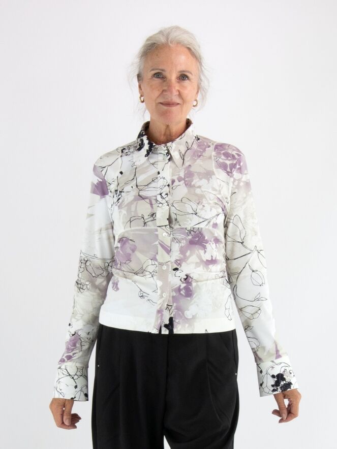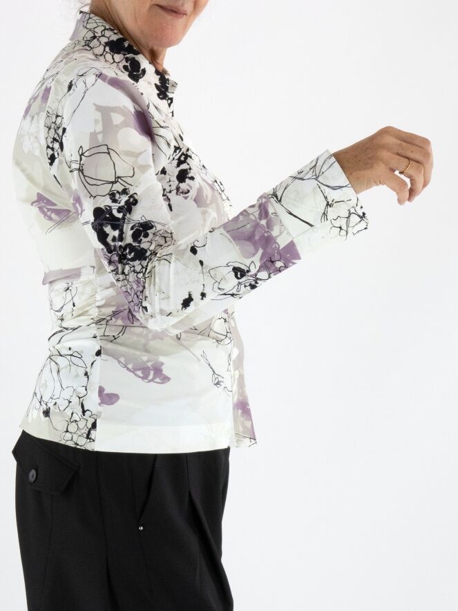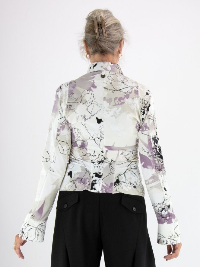 Blouse de la marque High avec un imprimé floral graphique dans les tons lilas, beige et noir sur un fond blanc cassé. Le tissu est smocké le long des coutures latérales. Cette blouse doit être lavée à la main.